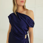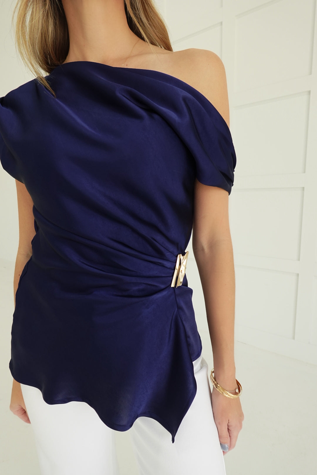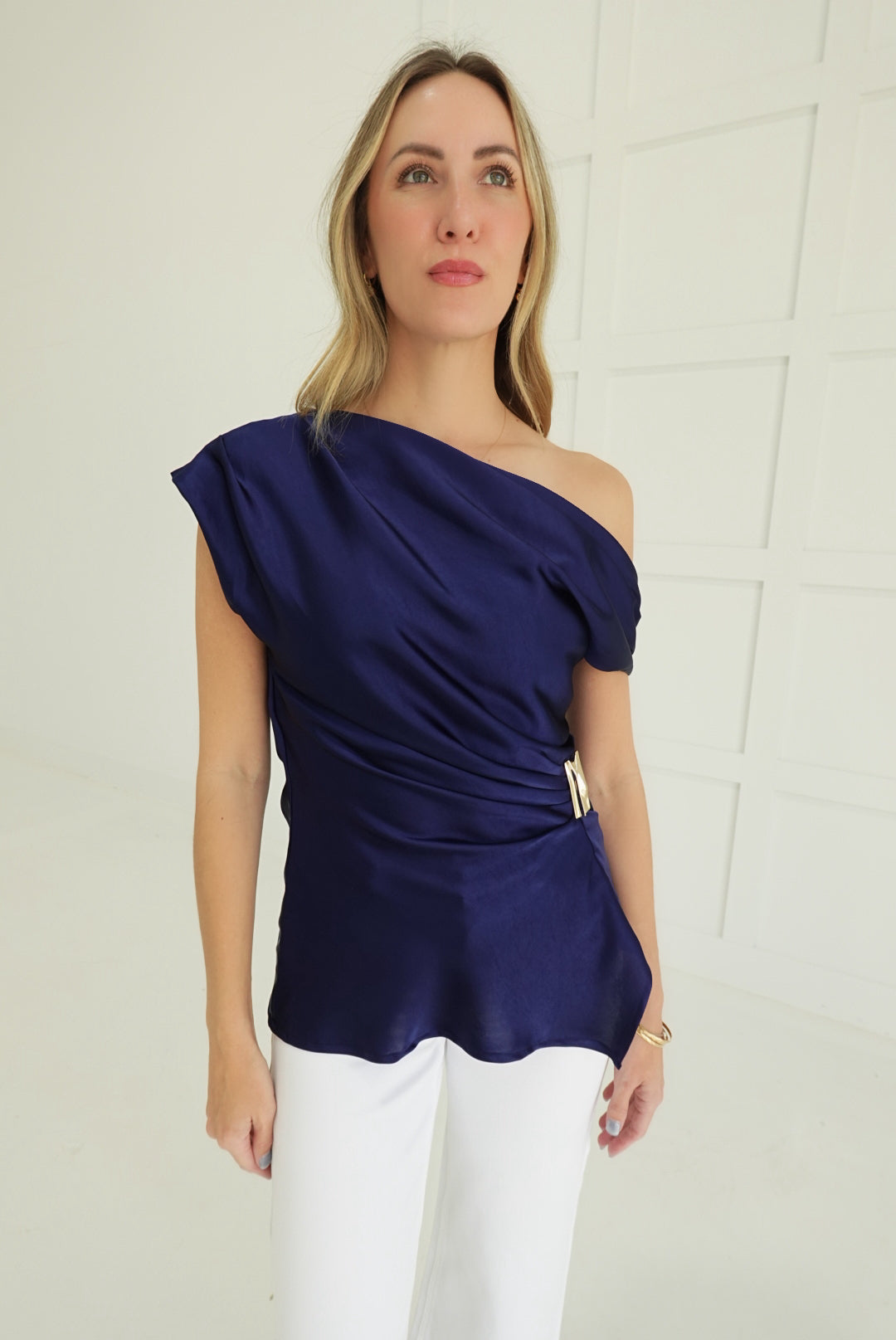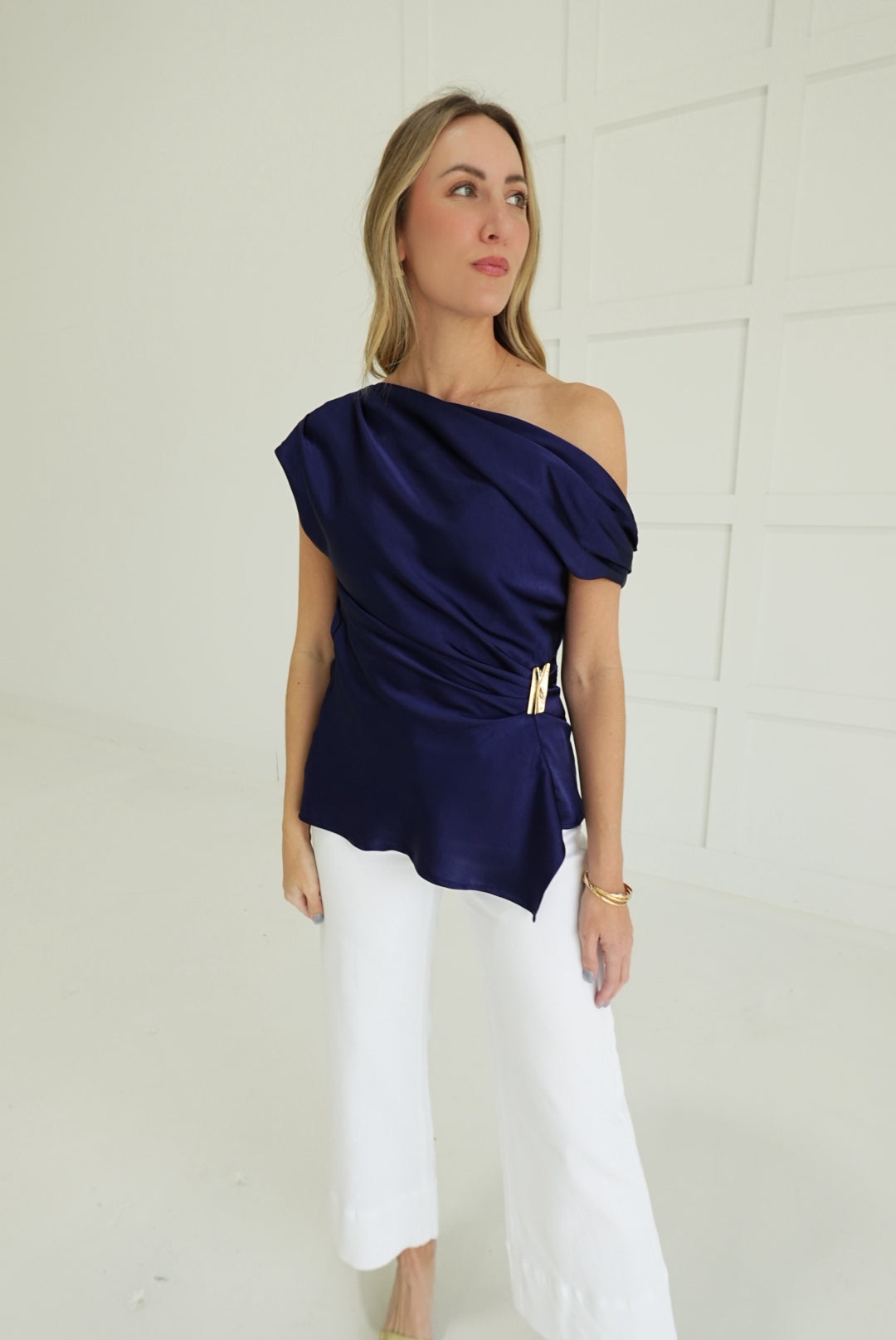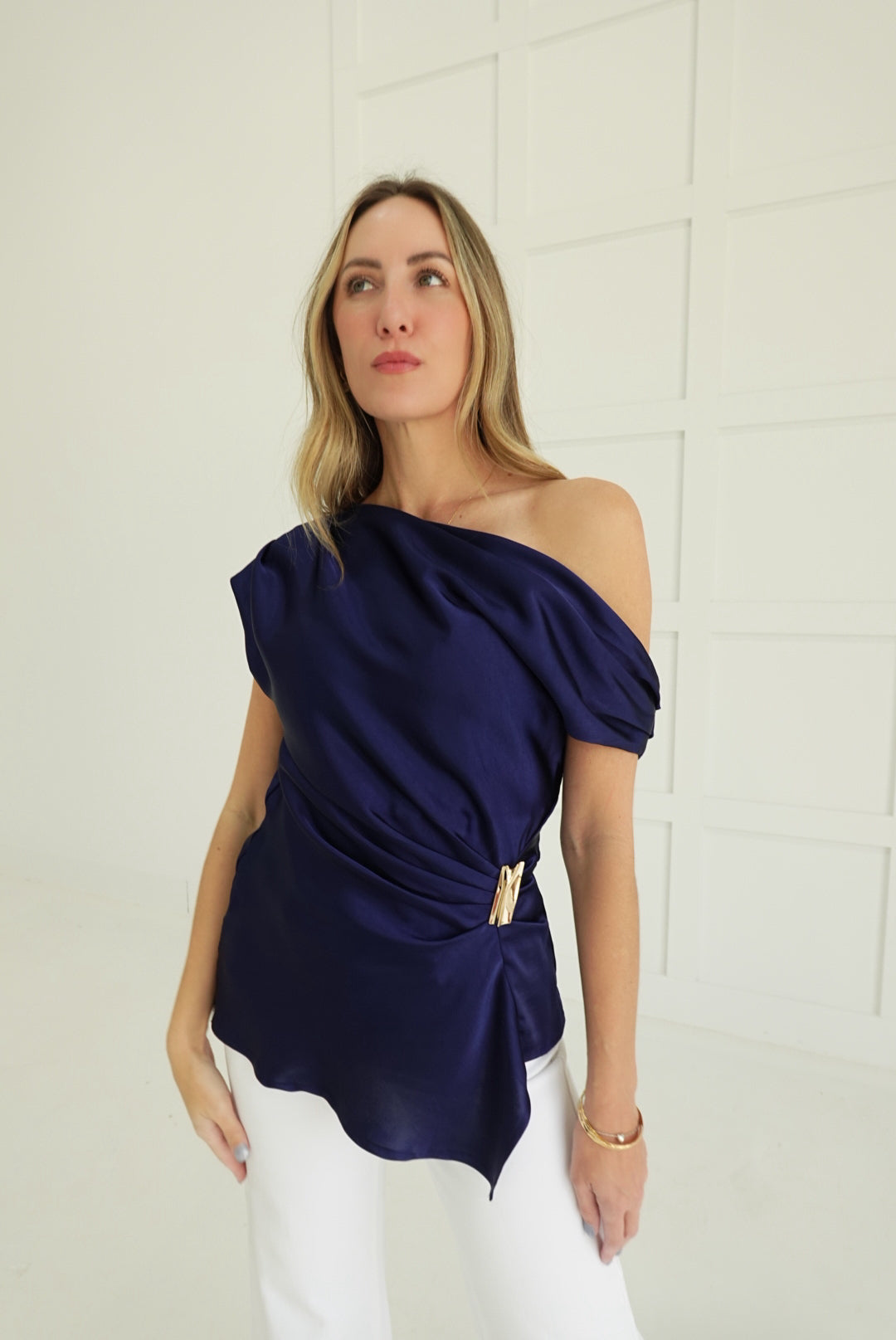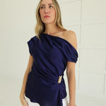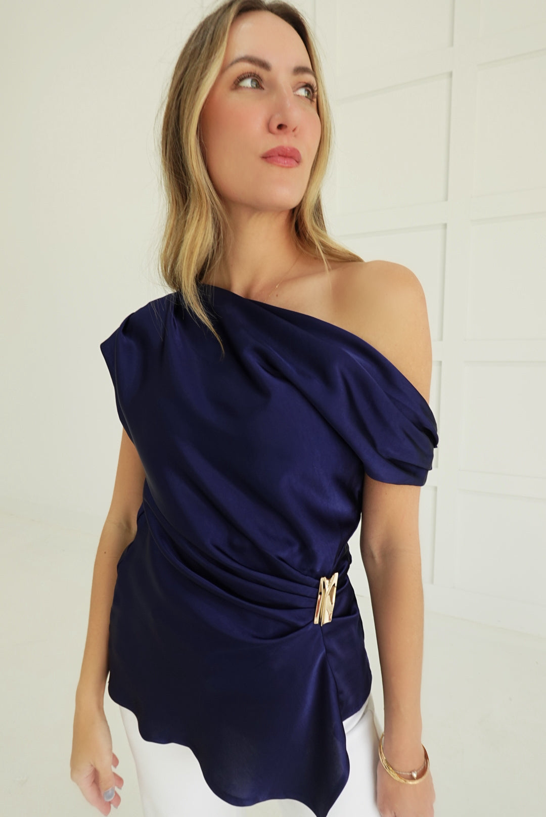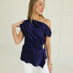 Dare to stand out in this striking asymmetrical satin blouse that commands attention from every angle. The draped shoulder creates an effortlessly bold silhouette, while delicate embellishment at the gathered waist adds unexpected sophistication. Luxurious satin fabric catches the light with every movement, making this piece perfect for those ready to make a statement. Whether styled for evening elegance or dressed down for confident everyday wear, the Celeste Satin Top delivers the kind of edge that turns heads.