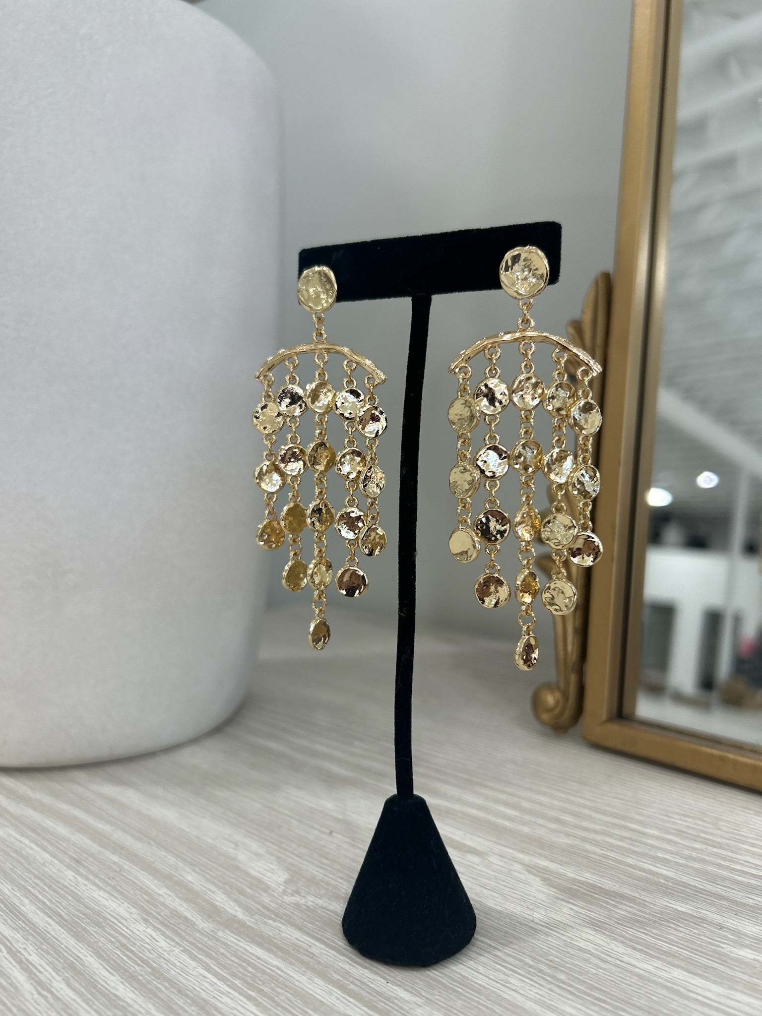 Fearless and unapologetic, these chandelier cascade earrings command attention with their hammered metal discs that tumble gracefully down the ear. Each textured disc catches light in unexpected ways, creating movement and dimension with every turn of your head. Bold enough to make a statement, refined enough to elevate any look—from edgy evening wear to daring daytime style. These aren't whisper-quiet accessories; they're a declaration of confidence and individuality.