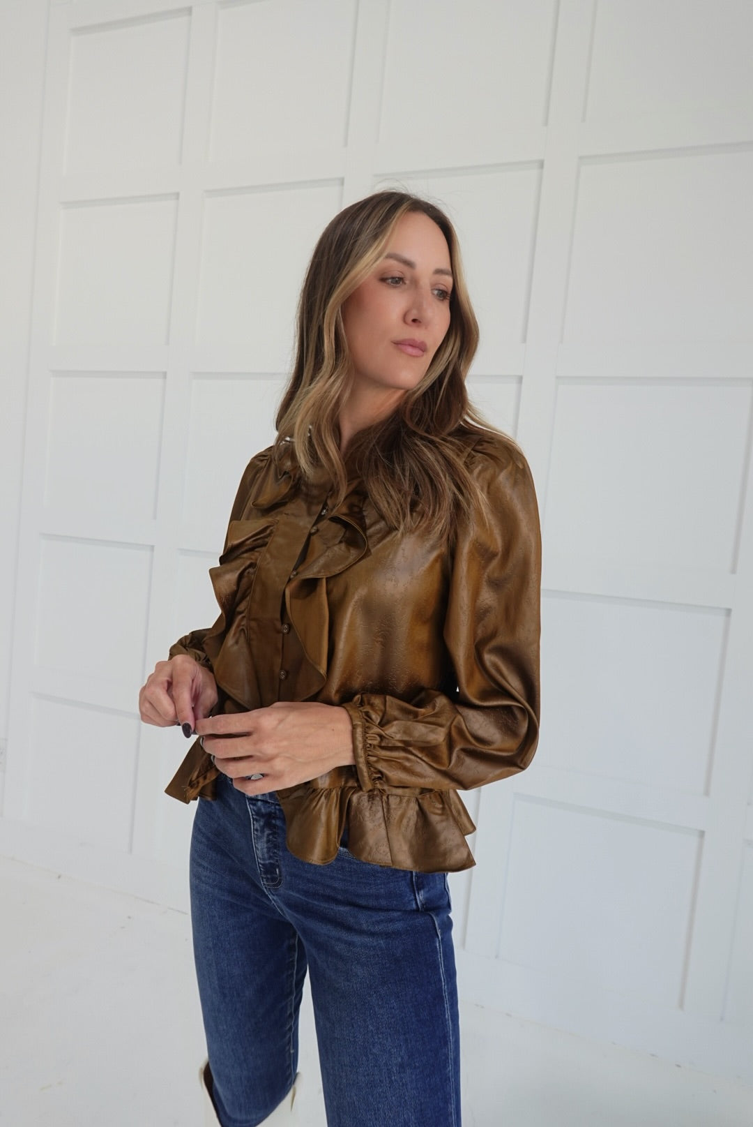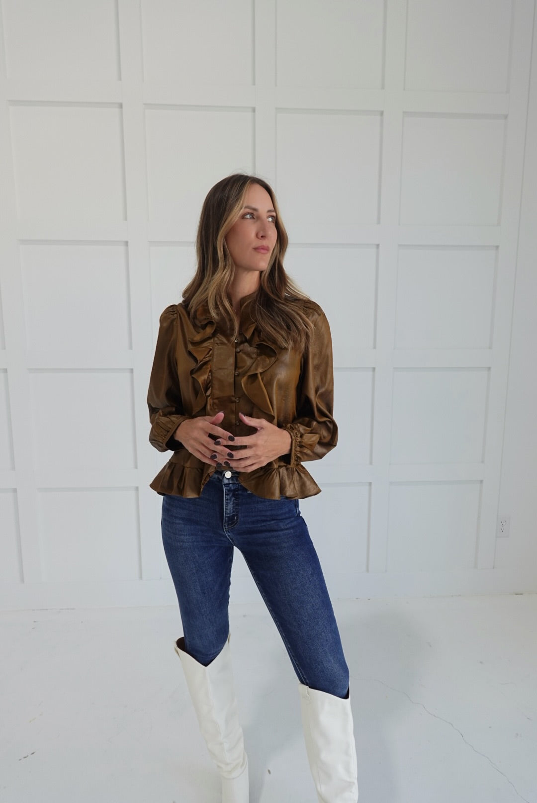 The Charmer Ruffle Top in Brown features long sleeves and delicate ruffle details that add a touch of elegance to your everyday wardrobe. Crafted for comfort and style, this top pairs effortlessly with jeans or skirts, making it a versatile choice for both casual and dressy occasions. Its flattering fit and soft fabric ensure you feel confident and supported throughout your day.