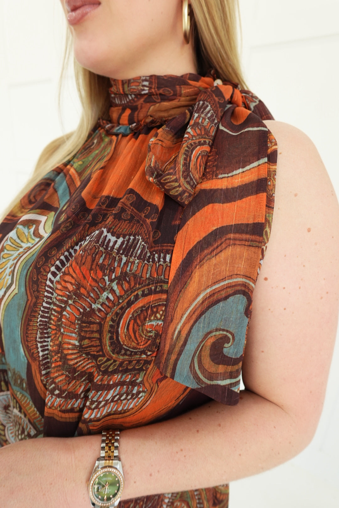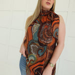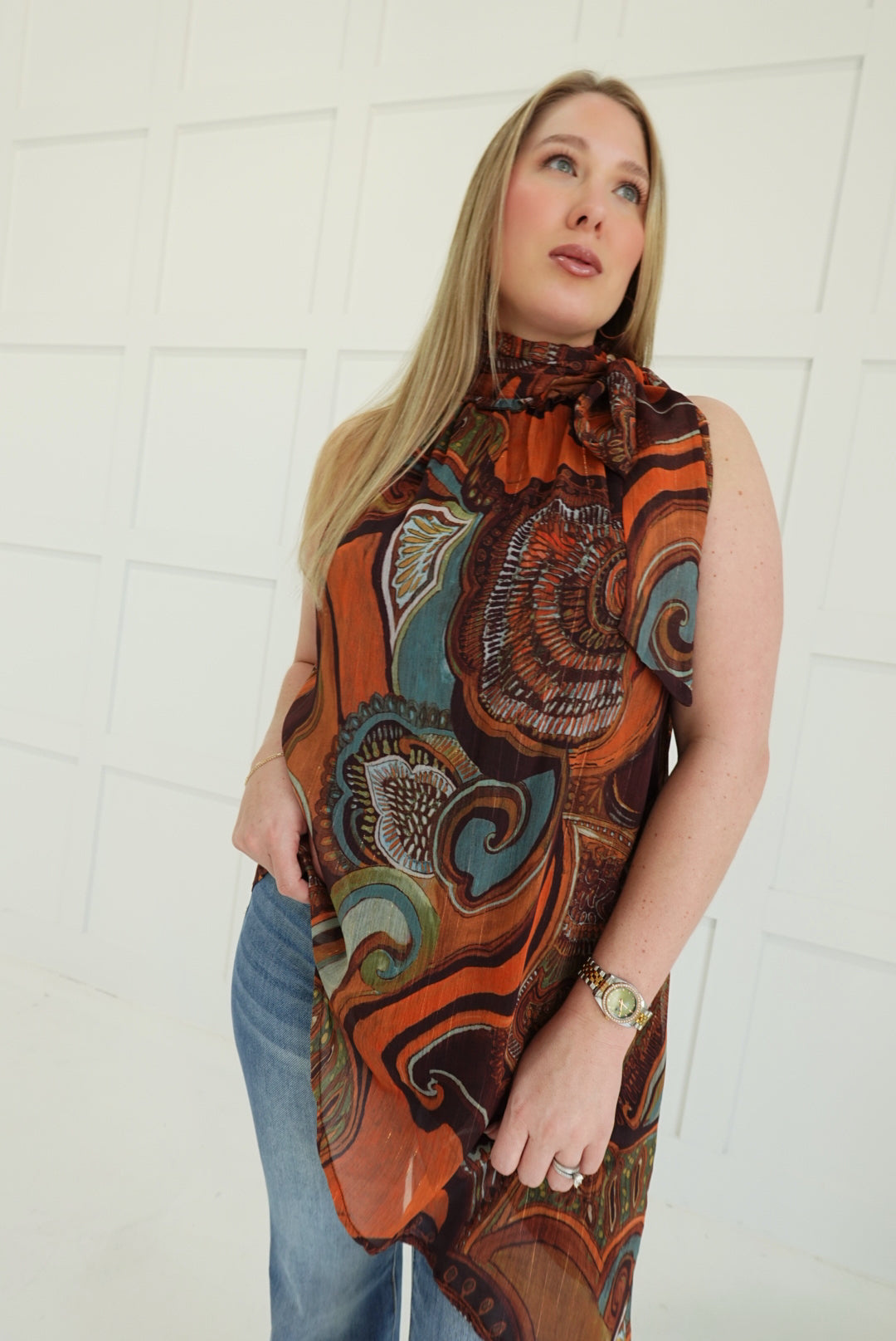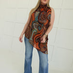 - High Neck Top With Metallic Threading + Asymmetrical Hem