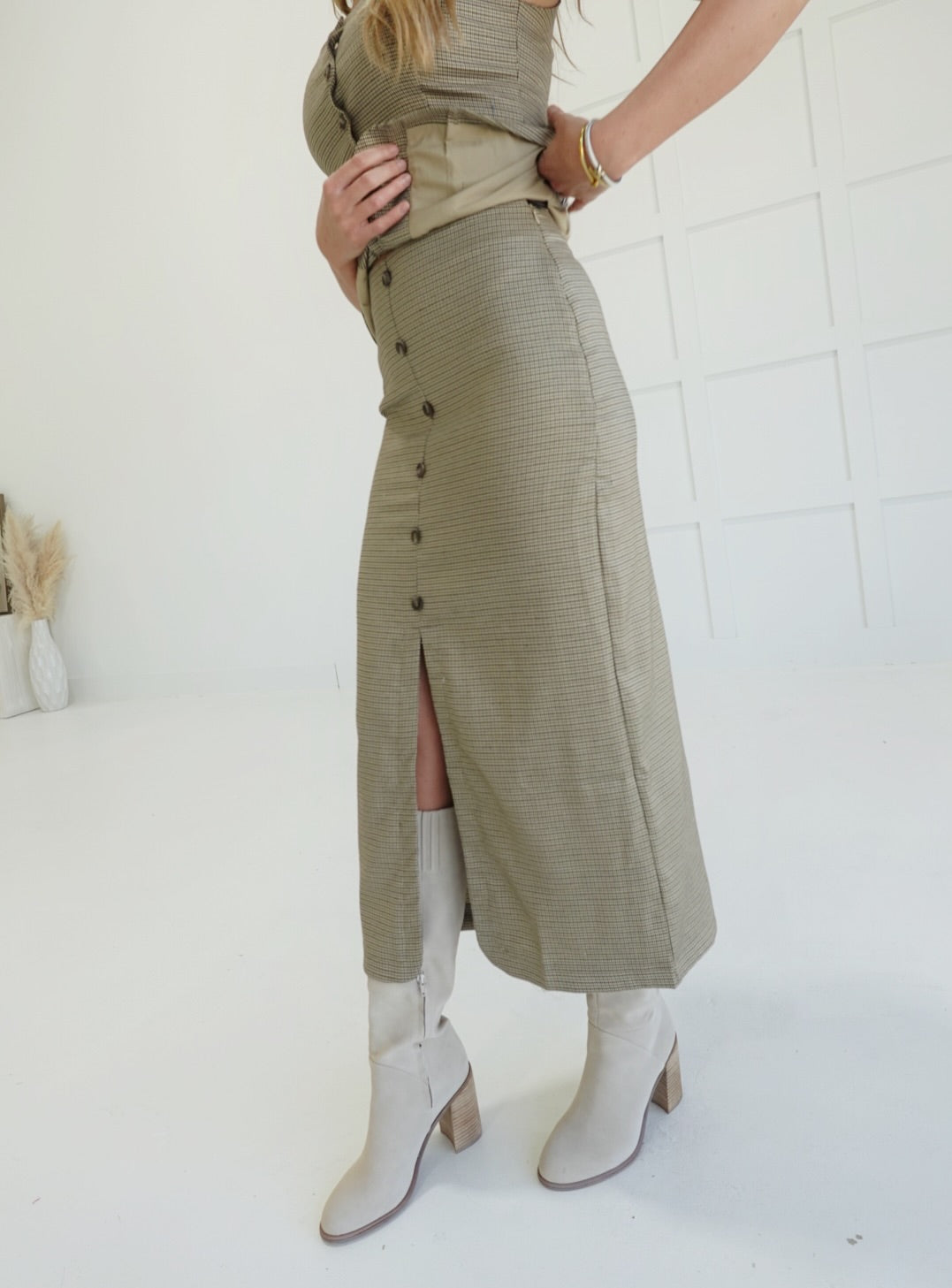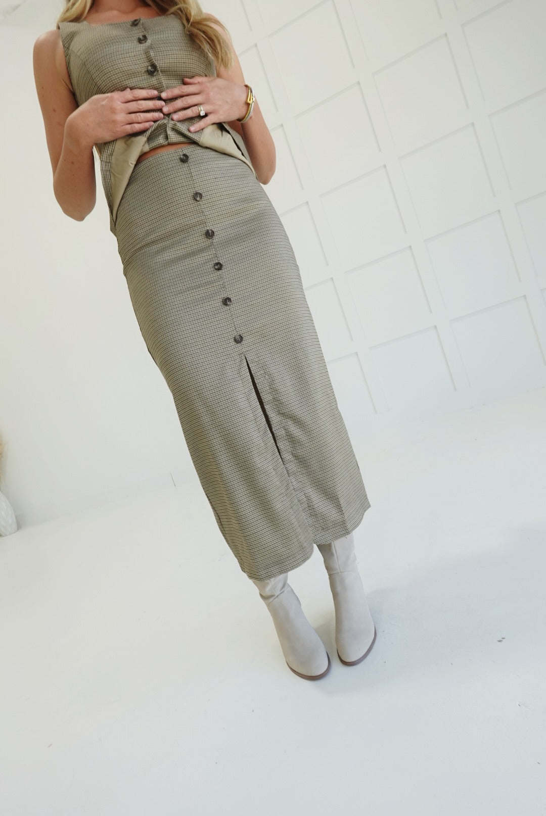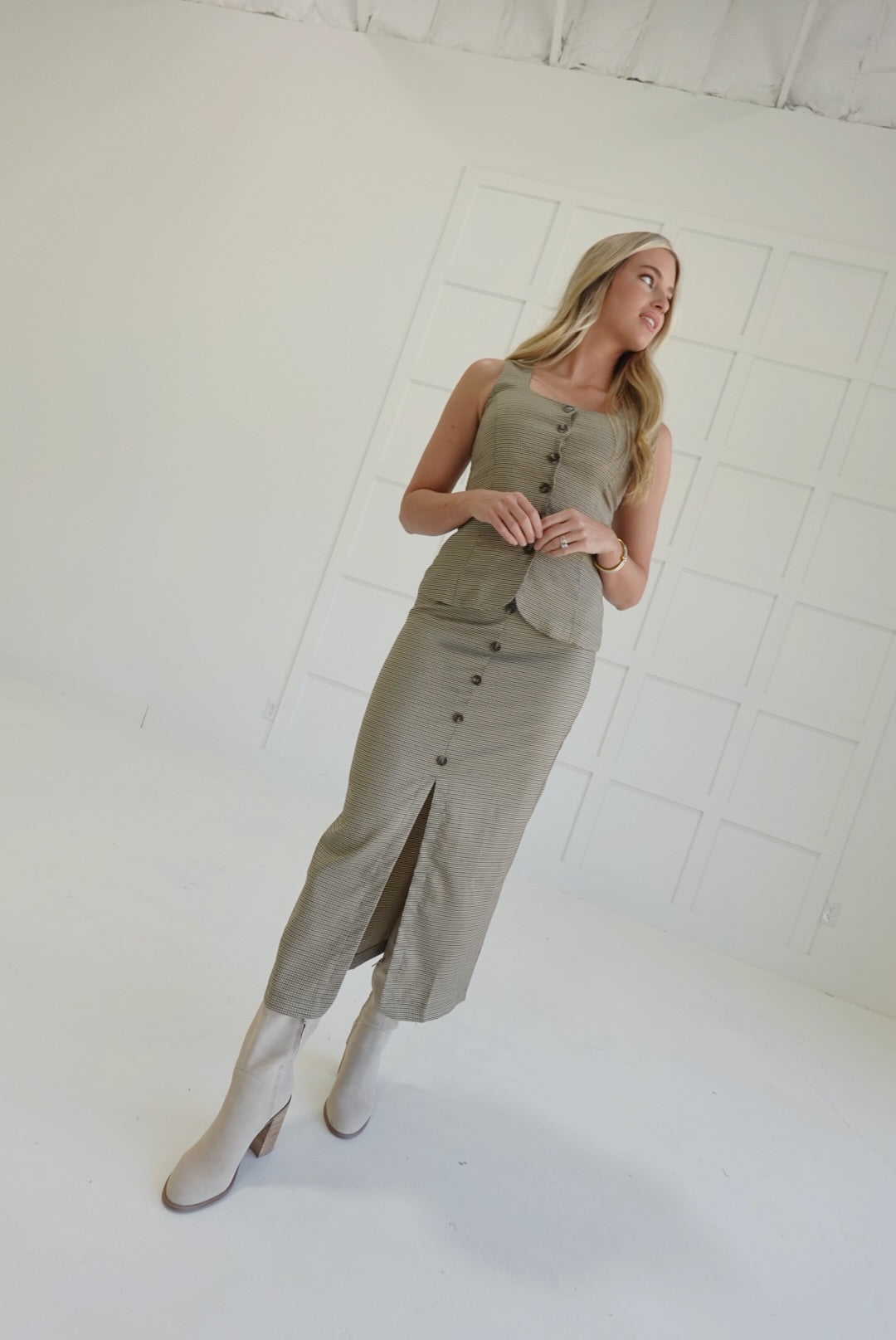 The Chasing Friday Pencil Skirt features a classic houndstooth plaid pattern that adds timeless style to your wardrobe. Its tailored fit flatters your silhouette while offering comfortable wear throughout the day. Perfect for both professional settings and casual outings, this skirt helps you feel confident and polished wherever you go.