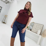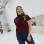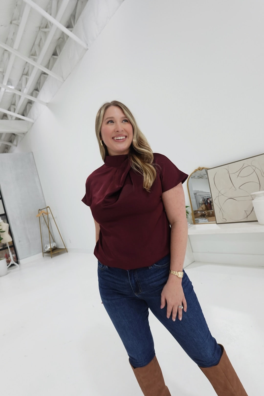 Stay effortlessly stylish and comfortable in the Choosey Mock Neck Top in Wine. Featuring a draped cross-front design and a flattering mock neck, this top adds a touch of elegance to your everyday wardrobe. Its soft fabric and relaxed fit ensure all-day comfort, making it easy to dress up or down with confidence. Perfect for layering or wearing on its own, this versatile piece supports you in looking and feeling your best.