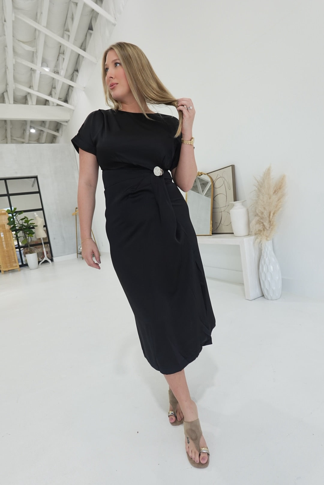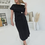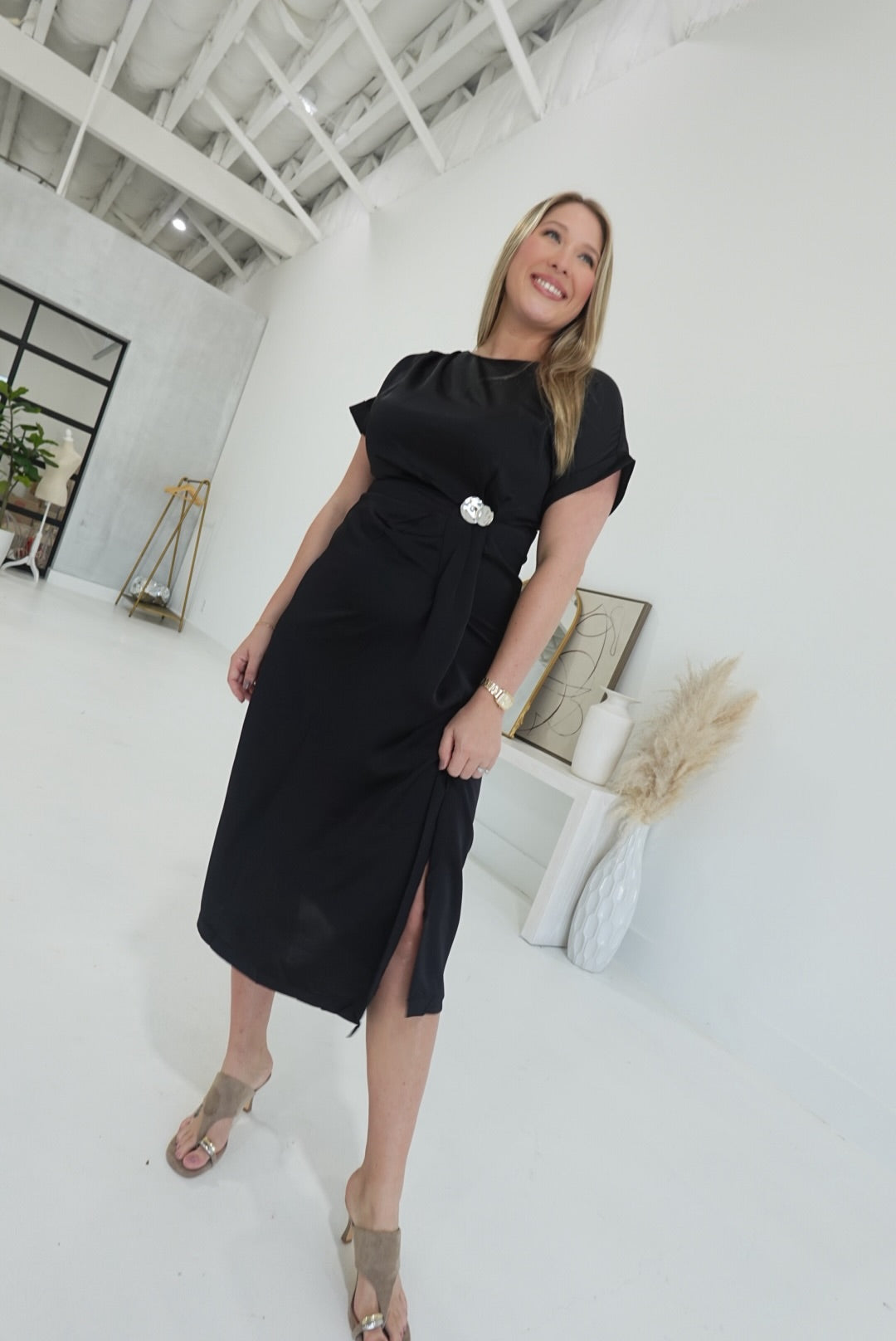 The City Noir Midi Dress combines sleek metal trim accents with a comfortable short sleeve design, creating a versatile piece perfect for day-to-night wear. Its midi length offers an elegant silhouette while allowing ease of movement. This dress is ideal for those seeking a stylish yet effortless outfit that transitions smoothly between occasions.