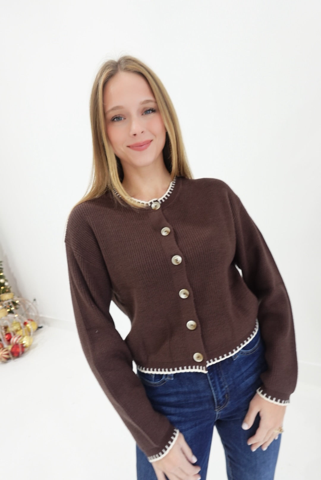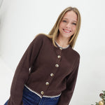 Stay comfortable and stylish with the Clancy Contrast Cardi. Featuring a button-down front and a soft knit fabric, this cardigan is designed for easy layering. The contrast stitching trim adds a subtle yet distinctive detail that enhances its classic silhouette. Perfect for cool days, it offers both warmth and a polished look to complement your wardrobe effortlessly.