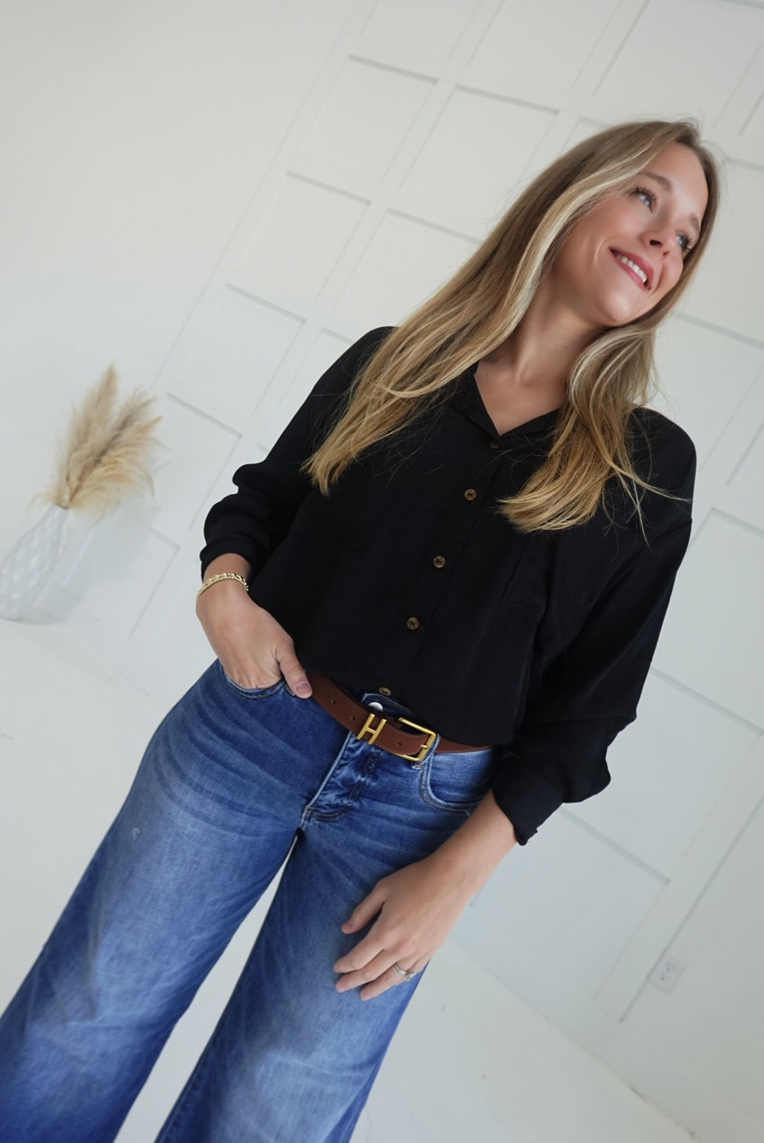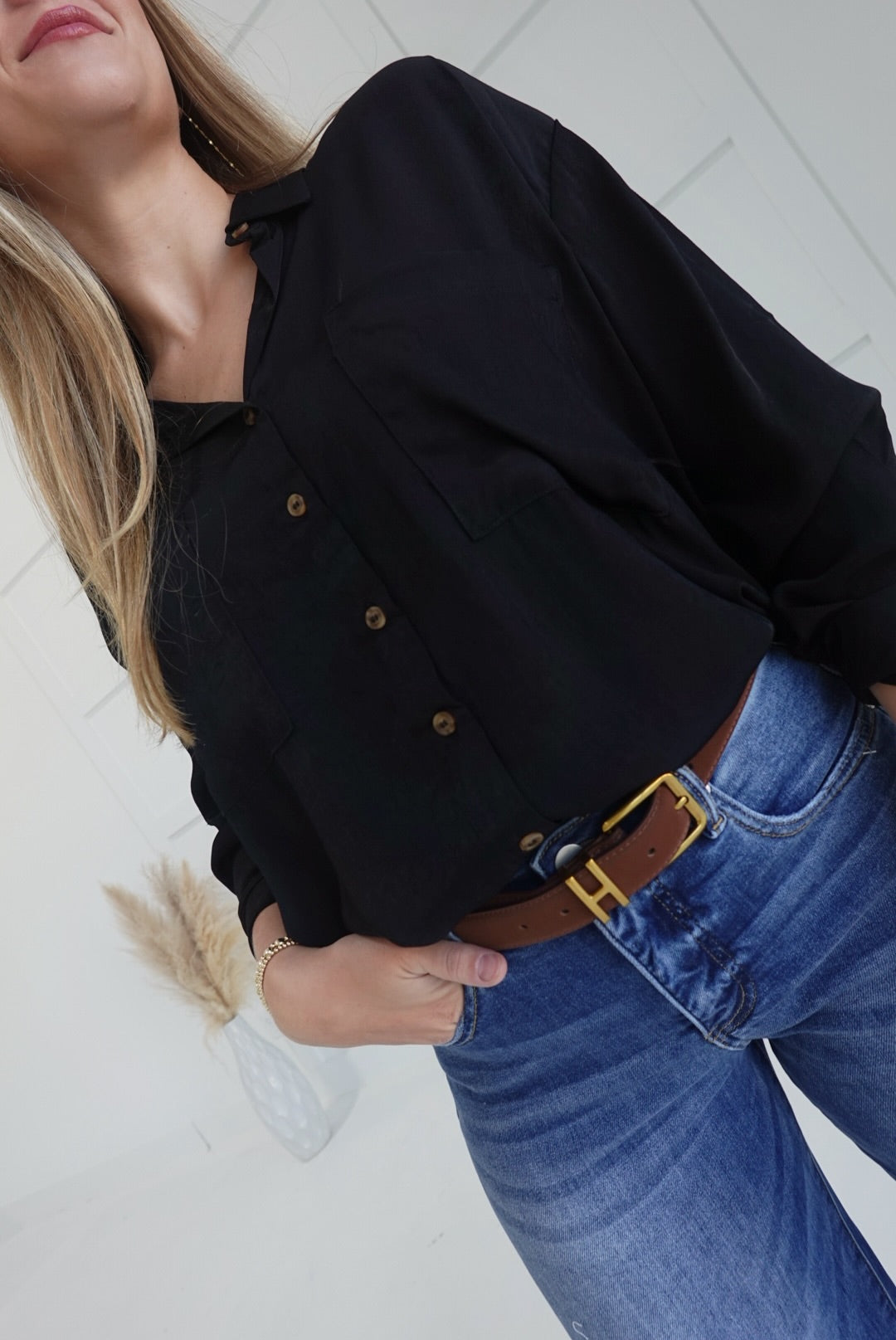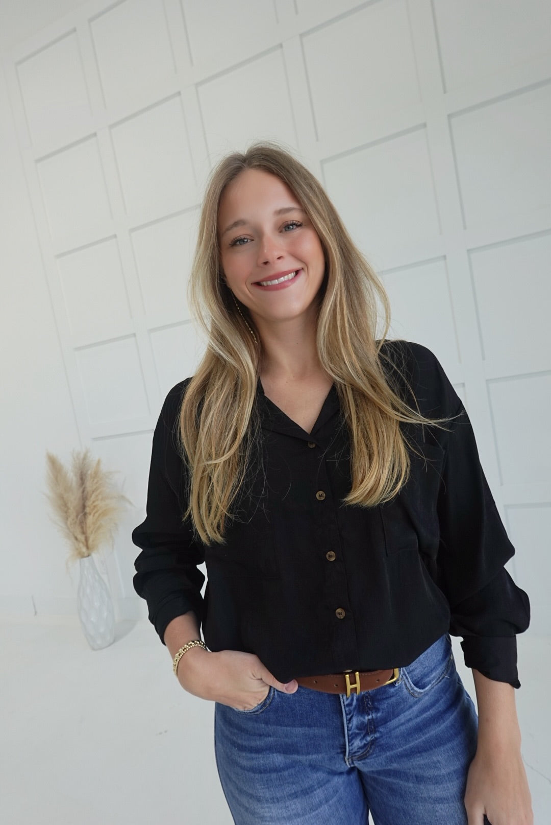 Embrace effortless style with the Clocked In Button Down Shirt in Black. This oversized, long-sleeve shirt offers a relaxed fit for comfortable all-day wear, perfect for layering or making a bold statement on its own. Crafted to balance casual ease with a polished look, it’s ideal for those seeking both comfort and confidence in their wardrobe.