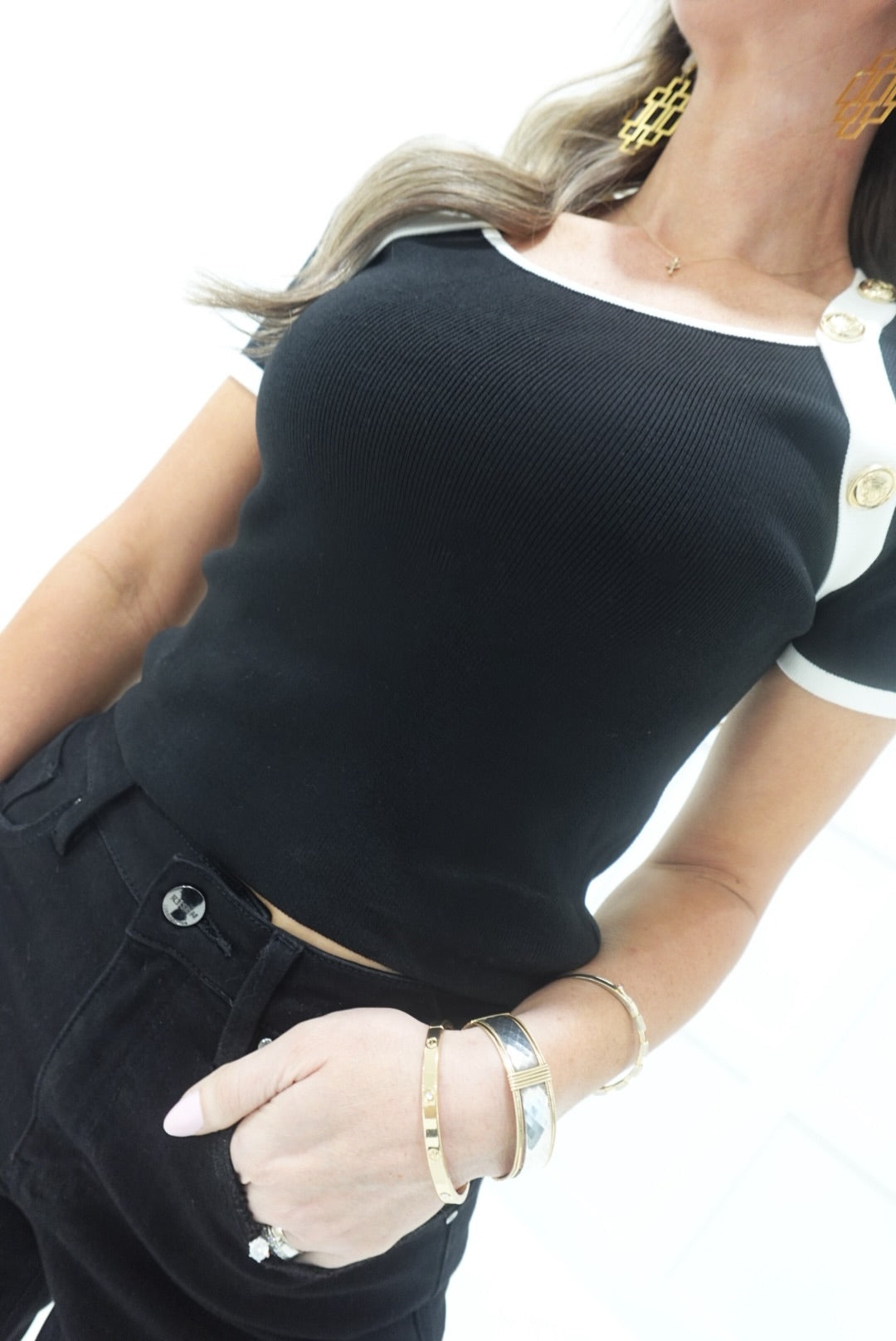Get ready to be stylish and comfortable in our Cobel Knit Top! This solid short sleeve pullover features a playful contrast band with accented gold buttons. Made from lightweight, non-sheer knit, this top is perfect for any occasion. Stay chic in black and effortlessly stand out.