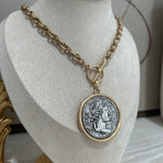 # Coin Toggle Necklace - WG Make a bold statement with this striking two-tone metal coin toggle pendant necklace. The contrasting metallic finish catches light with every movement, while the substantial coin pendant commands attention. The toggle closure adds an unexpected edge—secure yet undeniably cool. Layer it fearlessly or wear it solo for instant sophistication. A daring essential that transforms any outfit into something unforgettable.