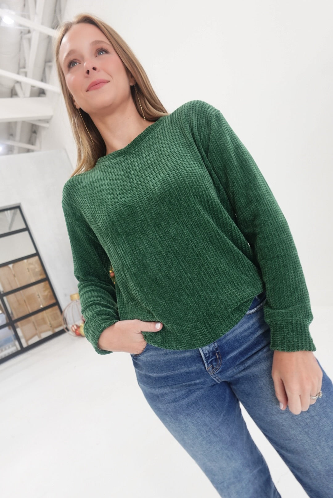 Experience cozy comfort with the Comfort Over Chenille Top. Crafted from soft chenille fabric, this round neck sweater offers gentle warmth and a relaxed fit, perfect for layering or wearing on its own. The subtle waffle texture adds understated style, making it an ideal choice for everyday wear when you want to feel both comfortable and cared for throughout your day.