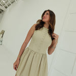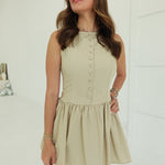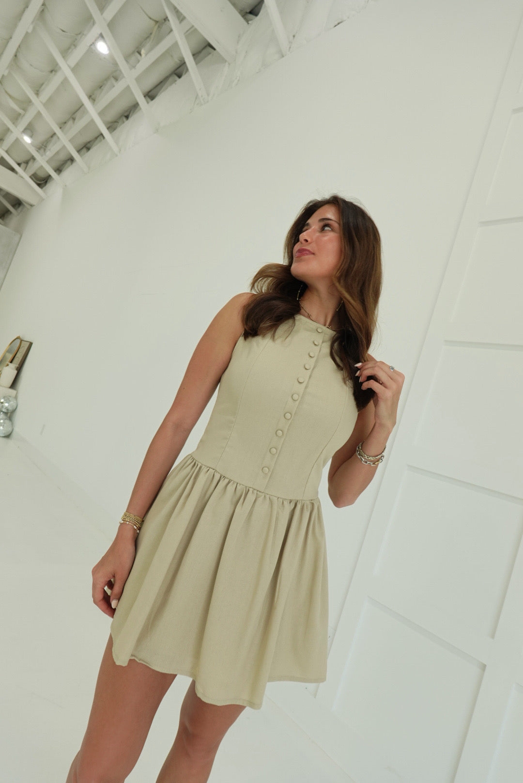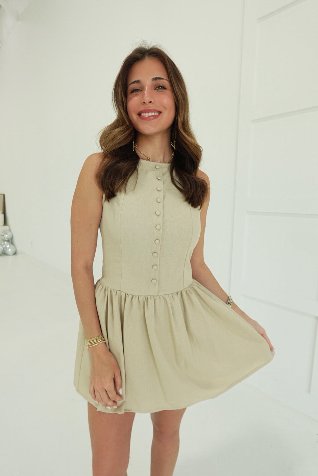Effortless elegance meets warm-weather style with this linen mini dress. The classic boat neckline and sleeveless silhouette offer a timeless look, while the button-front closure adds practical charm and versatile styling options. Crafted from breathable linen, it's perfect for casual outings, weekend getaways, or layering under a blazer. The khaki tone complements all skin tones and pairs beautifully with sandals, sneakers, or dressy accessories for day-to-night versatility.
