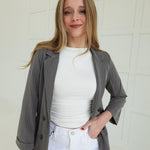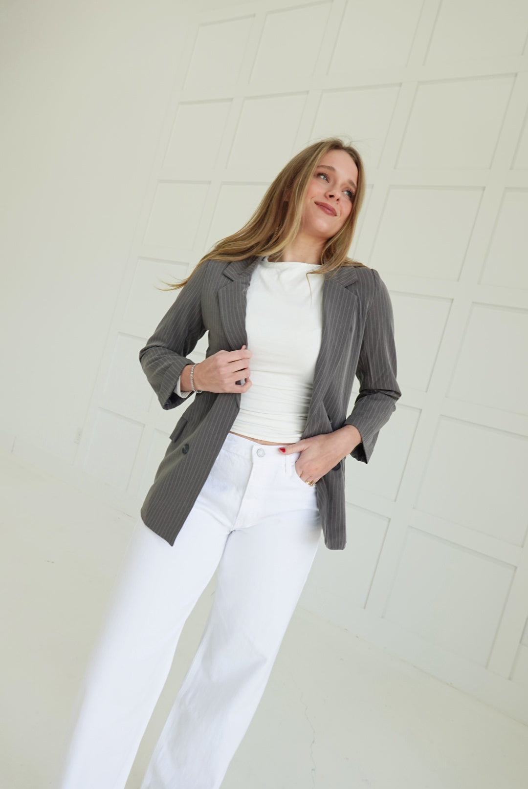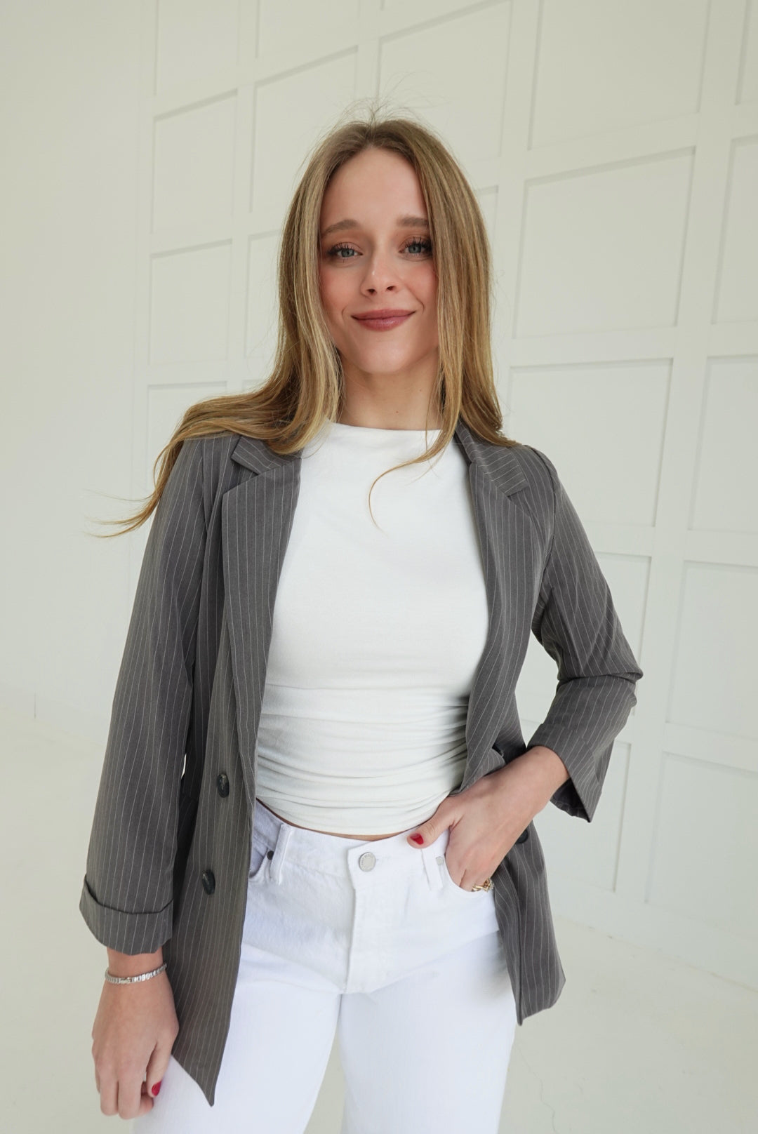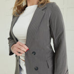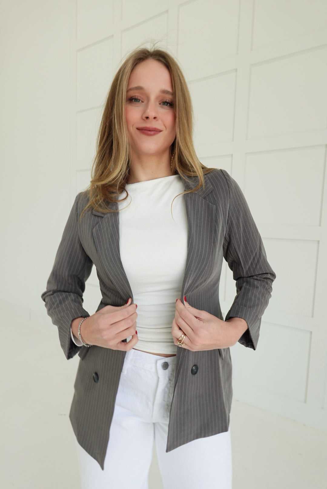Corporate Chic Blazer - Grey Elevate your power moves with this pinstripe blazer that refuses to play it safe. The notched collar cuts a sharp silhouette while the tailored grey pinstripe demands attention in any boardroom or beyond. Built for those who command respect without saying a word—pair it with everything from crisp whites to bold jewel tones and watch the magic happen. This is the piece that transforms an outfit into a statement.