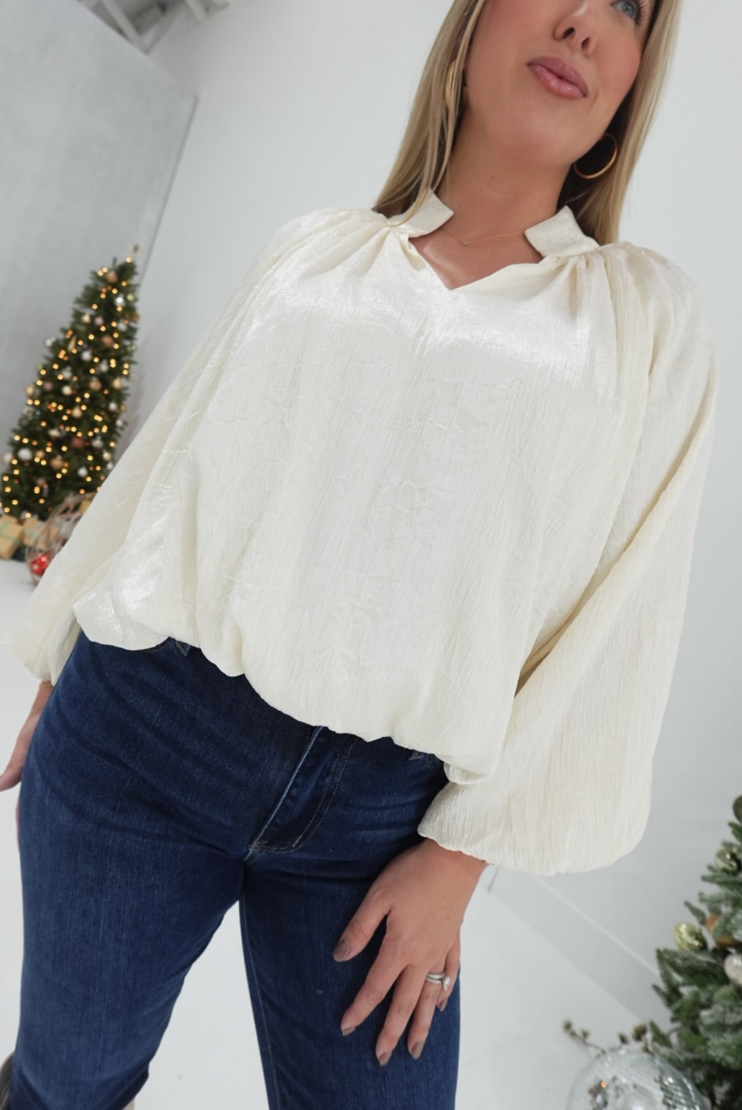 The Courtship Blouse in Cream offers a flattering solid balloon sleeve design with elegant pleated shoulder details and a gathered back yoke for added texture. Made from lightweight woven fabric and fully lined, it ensures comfort without sheer exposure. Perfect for creating a polished, sophisticated look with ease.