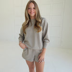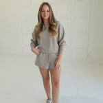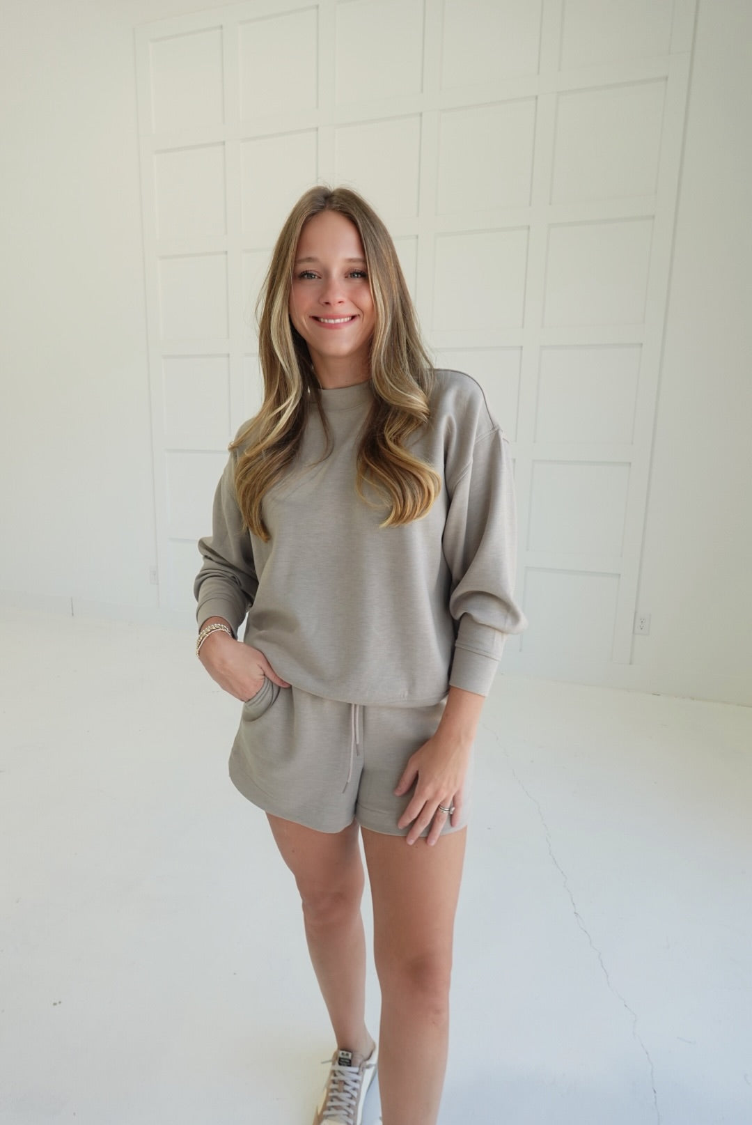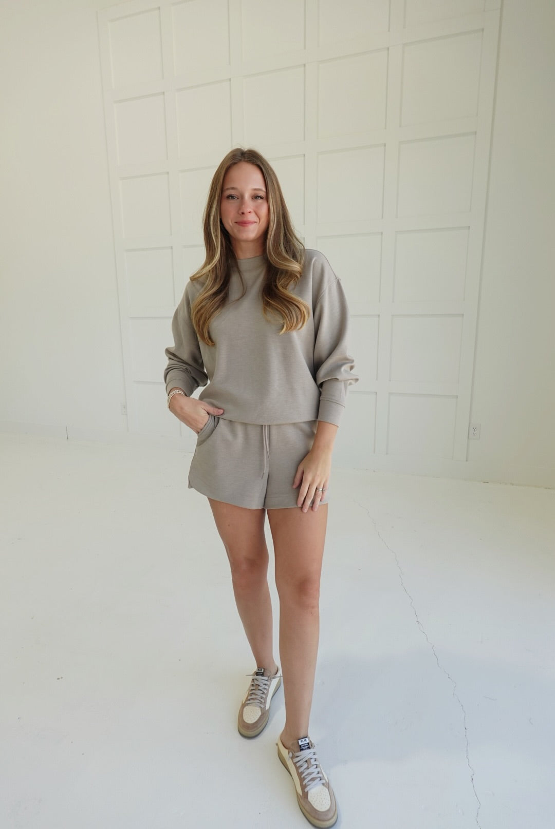 Experience comfort and versatility with the Cozy Core Set in Ash Mocha. This set features breathable scuba shorts and a matching pullover designed to keep you cozy whether you're relaxing at home or layering for an active day. The soft fabric provides gentle support and ease of movement, making it an ideal choice for everyday wear with a stylish, understated look.
