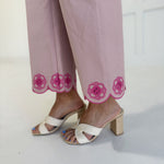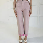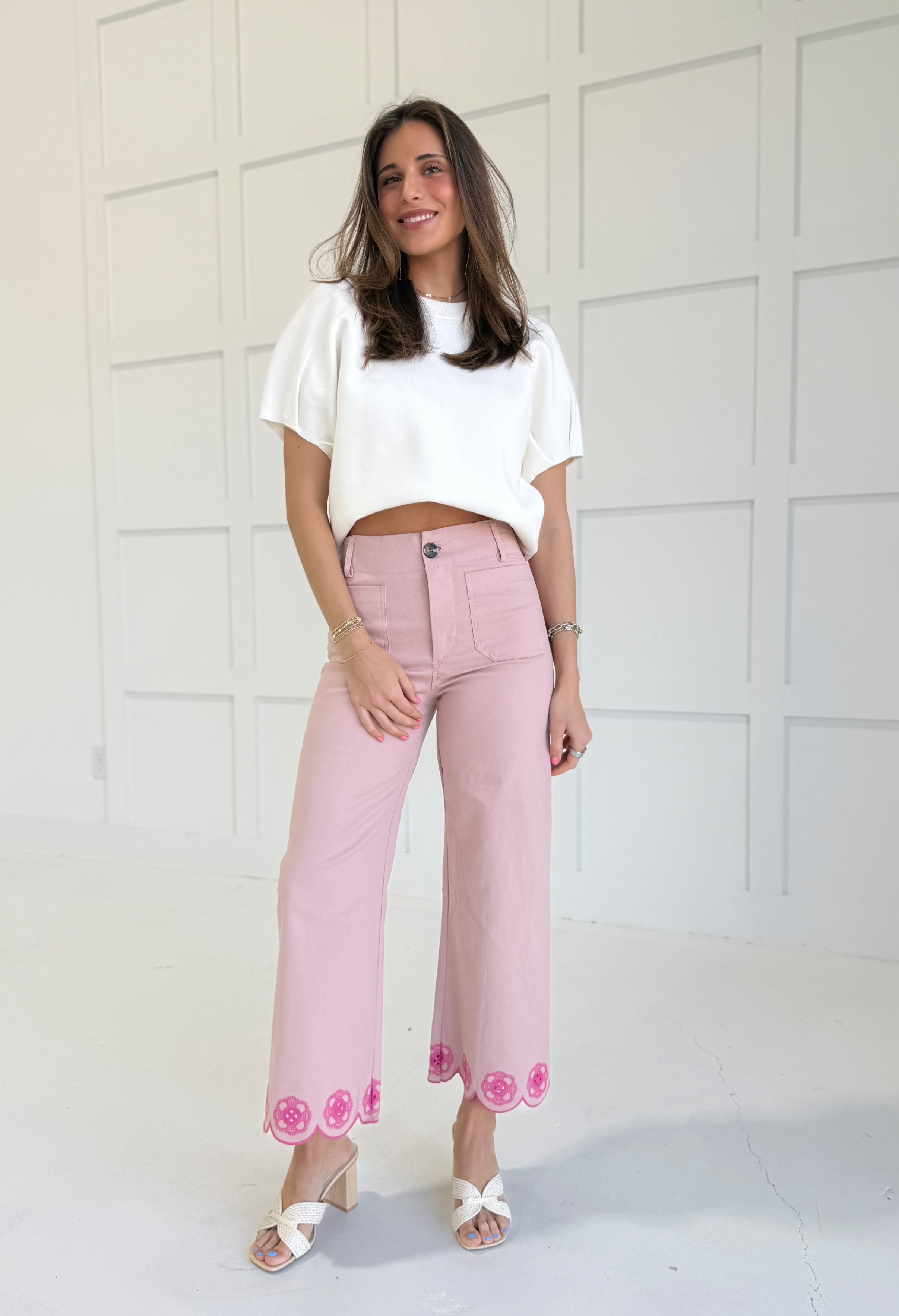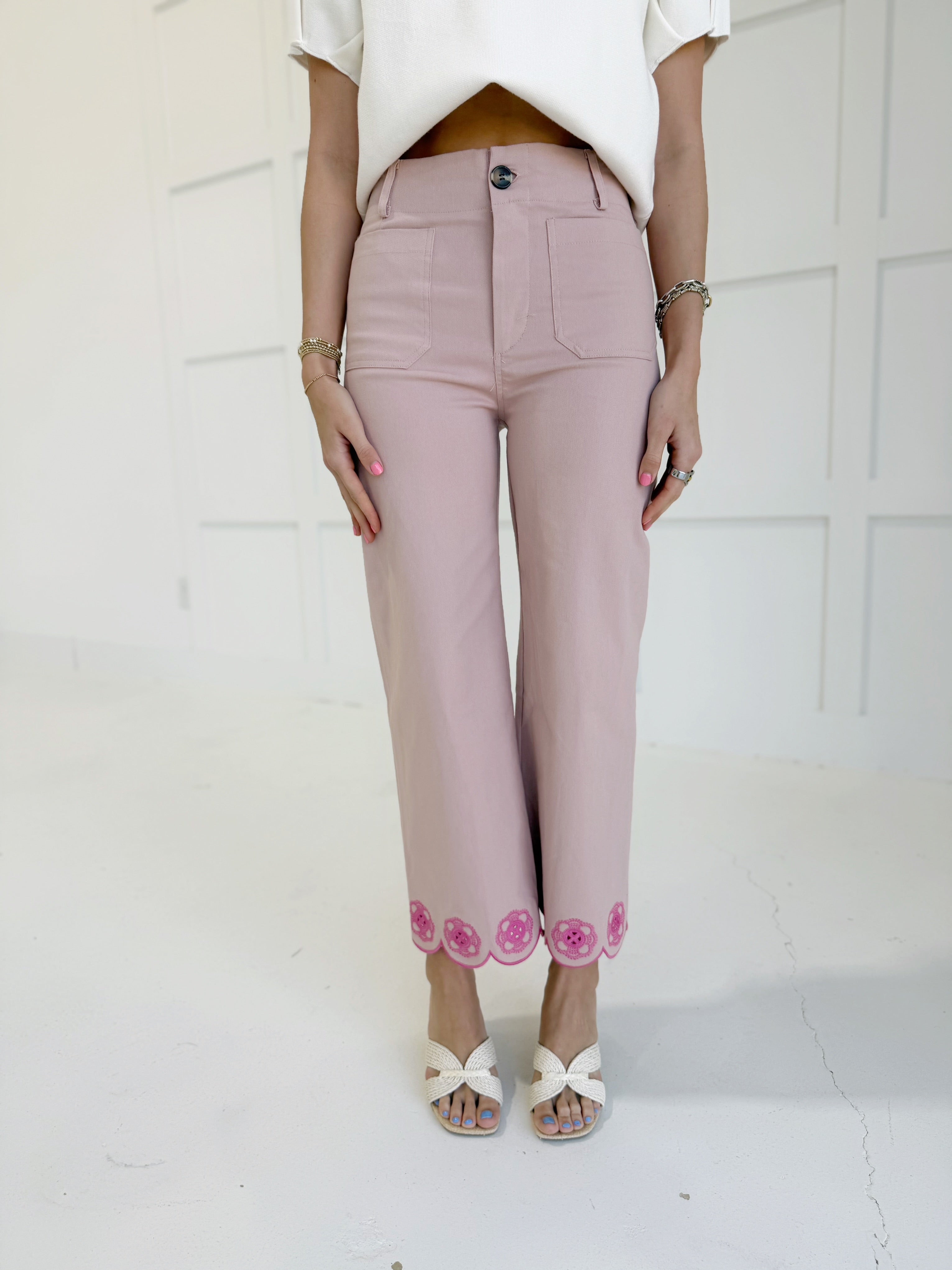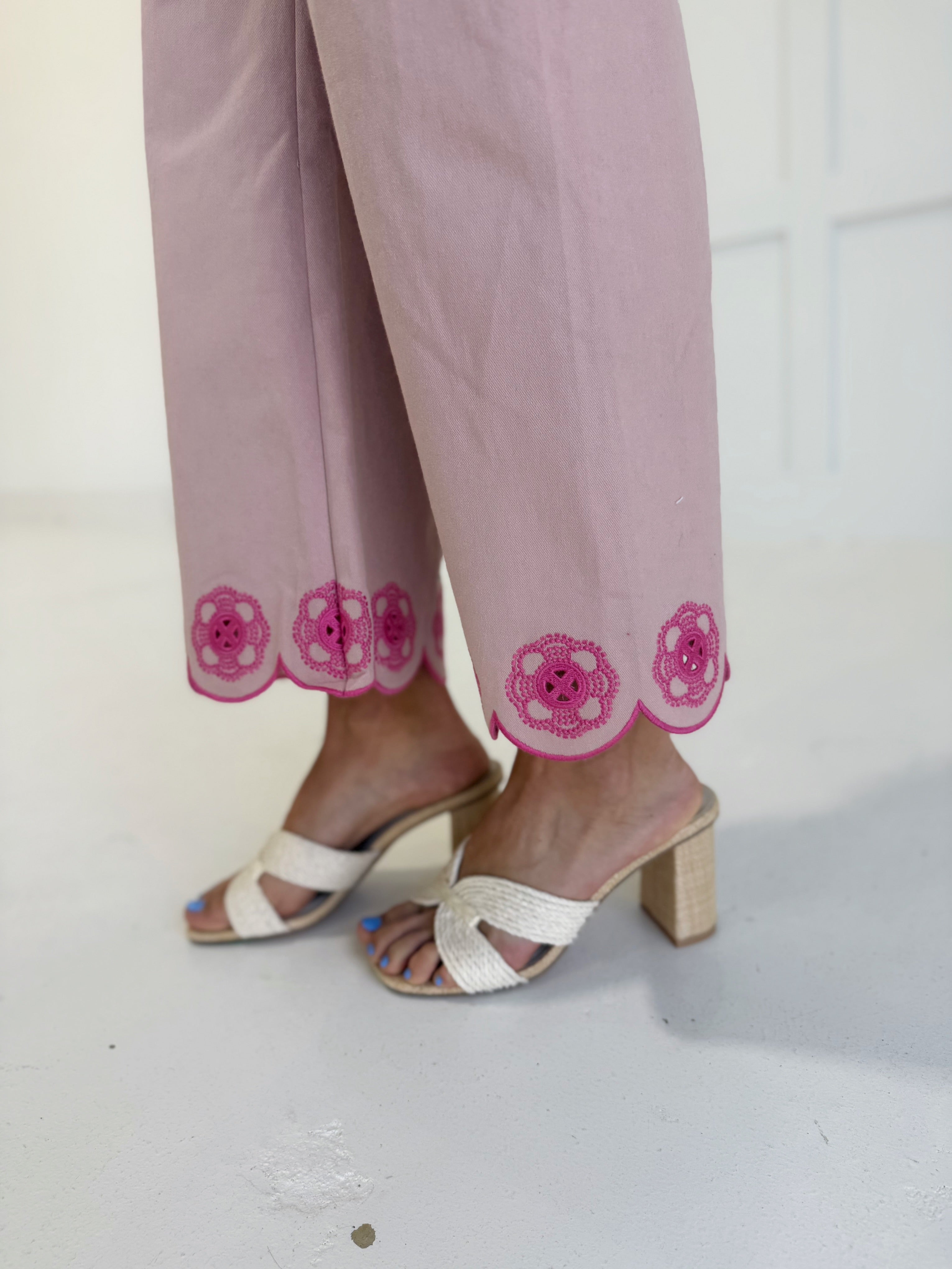 Dare to stand out in these embroidery scallop-hem wide-leg pants. Delicate embroidered details elevate the classic silhouette, while the signature scalloped hemline adds an unexpected edge to your everyday look. The relaxed wide-leg cut offers freedom of movement without sacrificing style—perfect for those who refuse to play it safe. Soft baby pink hue pairs effortlessly with bold accessories or minimalist basics. A statement piece that whispers confidence.