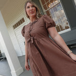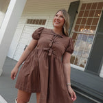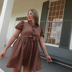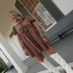 The Dalton Babydoll Dress features a flattering round neckline and charming short puff sleeves for a delicate touch. Its front bow tie detail adds a playful accent, while the A-line silhouette ensures a comfortable, flowing fit. Fully lined for added comfort, this mini dress combines style and ease, making it a versatile choice for your wardrobe.