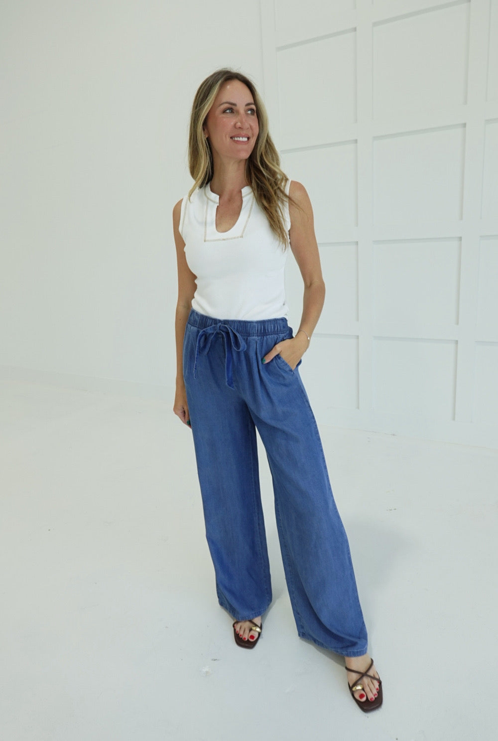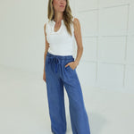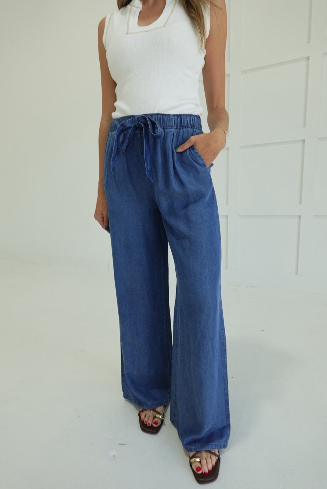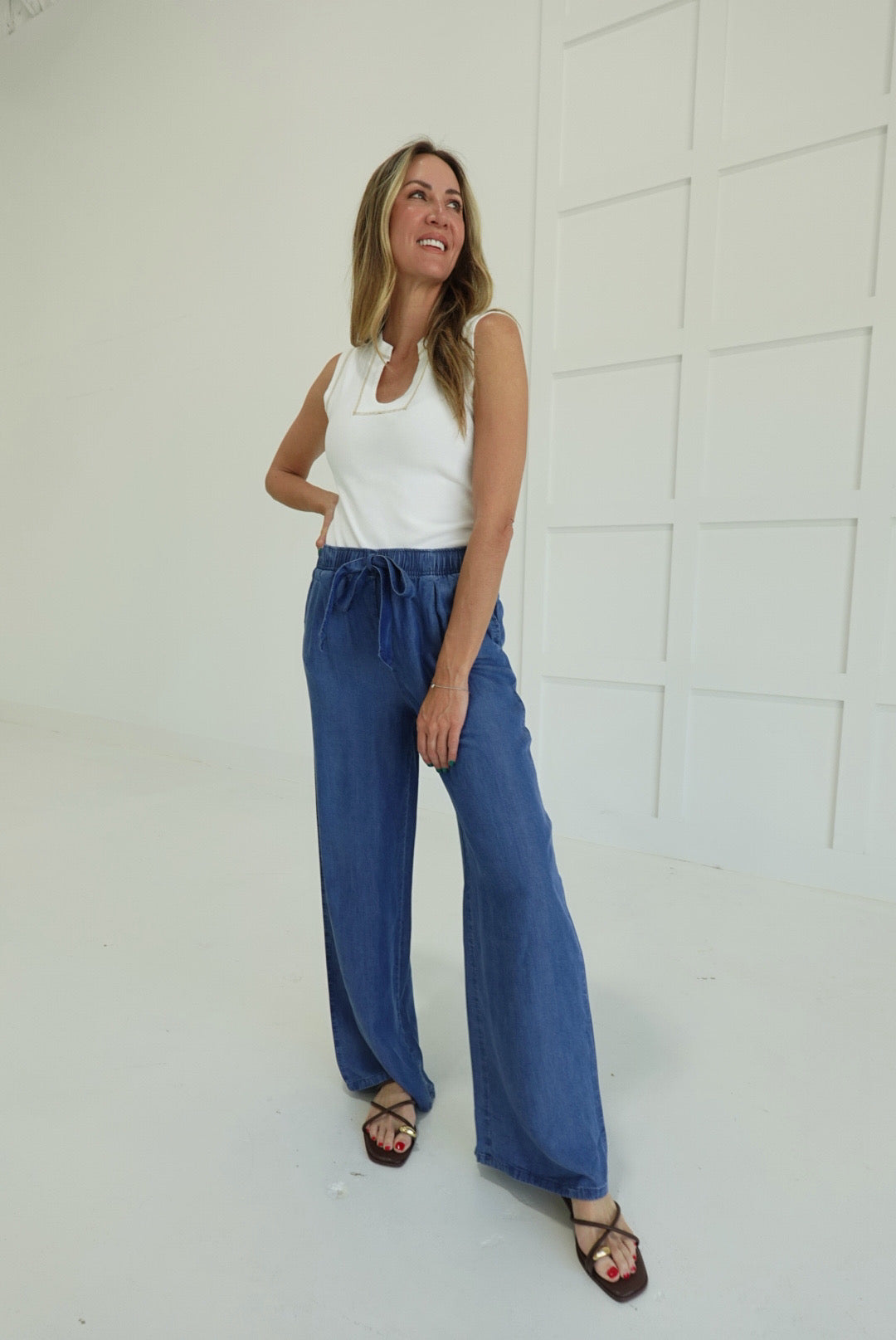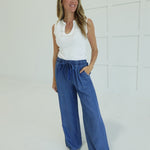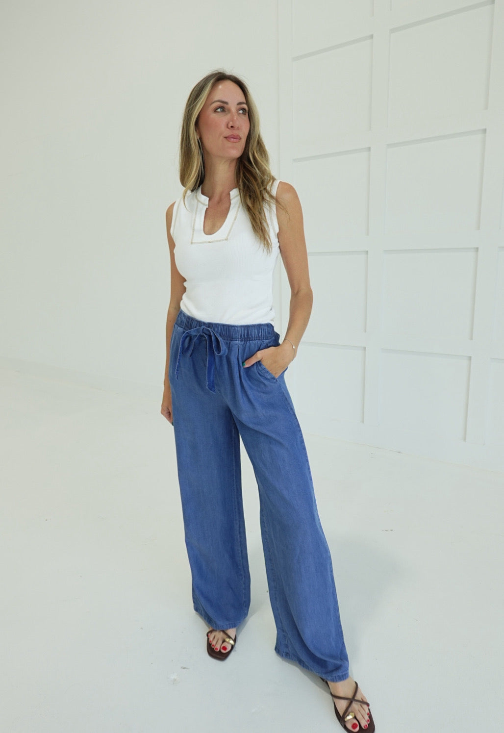 Effortless comfort meets timeless style with the Danya Tencel Pants. Crafted from breathable Tencel fabric, these wide-leg pants feature a relaxed silhouette that flatters every frame. The elastic waist provides all-day comfort without sacrificing sophistication. Perfect for casual outings or dressed up with your favorite blouse, these chambray pants are a versatile wardrobe essential that transitions seamlessly from season to season.