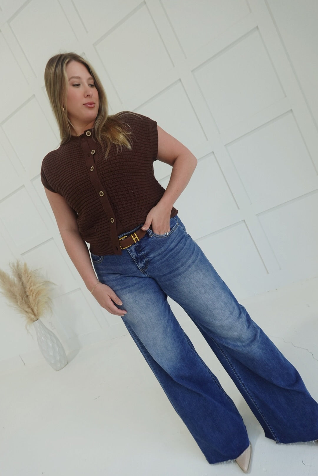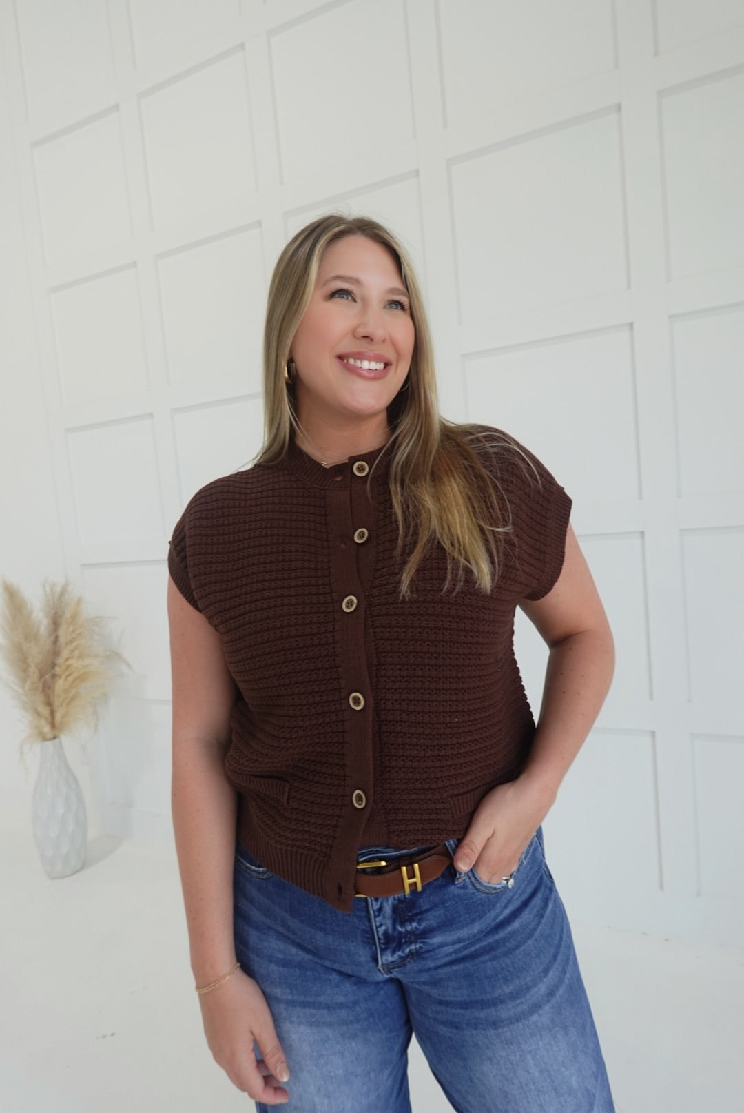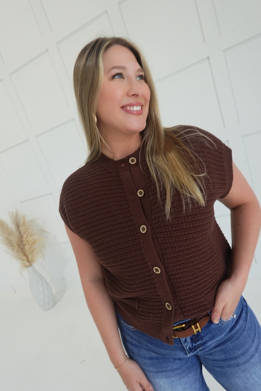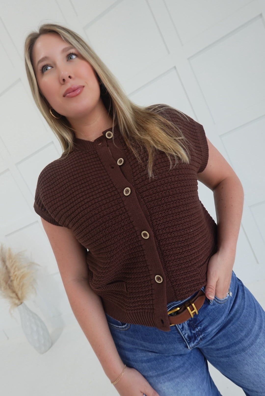 This sleeveless cardigan top offers the comfort of a knit fabric with a textured feel, designed to resemble a button-down short sleeve cardigan. Its lightweight, breathable material makes it perfect for layering, providing a stylish and versatile addition to your wardrobe. Ideal for transitional weather, it combines ease of wear with a flattering fit to support your everyday style.