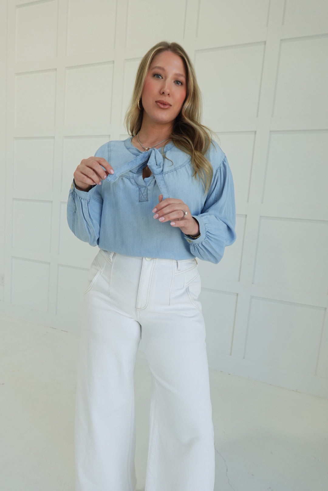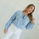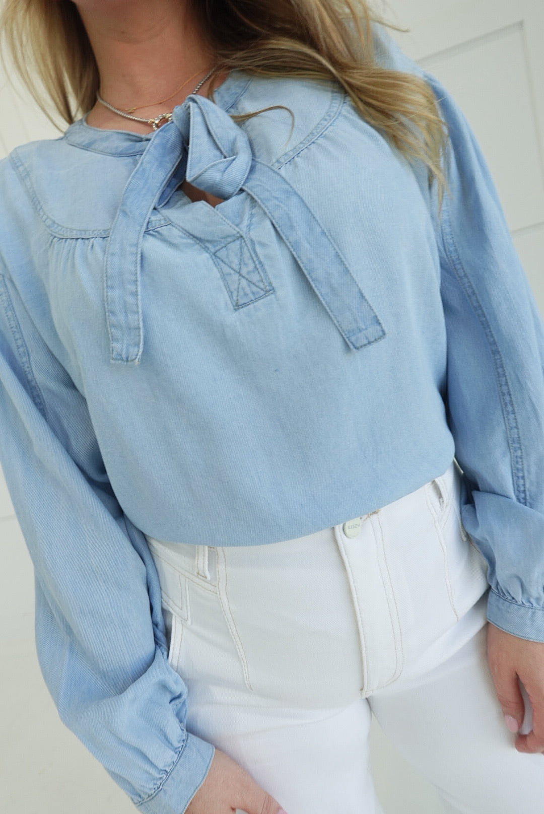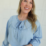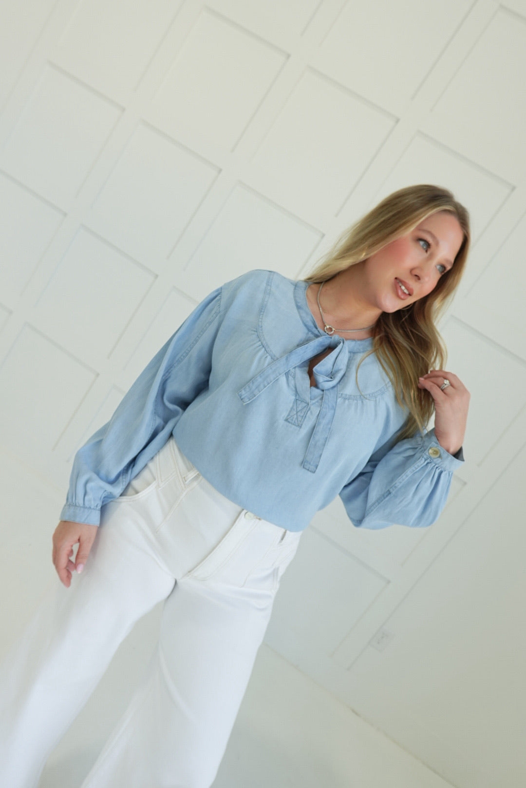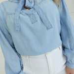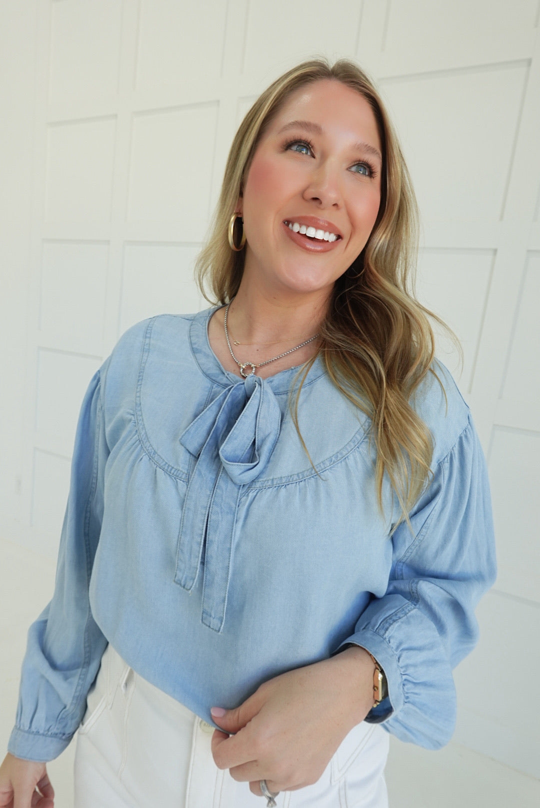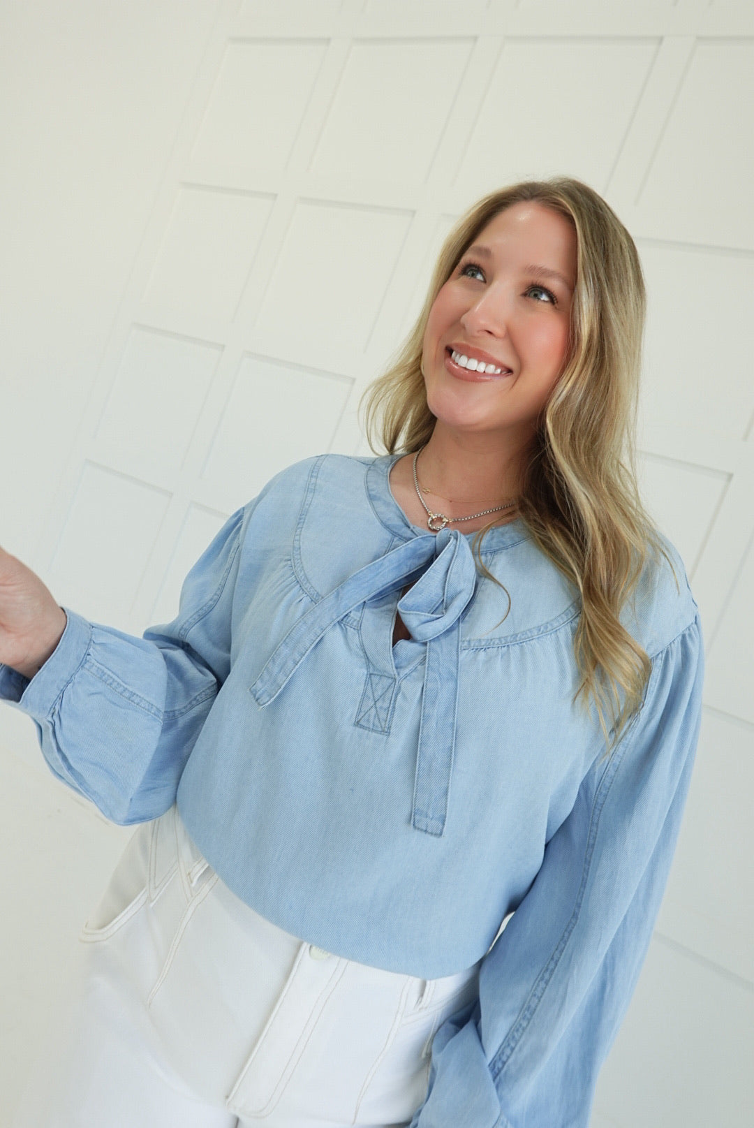 Unleash your edge with this fearless light denim front-tie long sleeve top. The bold tie-front detail commands attention while the classic denim fabric delivers timeless versatility. Perfect for those who refuse to blend in, this piece transforms any outfit into a statement. Layer it over basics or wear it solo—either way, you're making waves. Daring style meets everyday wearability in one unforgettable top.