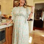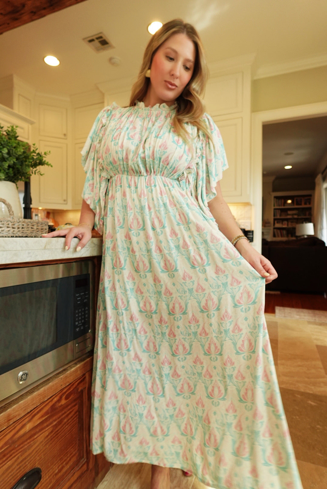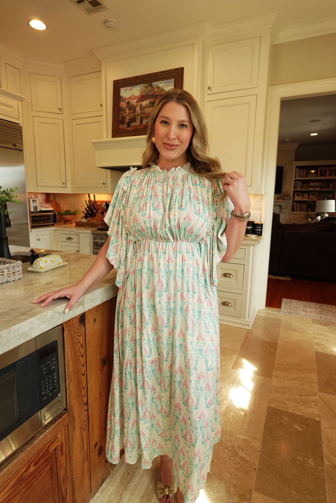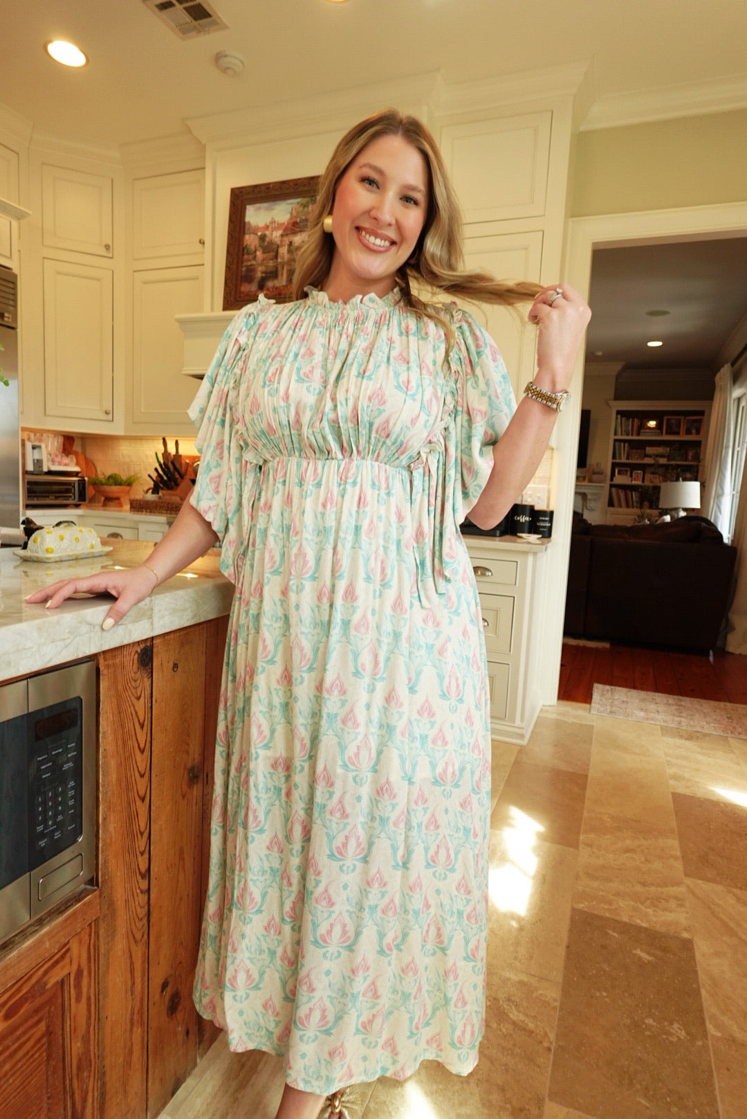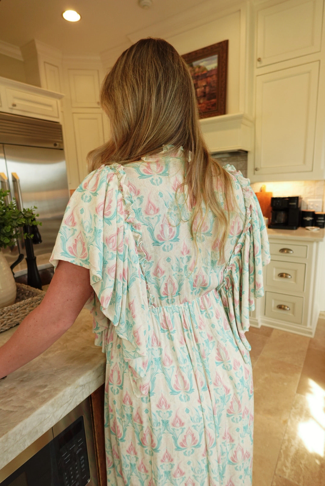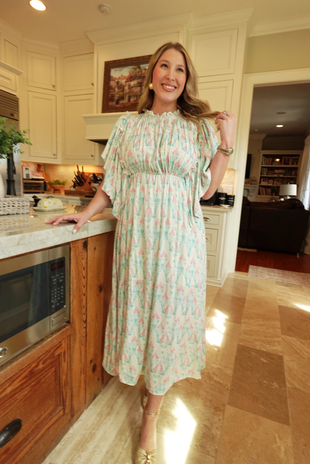 - Printed Midi Dress With Flutter Sleeves + Ruffle Detail
