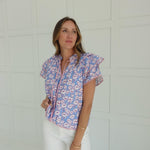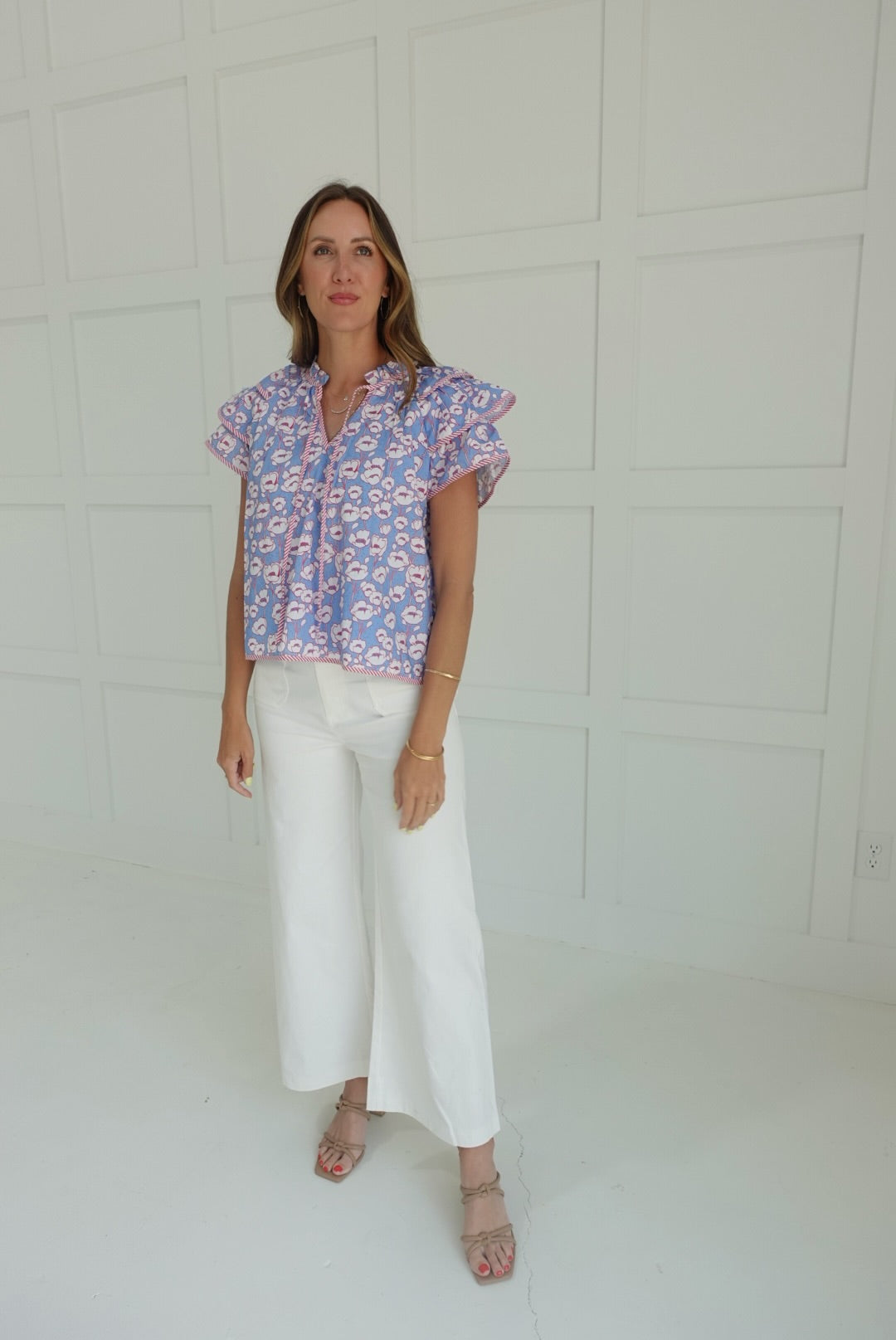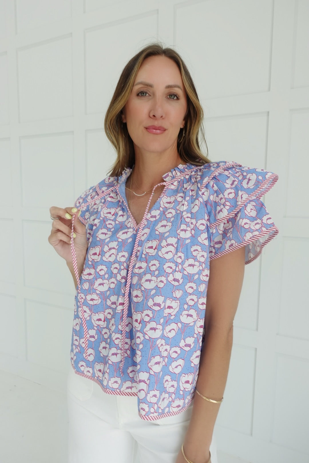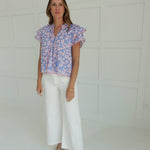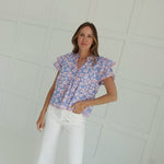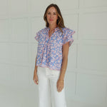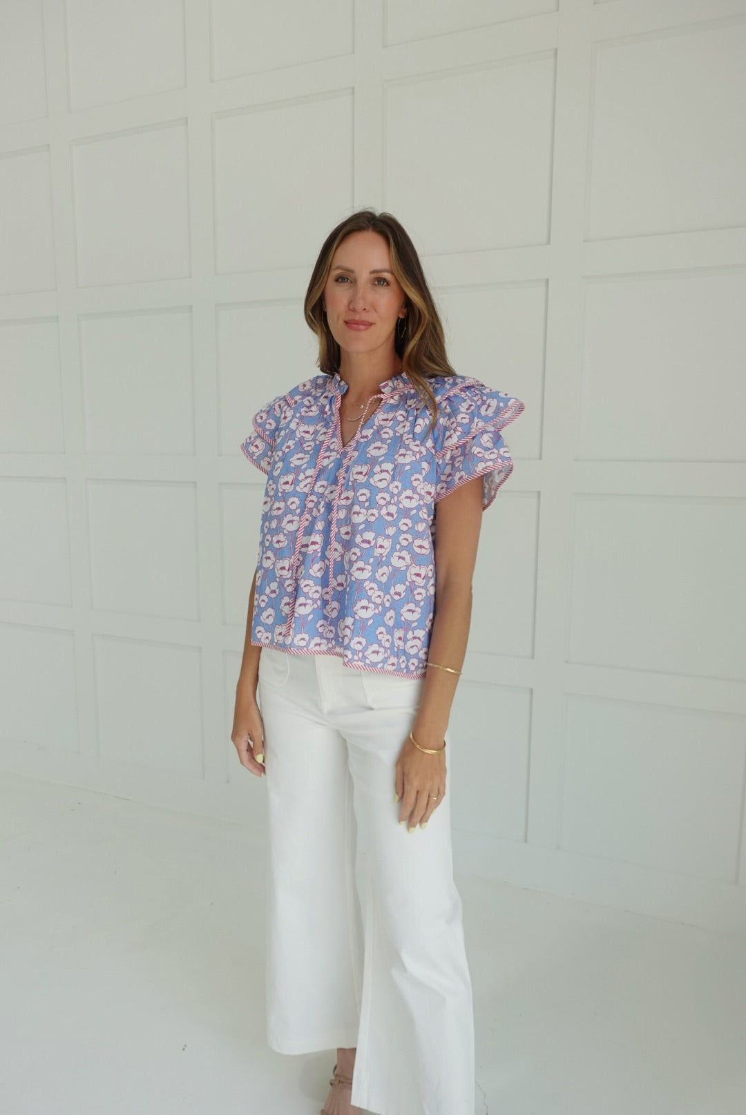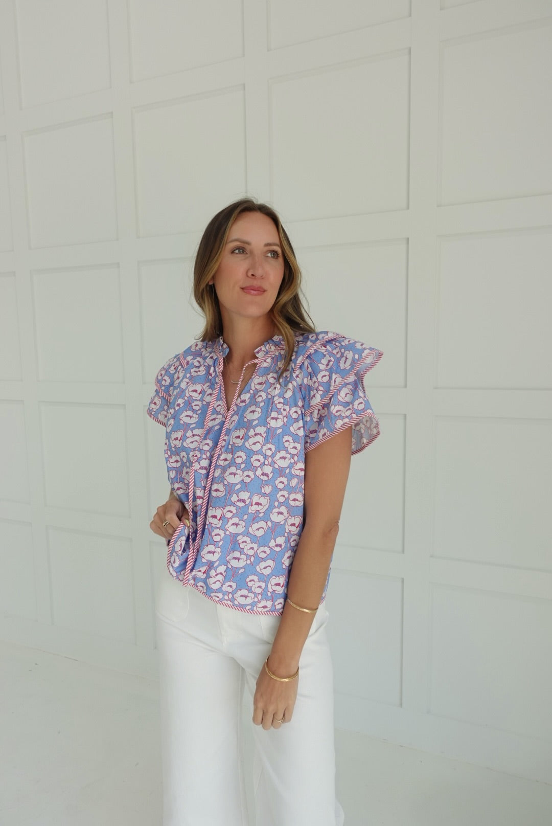 Flutter into fashion with the Dixieland Top in blue! This floral top features a playful contrast band and flutter sleeves, adding a touch of whimsy to any outfit. Perfect for a fun day out, this top will be sure to make you stand out in style!