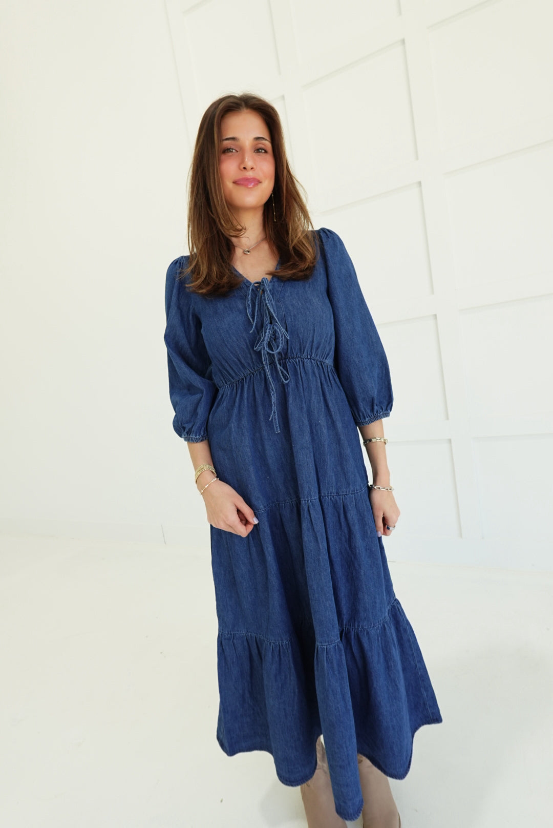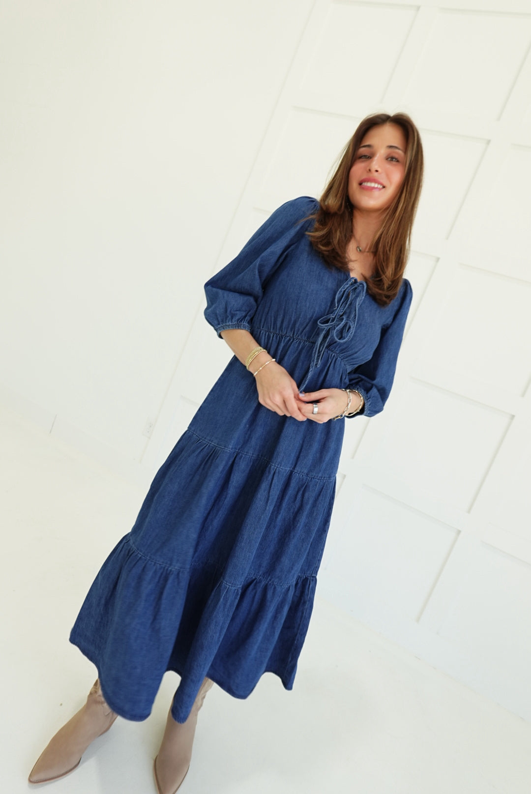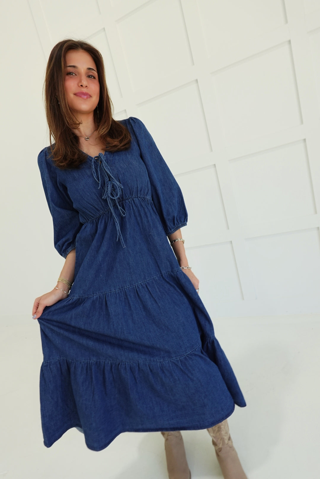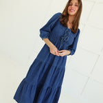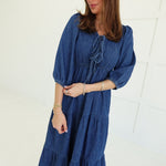 The Dolly Midi Dress commands attention with its bold tiered silhouette and unexpected denim construction. Three-quarter length sleeves frame the shoulders while the cascading tiers create movement and dimension from hip to hem. A font tie detail at the neckline adds an edgy, unconventional touch that refuses to blend in. Perfect for those ready to make a statement—wear it with confidence and let the dress do the talking.