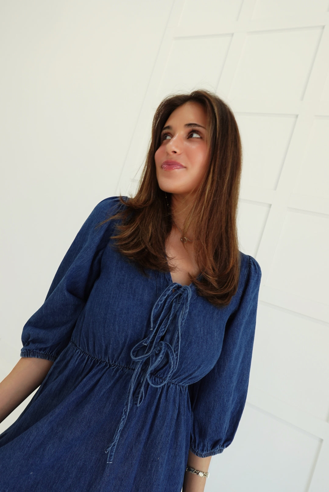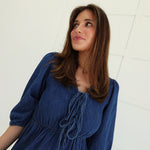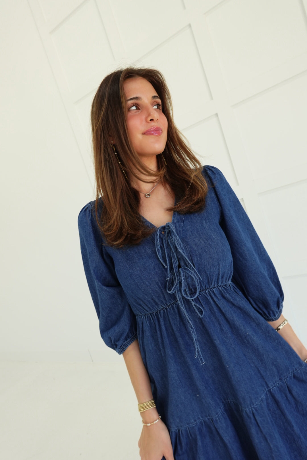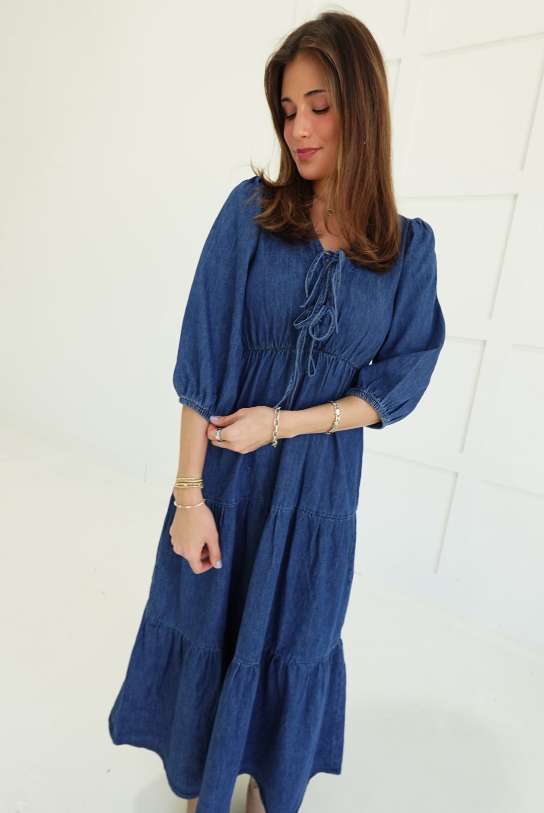 The Dolly Midi Dress commands attention with its bold tiered silhouette and unexpected denim construction. Three-quarter length sleeves frame the shoulders while the cascading tiers create movement and dimension from hip to hem. A font tie detail at the neckline adds an edgy, unconventional touch that refuses to blend in. Perfect for those ready to make a statement—wear it with confidence and let the dress do the talking.