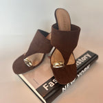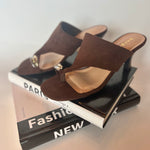 Experience elegance and comfort with the Drake Heel. These suede, sandal-style kitten heels feature a unique big toe slot adorned with gold and silver embellishments, adding a touch of sophistication to your look. Perfect for all-day wear, they combine stylish design with gentle support, making them an ideal choice for both casual and dressy occasions.