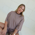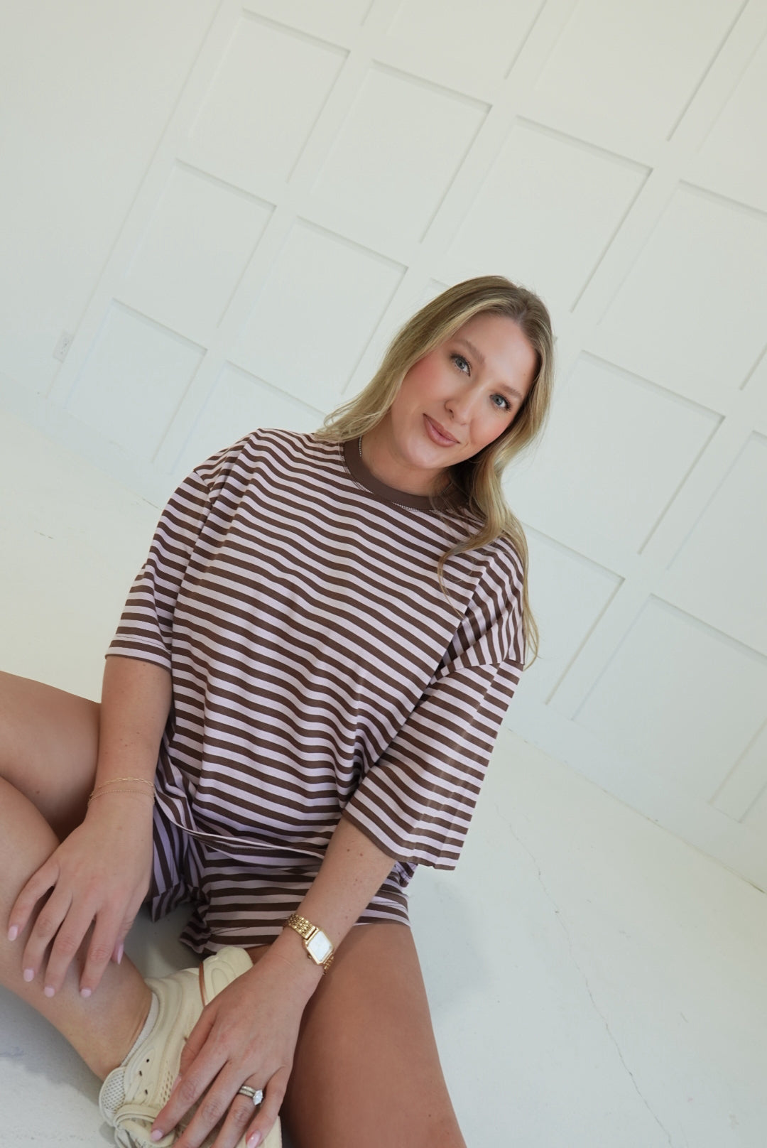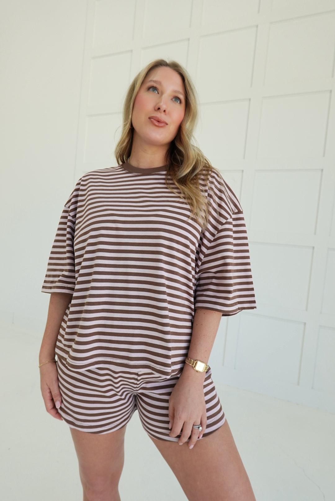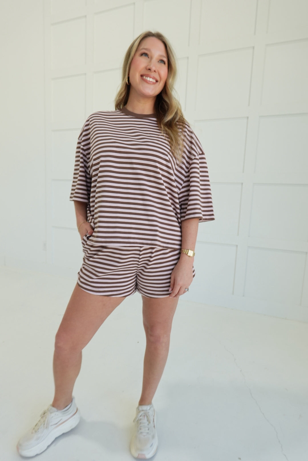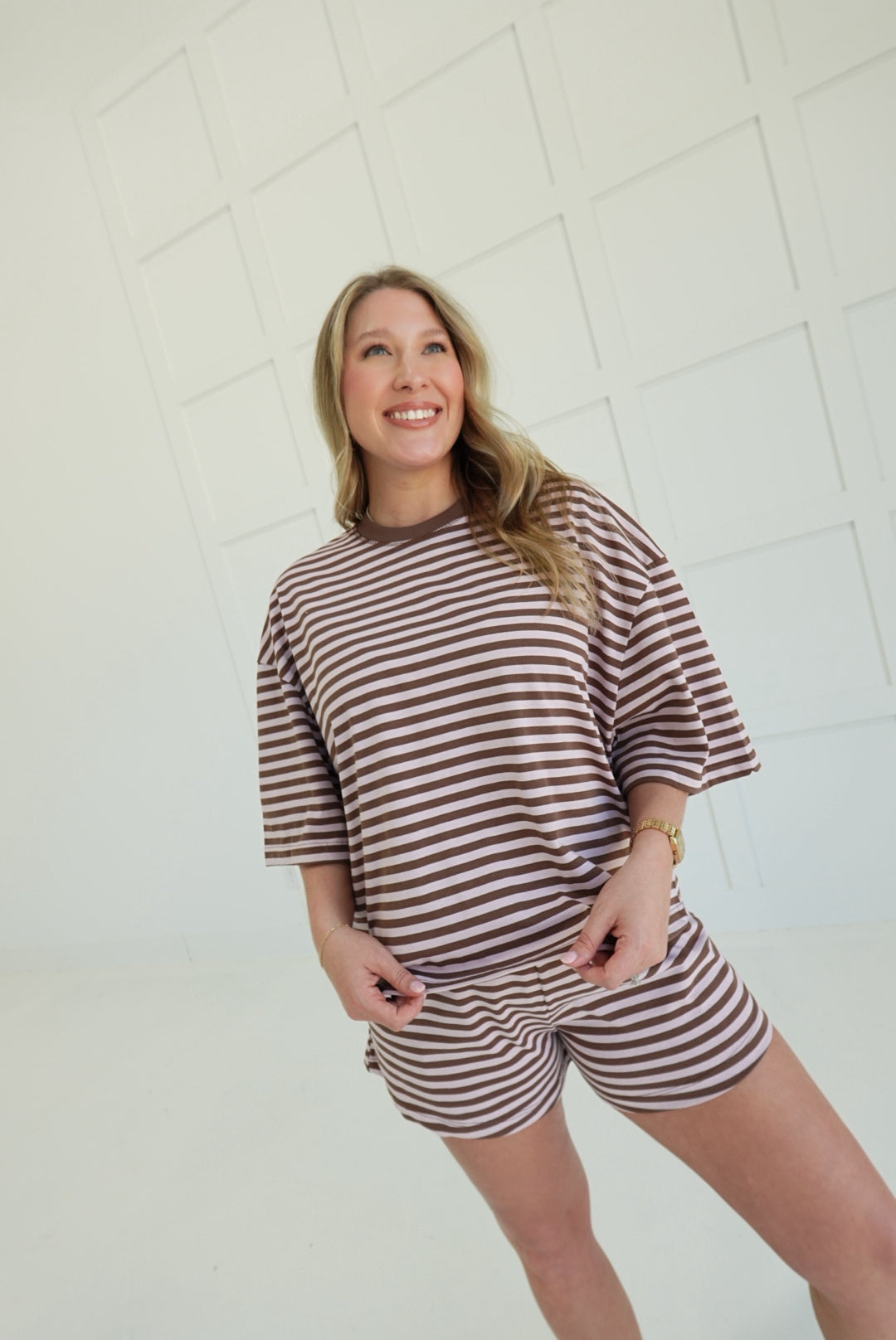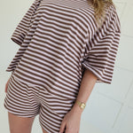 Drew Striped Set - Blue/Brown Embrace effortless cool with this daring two-piece set that refuses to play it safe. The oversized boxy top pairs bold blue and brown stripes with a relaxed silhouette that moves with you, while the elastic-waist shorts deliver comfort without compromise. Real pockets mean you're never hunting for somewhere to stash your essentials. Perfect for those who'd rather turn heads than blend in—throw it on and own the room.
