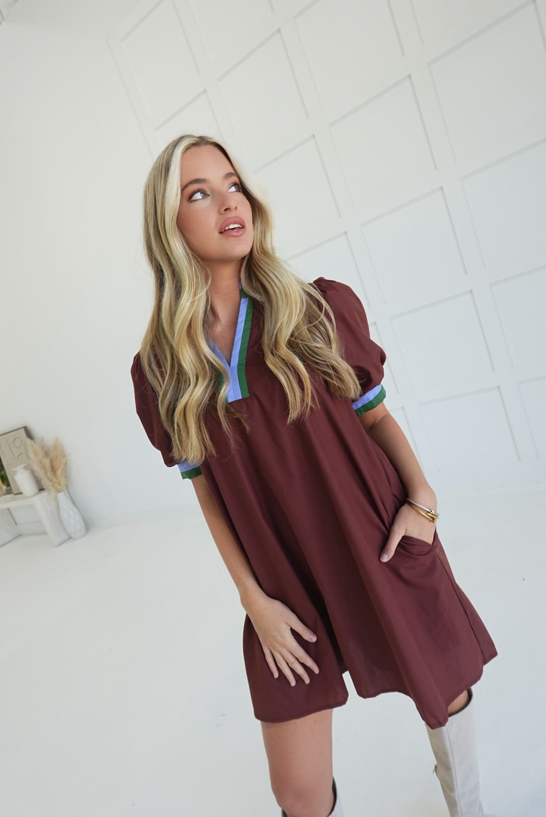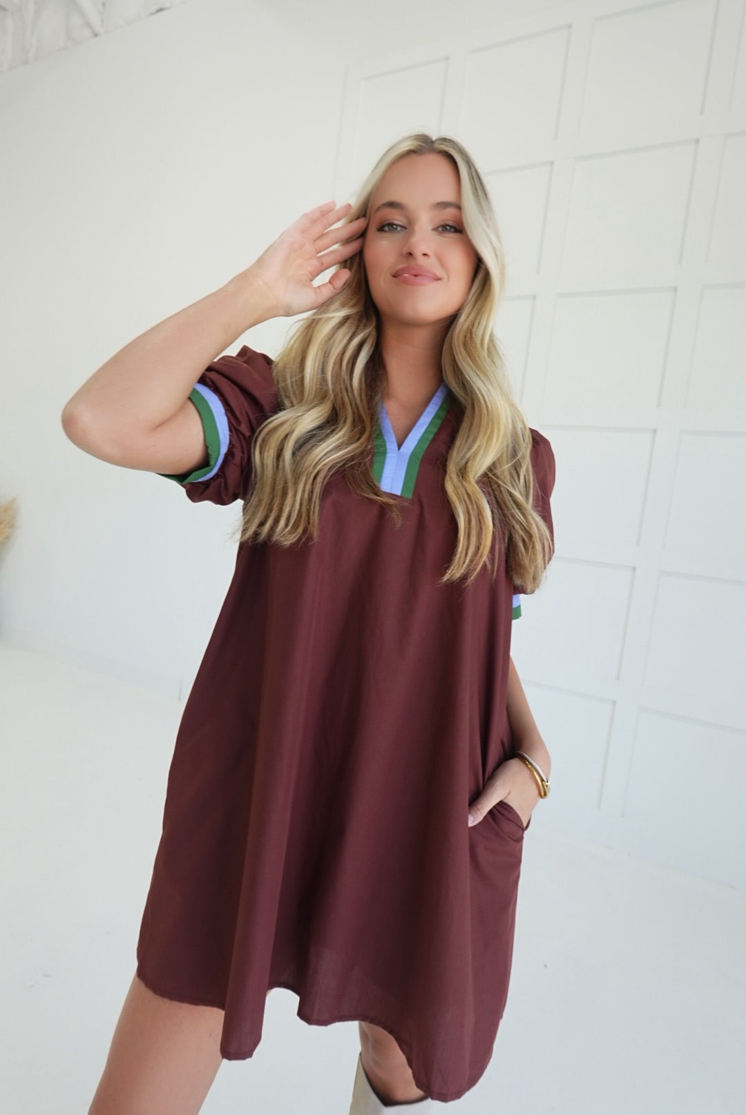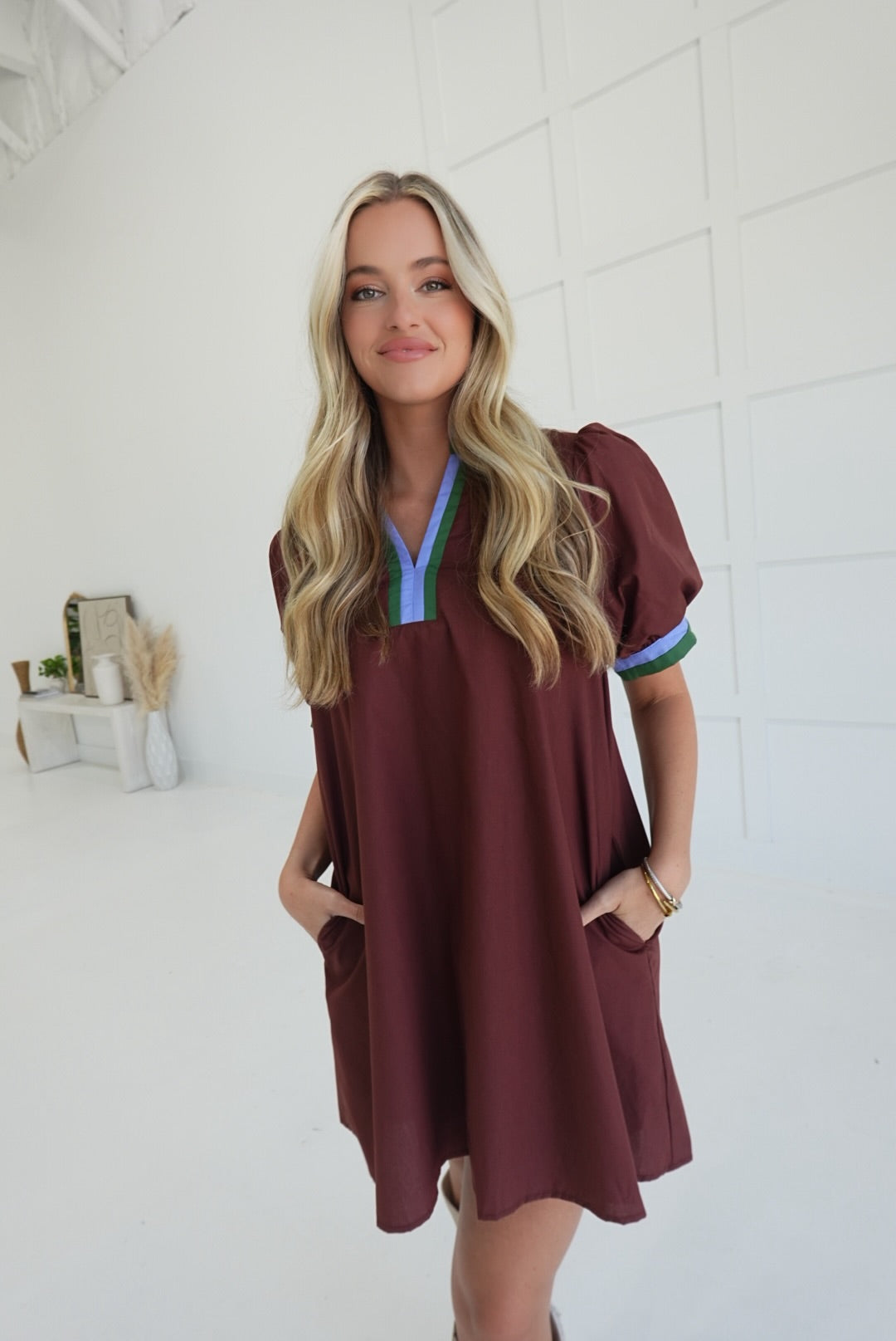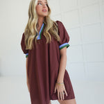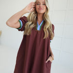The Dudley Mini Dress offers effortless style with its solid color and vibrant multicolor band accent. Designed with side pockets and a lightweight woven fabric, it ensures comfort and practicality for all-day wear. Fully lined and non-sheer, this short sleeve pullover dress is perfect for staying cool while looking polished.