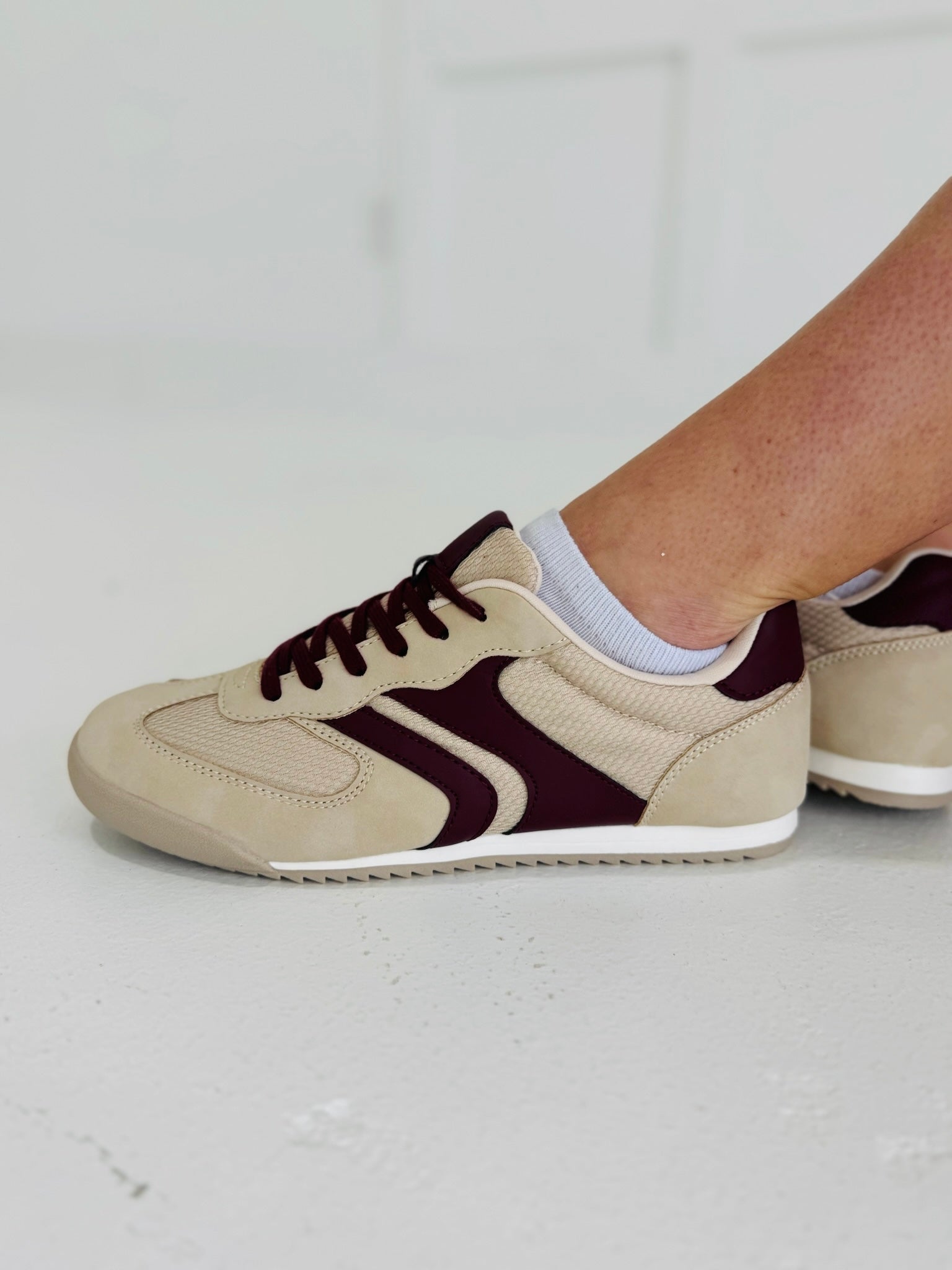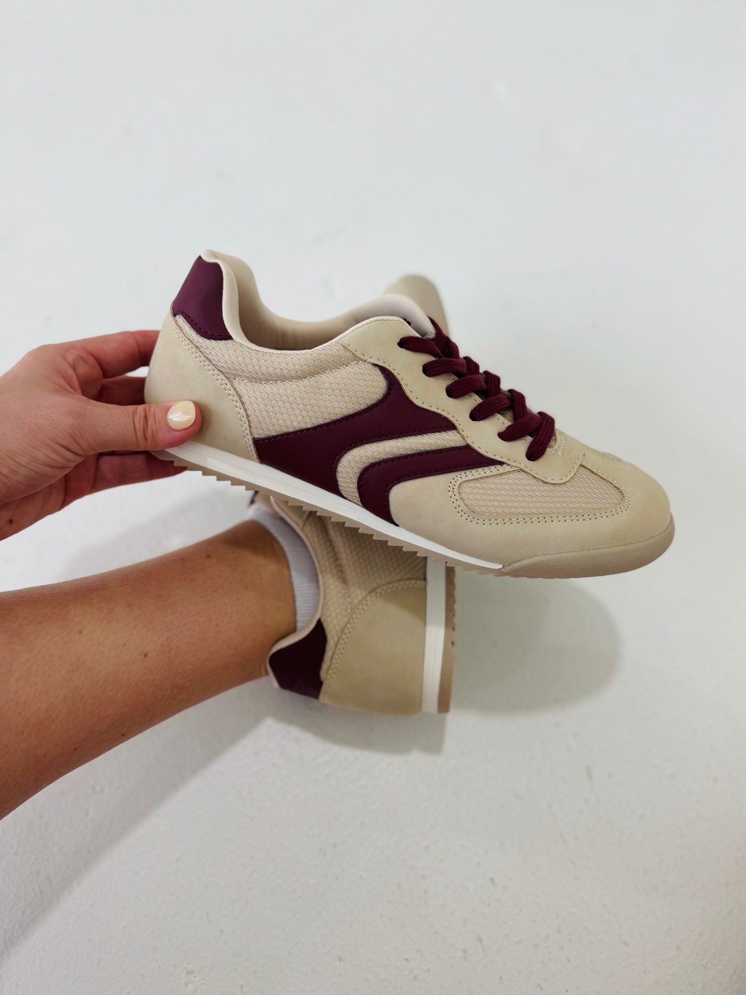 The Dudy Sneaker commands attention with its bold beige canvas paired with striking wine stripes that refuse to blend in. This isn't your everyday neutral—it's a statement piece that bridges the gap between understated elegance and fearless style. The contrasting wine detailing adds an unexpected edge, making it the perfect choice for those who play it safe nowhere else. Whether you're elevating a casual outfit or grounding something daring, the Dudy delivers versatility without compromise. Built for the woman who knows exactly what she wants and isn't afraid to wear it.
