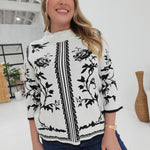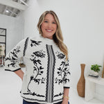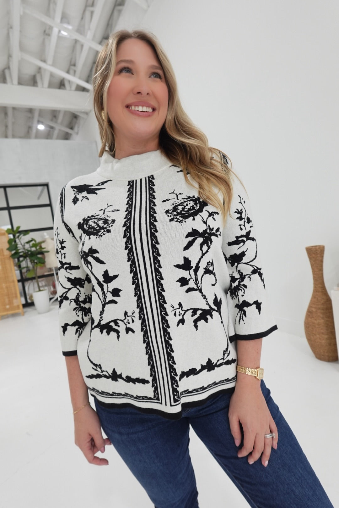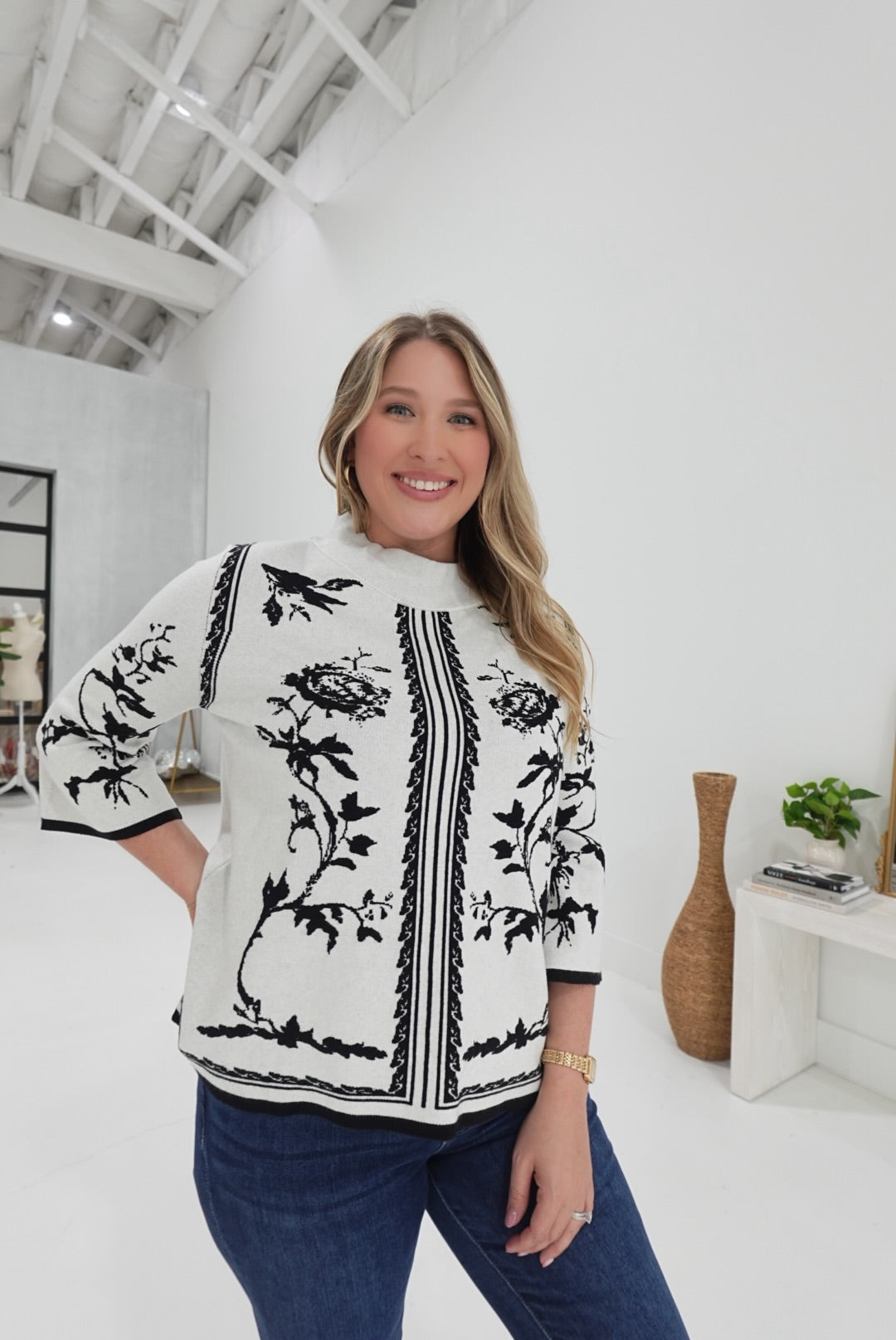 The Dying Romance Sweater features a distinctive contrast border pattern that adds a stylish edge to its classic jacquard knit design. Its mock neck provides gentle warmth and comfort, making it perfect for cooler days. This sweater combines eye-catching detail with cozy wearability, supporting your wardrobe with both fashion and function.
