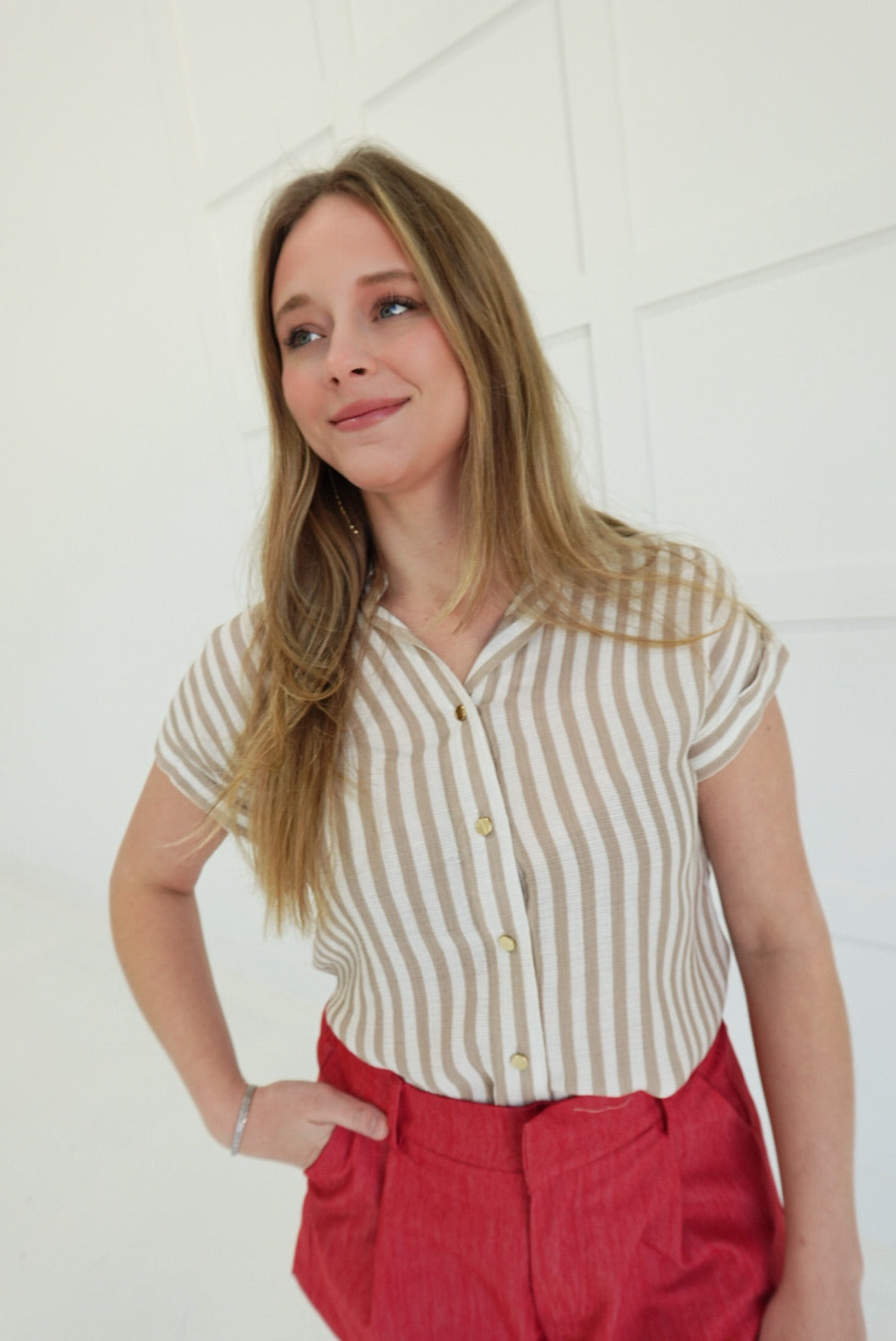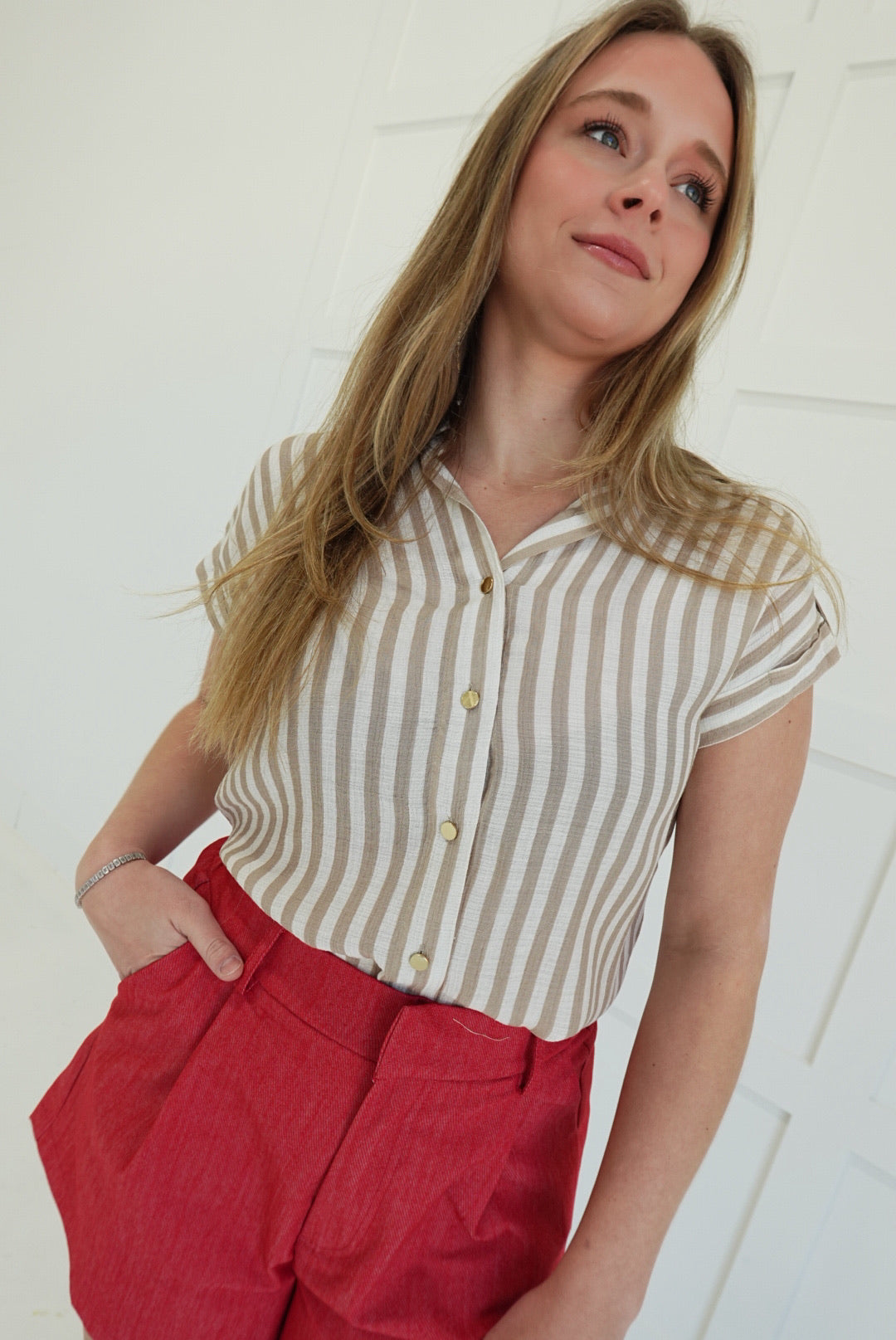 Effortlessly chic meets undeniable edge. This woven top strips away excess with bold horizontal stripes and a featherweight construction that moves with you—not against you. The palette grounds any outfit while the crisp woven fabric breathes through warm days and layered seasons alike. Versatile enough to command attention solo or play supporting role to your boldest pieces. A wardrobe essential that refuses to be boring.