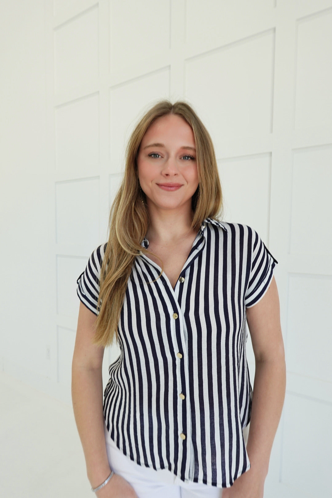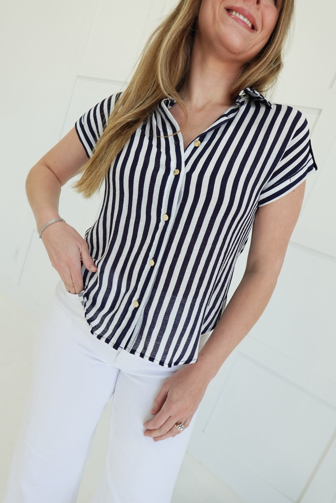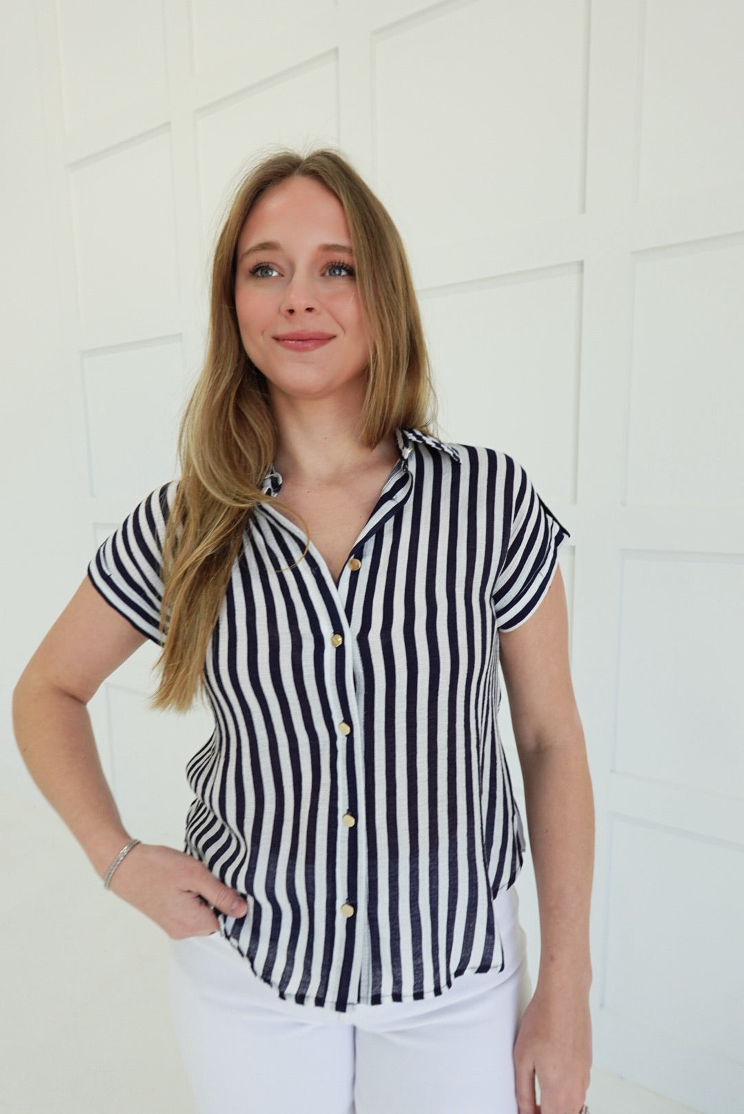 Effortlessly chic meets undeniable edge. This woven top strips away excess with bold horizontal stripes and a featherweight construction that moves with you—not against you. The palette grounds any outfit while the crisp woven fabric breathes through warm days and layered seasons alike. Versatile enough to command attention solo or play supporting role to your boldest pieces. A wardrobe essential that refuses to be boring.