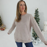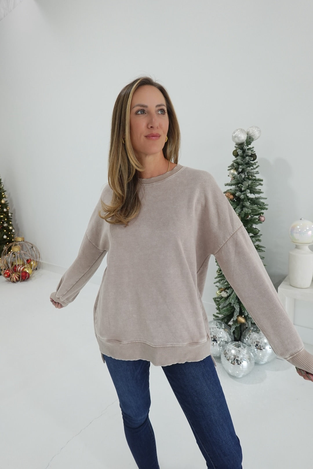 Introducing the Easier Said Pullover in Ash Mocha. With a unique acid wash print and trendy hi low side slit hem, this pullover is perfect for those who want to elevate their casual look. Made for comfort and style, it's easier said than done!