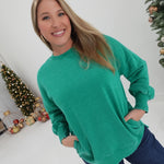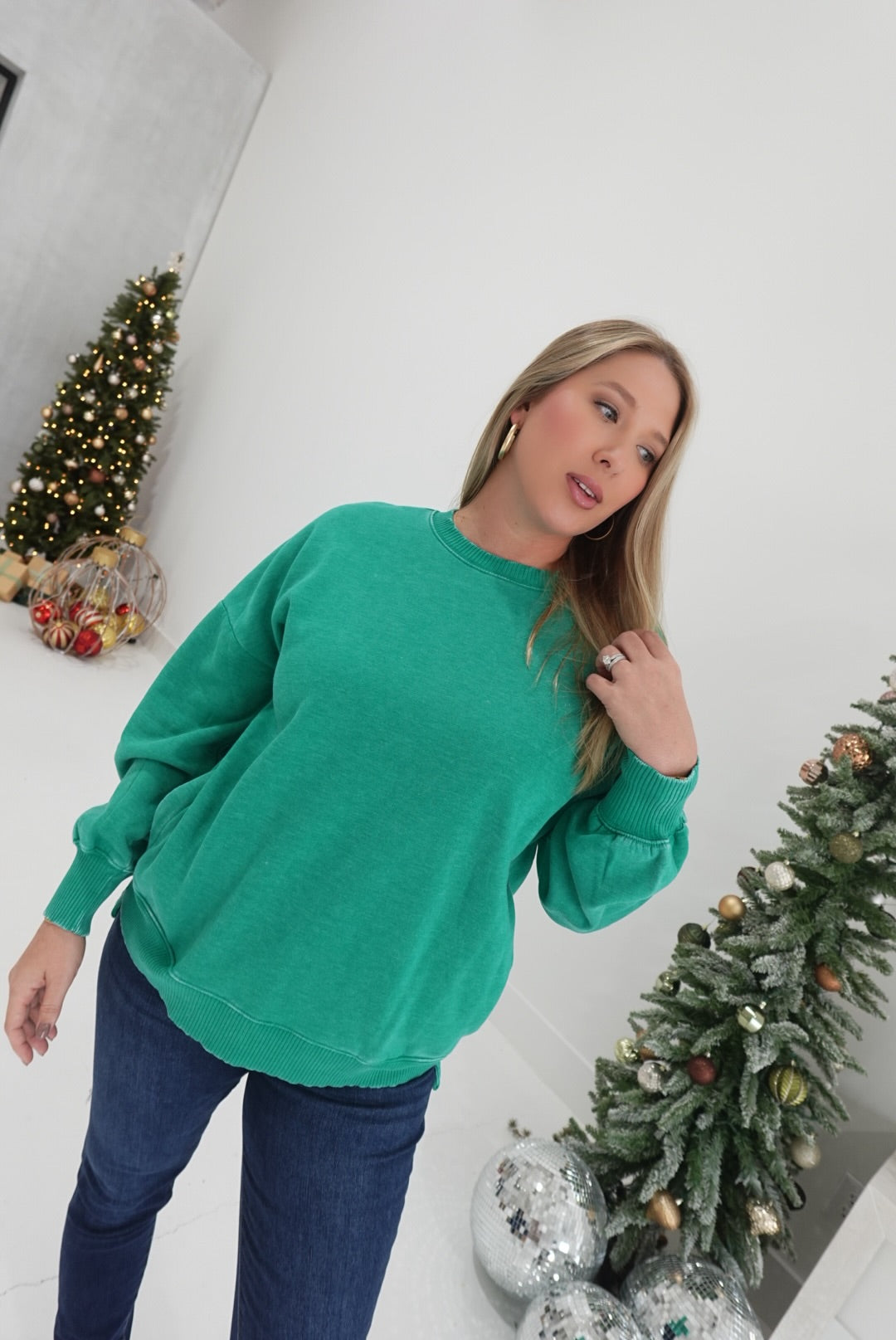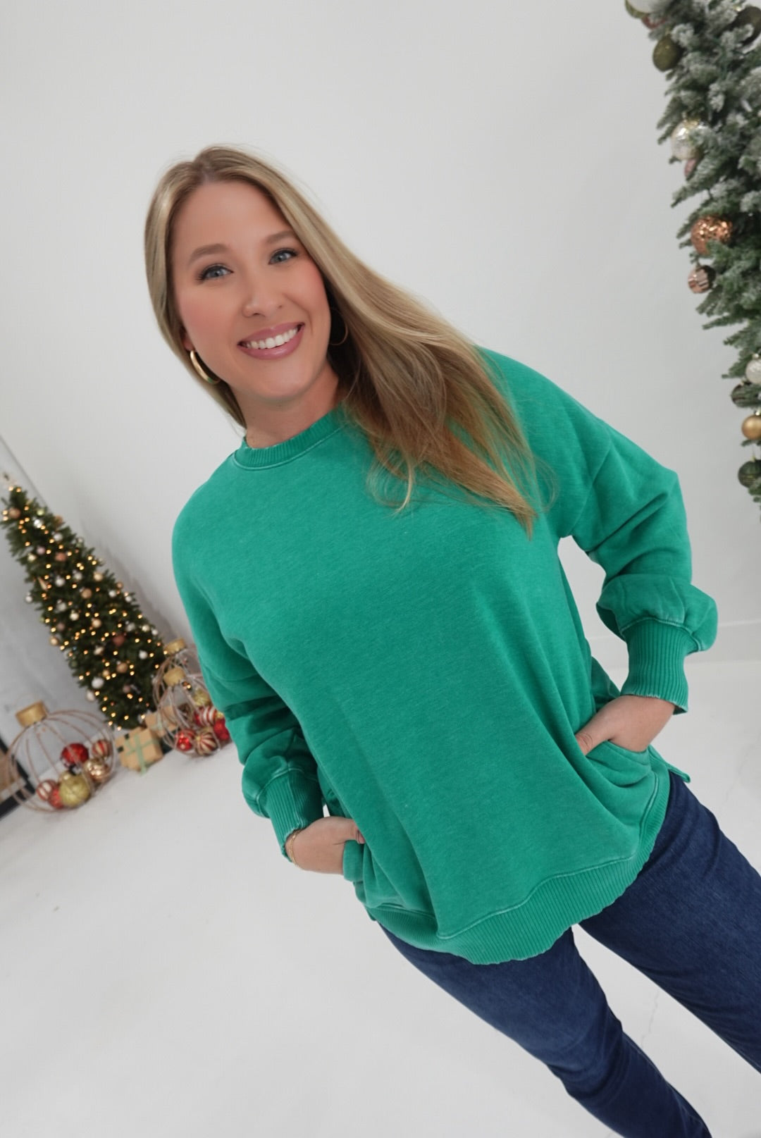 Introducing the Easier Said Pullover. With a unique acid wash print and trendy hi low side slit hem, this pullover is perfect for those who want to elevate their casual look. Made for comfort and style, it's easier said than done!
