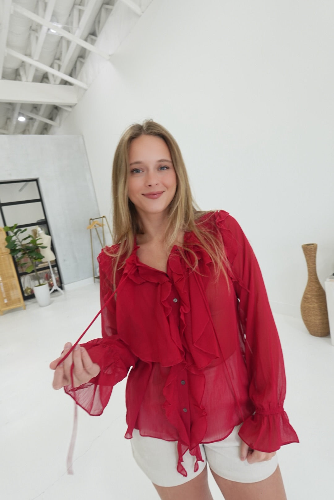 Embrace elegance with the Edge of Youth Blouse in vibrant red. Crafted from sheer chiffon, its delicate fabric offers light, breathable comfort, while soft ruffle details add a graceful, feminine touch perfect for layering or wearing solo. This blouse complements your style effortlessly, providing a polished look that supports your confidence throughout the day.