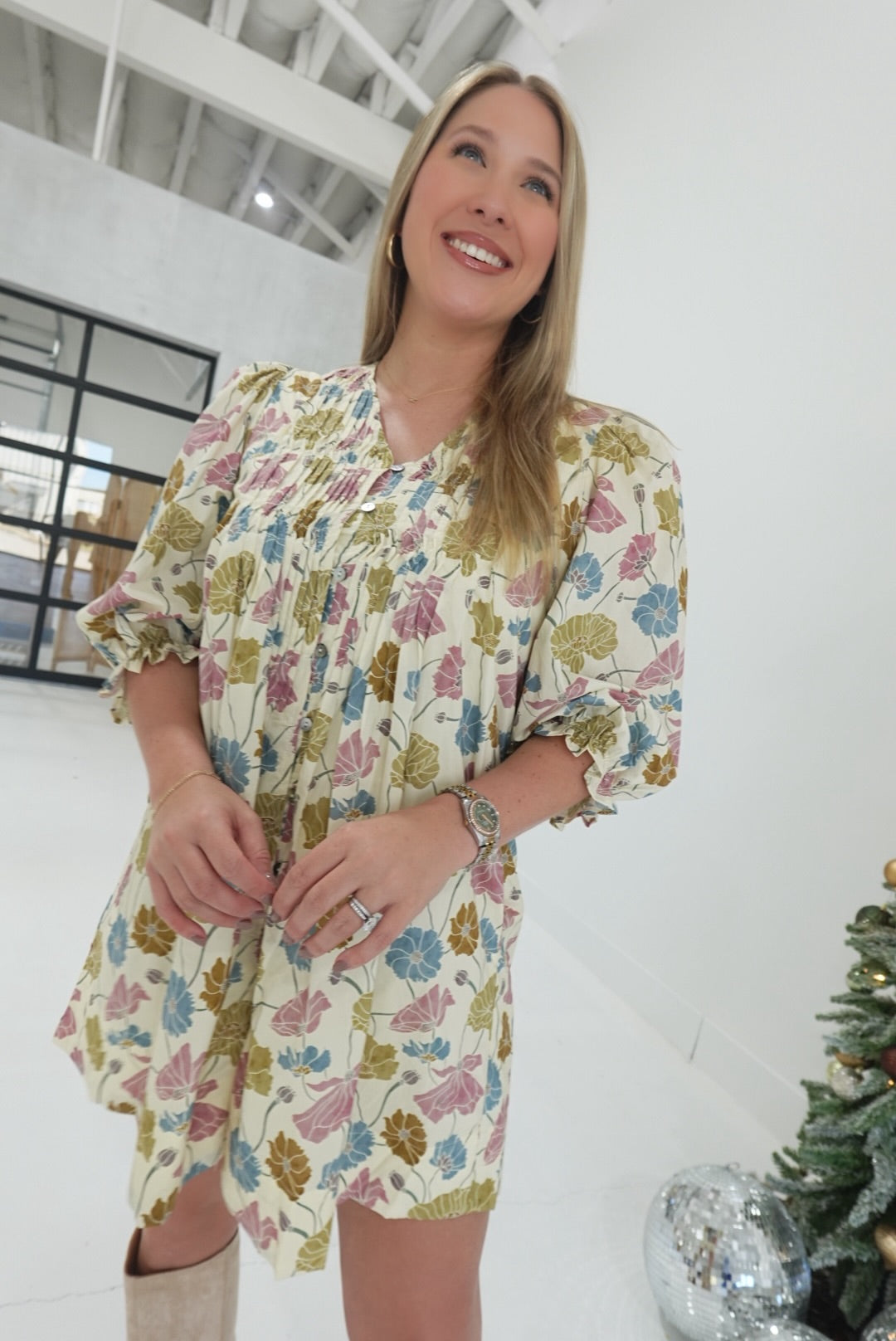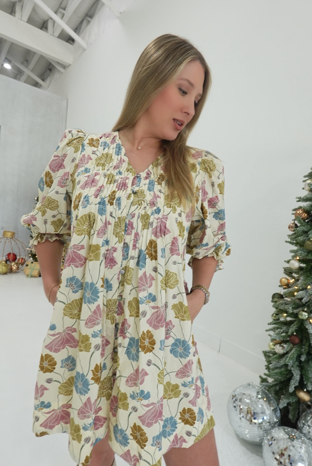 Embrace effortless style with this charming floral mini dress. The pintucked bodice adds sophisticated texture while the V-neck creates a flattering silhouette. Three-quarter sleeves offer versatile coverage, and practical side pockets keep essentials within reach. A front button closure makes dressing simple, while elasticated cuffs ensure a polished fit. Fully lined and crafted from lightweight woven fabric, this non-sheer dress moves beautifully with you through any season. Perfect for transitioning from day to evening with confidence and comfort.