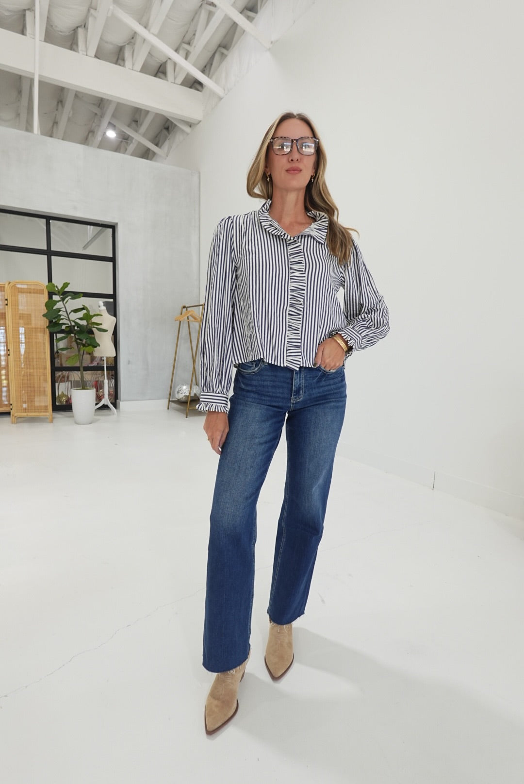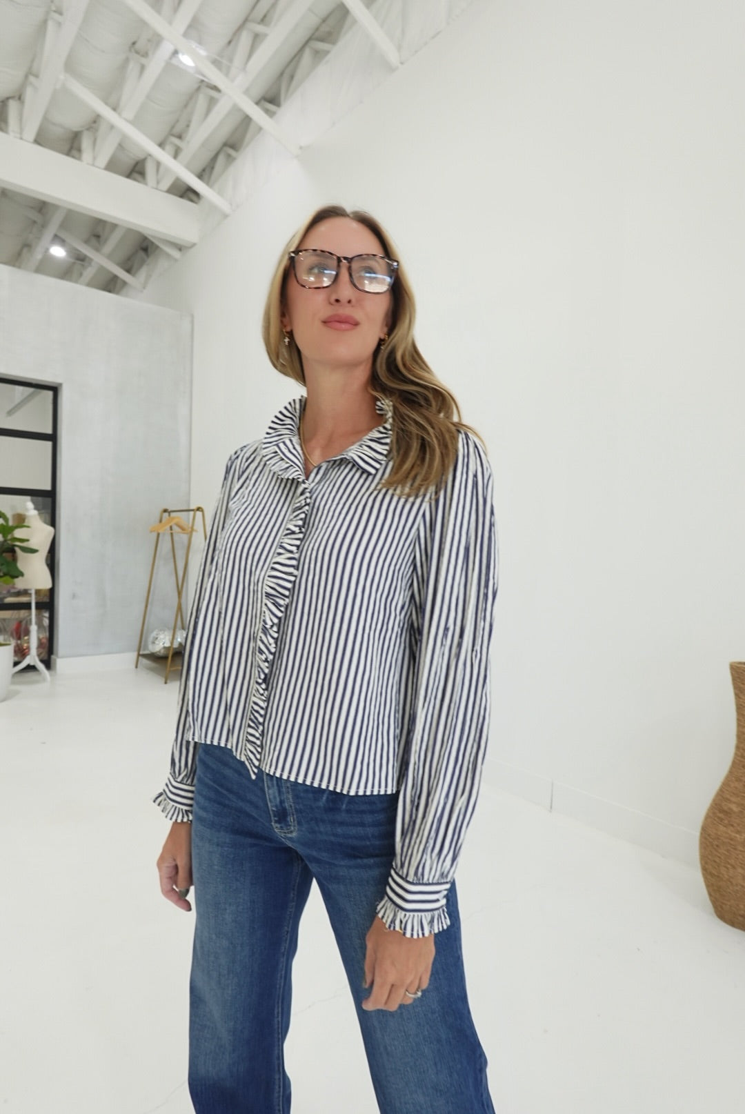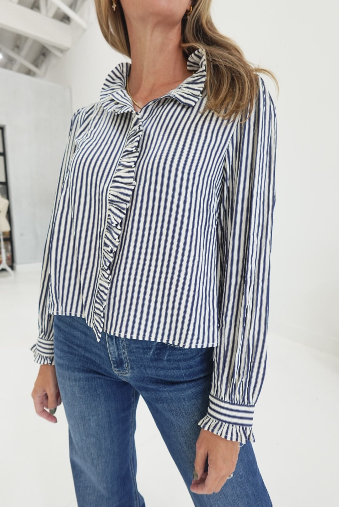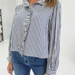 The Elite Ruffle Top combines classic button-down style with a playful striped pattern and delicate ruffle detailing. Its long sleeves offer versatile coverage, making it perfect for layering or wearing on its own. This top adds a feminine touch to any outfit while providing comfortable wear throughout your day.