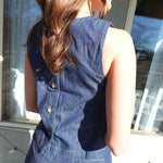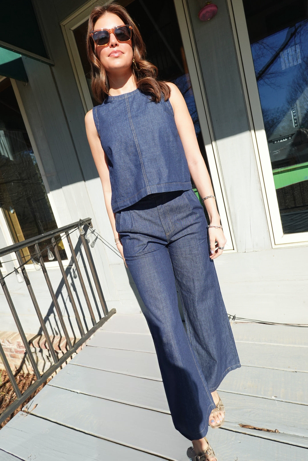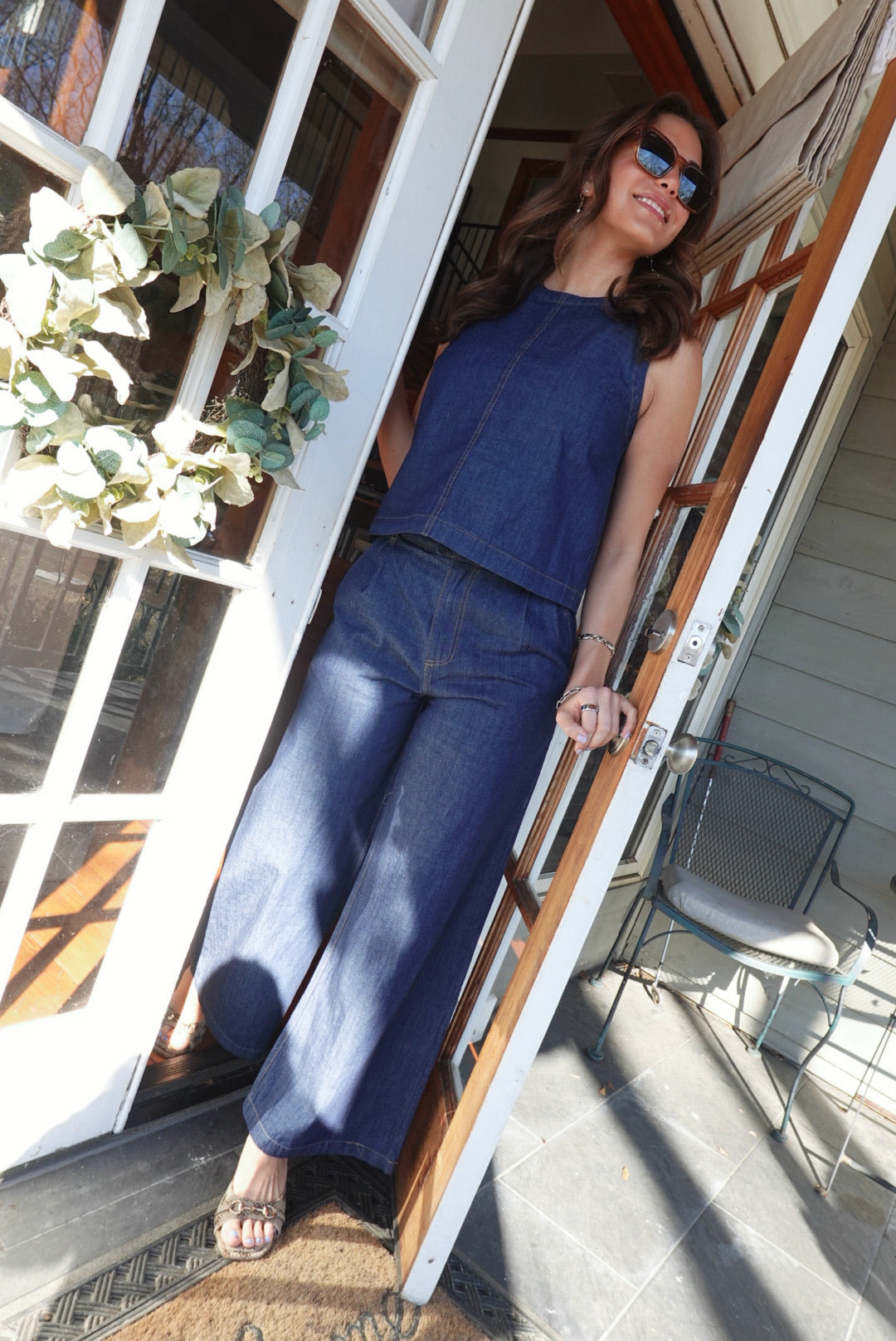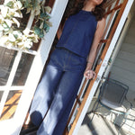 Ellanie Denim Set Command the room in this fearless two-piece. The sleeveless boat neck top features a striking back button detail that demands attention, while the high-waist pleated wide-leg pants deliver bold silhouette and movement. Crafted in premium denim, this set balances editorial sophistication with unapologetic attitude—perfect for those ready to make a statement.