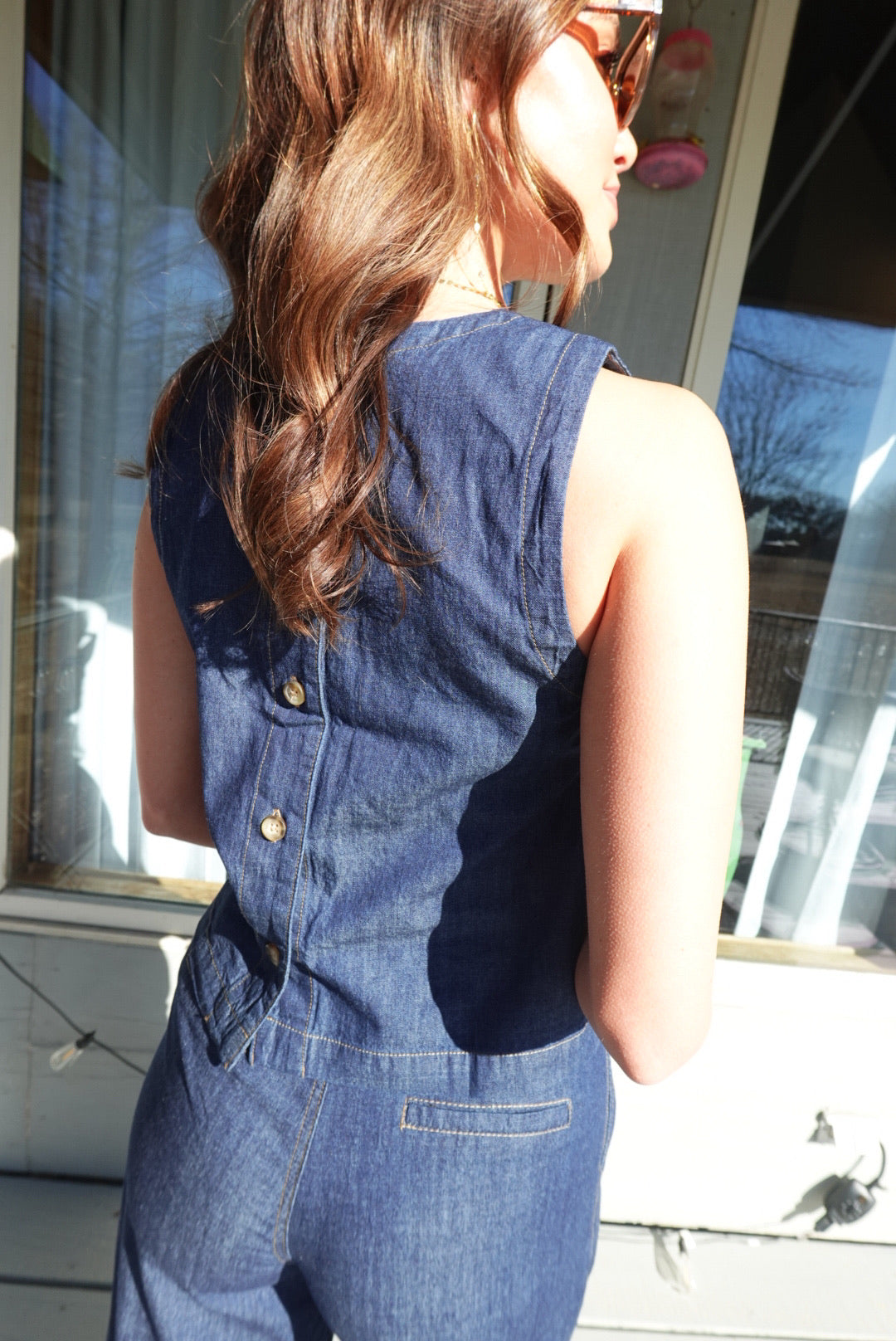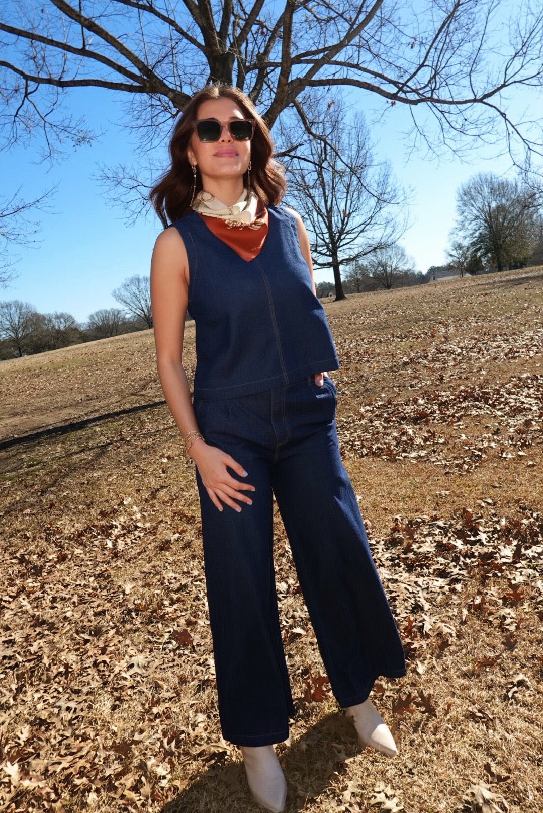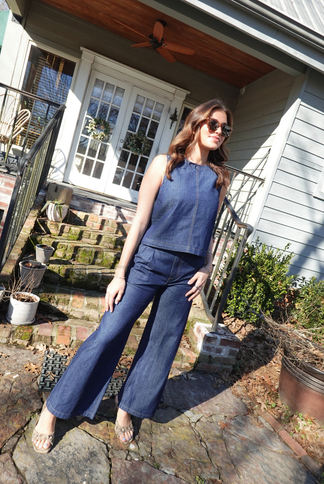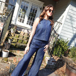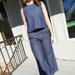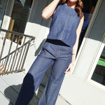 - Denim Set - High Waist Pleated Pants + Boat Neck, Back Button Detail Top
