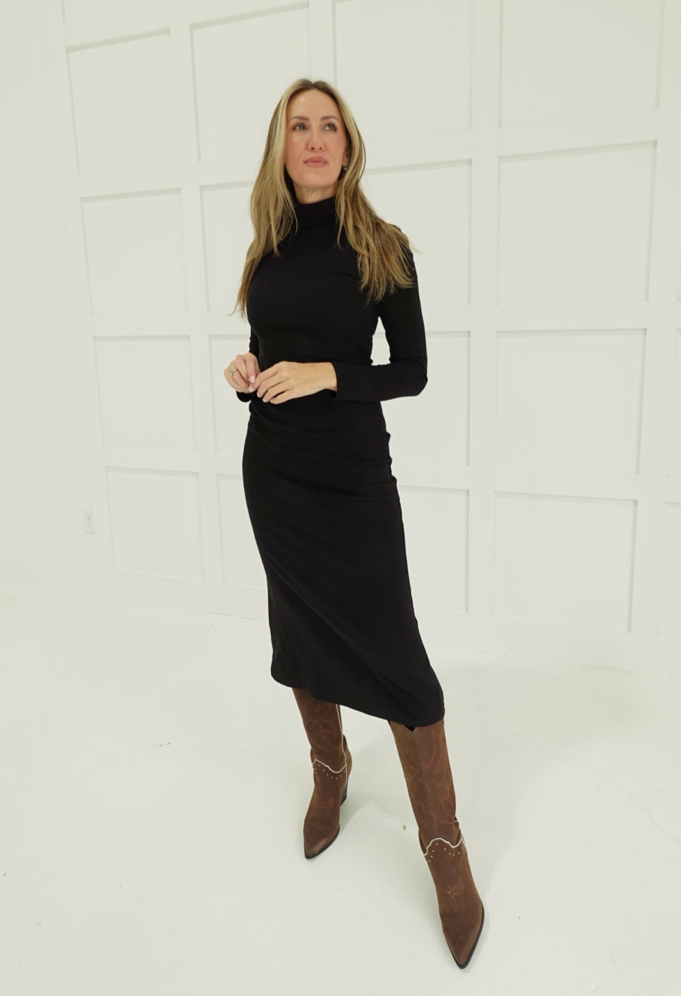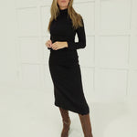 The Evenings Like These Midi Dress offers cozy warmth and comfortable style with its long sleeves and soft brushed ribbed knit fabric. The turtleneck adds a touch of elegance, while the midi length creates a flattering silhouette for any occasion. Perfect for cooler days, this dress embraces you with gentle warmth and effortless sophistication.