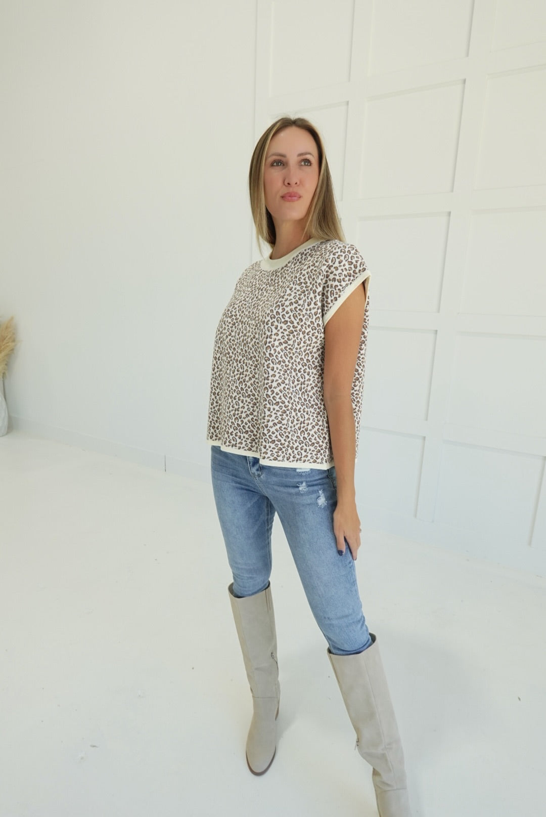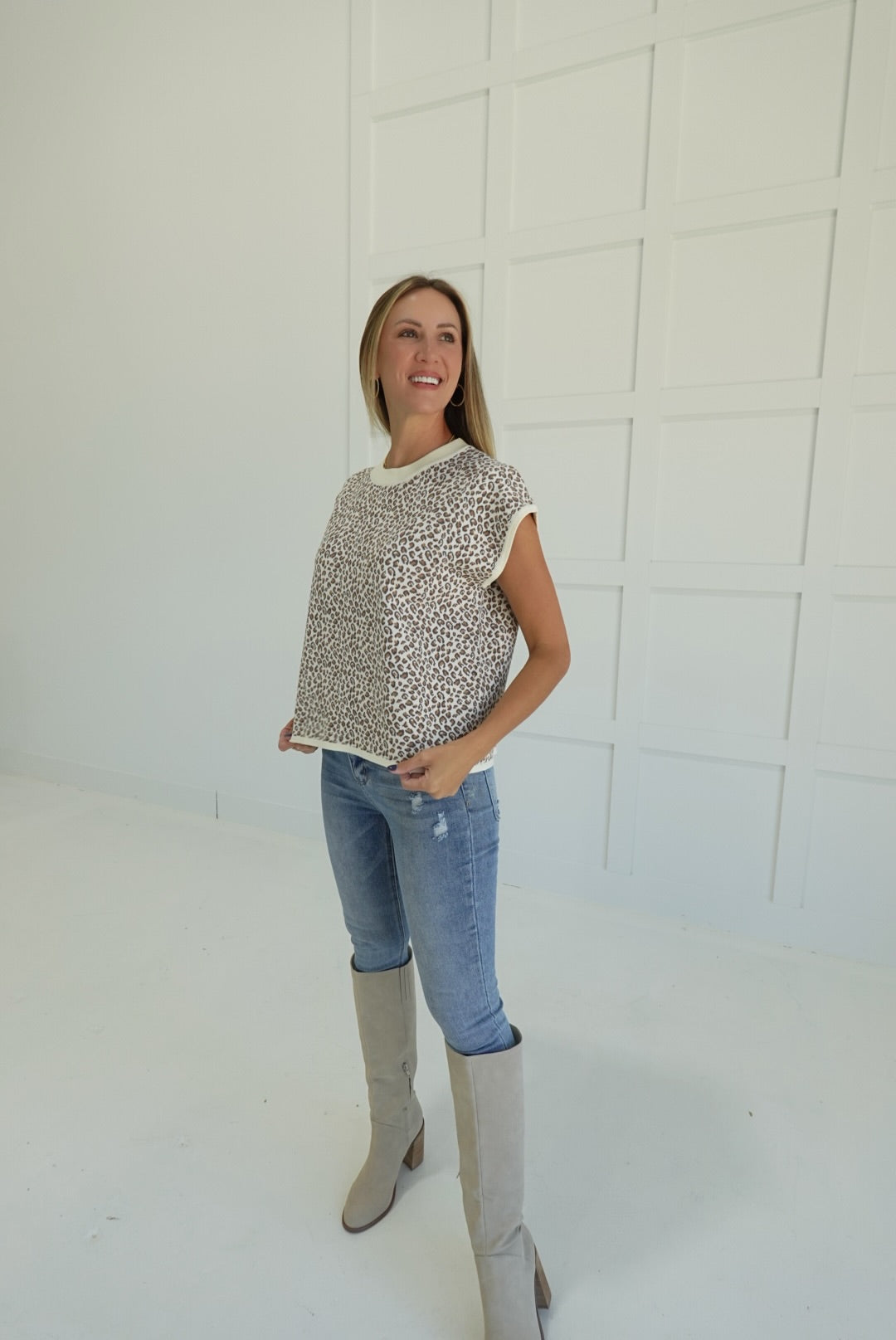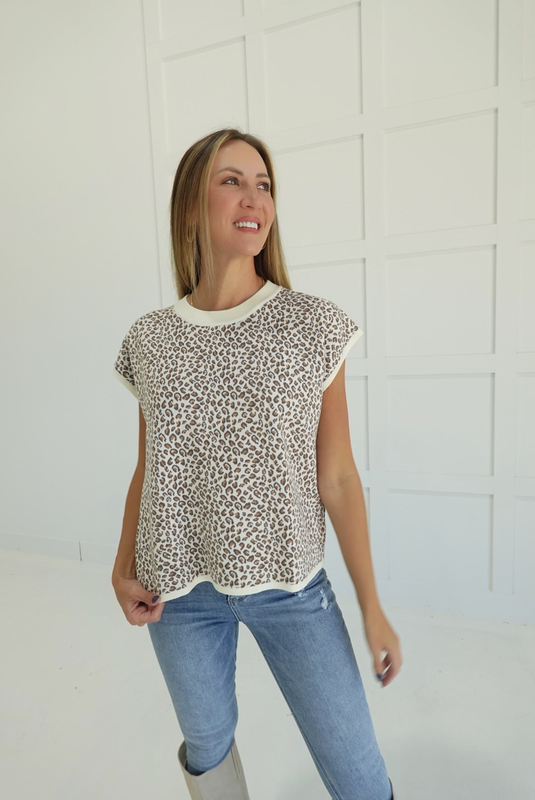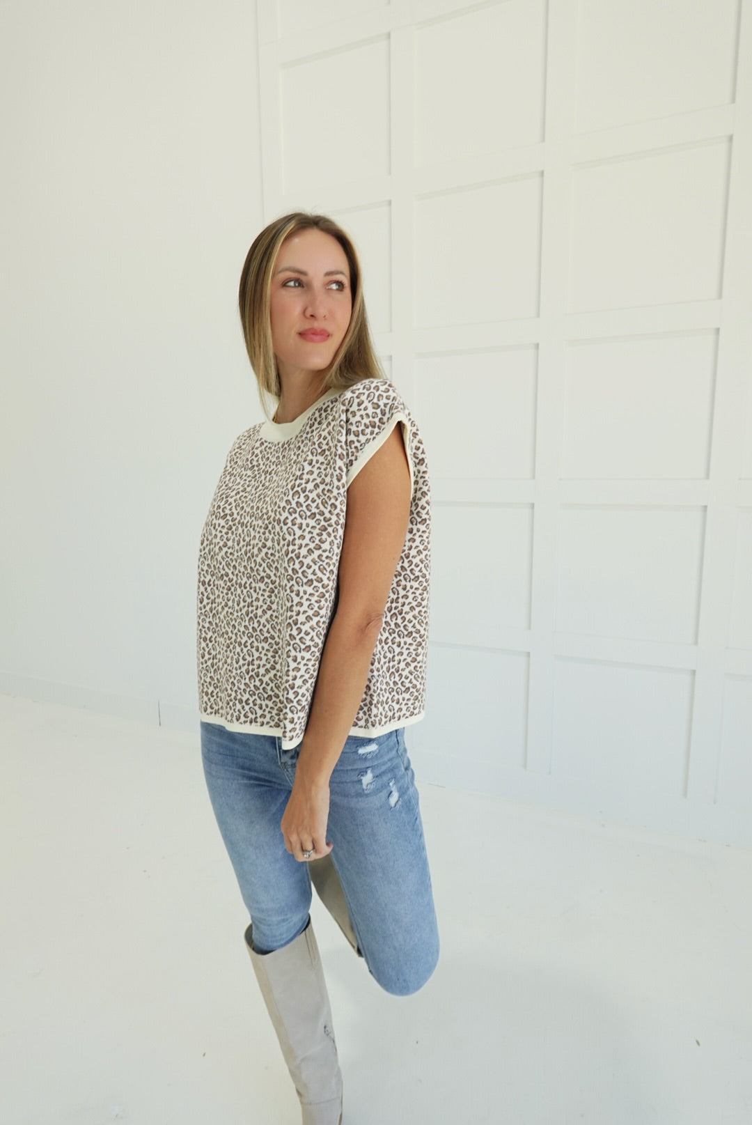 The Expectations Sweater Top showcases a leopard pattern on a contemporary muscle-cut design. Expertly crafted from premium sweater knit material, this pullover delivers exceptional texture and durability while maintaining shape through extended wear. The strategic muscle silhouette offers shoulder definition with a relaxed body fit, creating a balanced proportion that flatters various body types. An essential statement piece for transitional wardrobes.