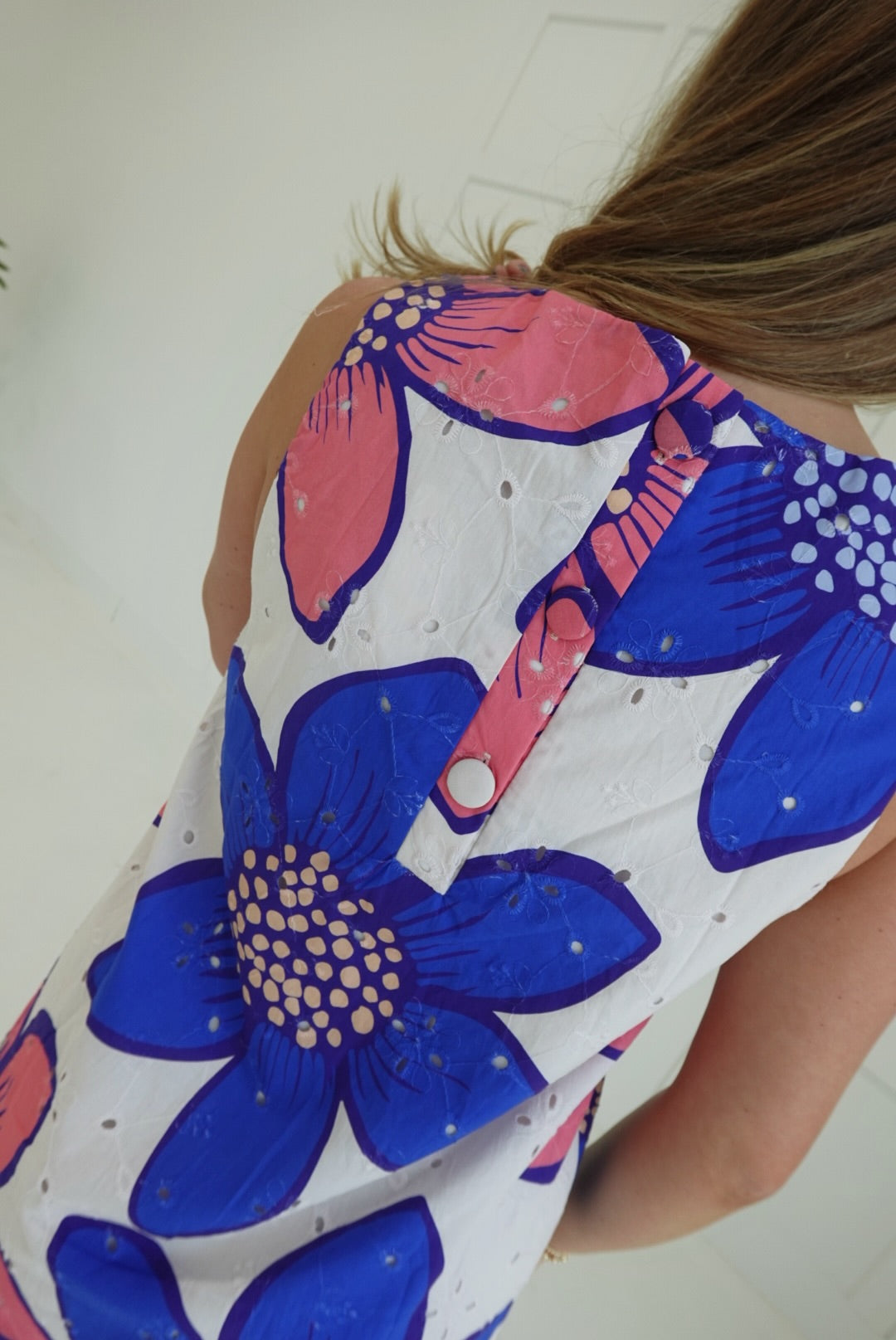 The Eyes on Me Dress features a large floral print and a sleeveless design, making it a playful and charming choice for warm days. Crafted with delicate eyelet fabric, this dress offers both breathability and a touch of elegance. Its fun and cute style is perfect for adding a fresh, lively vibe to your wardrobe.