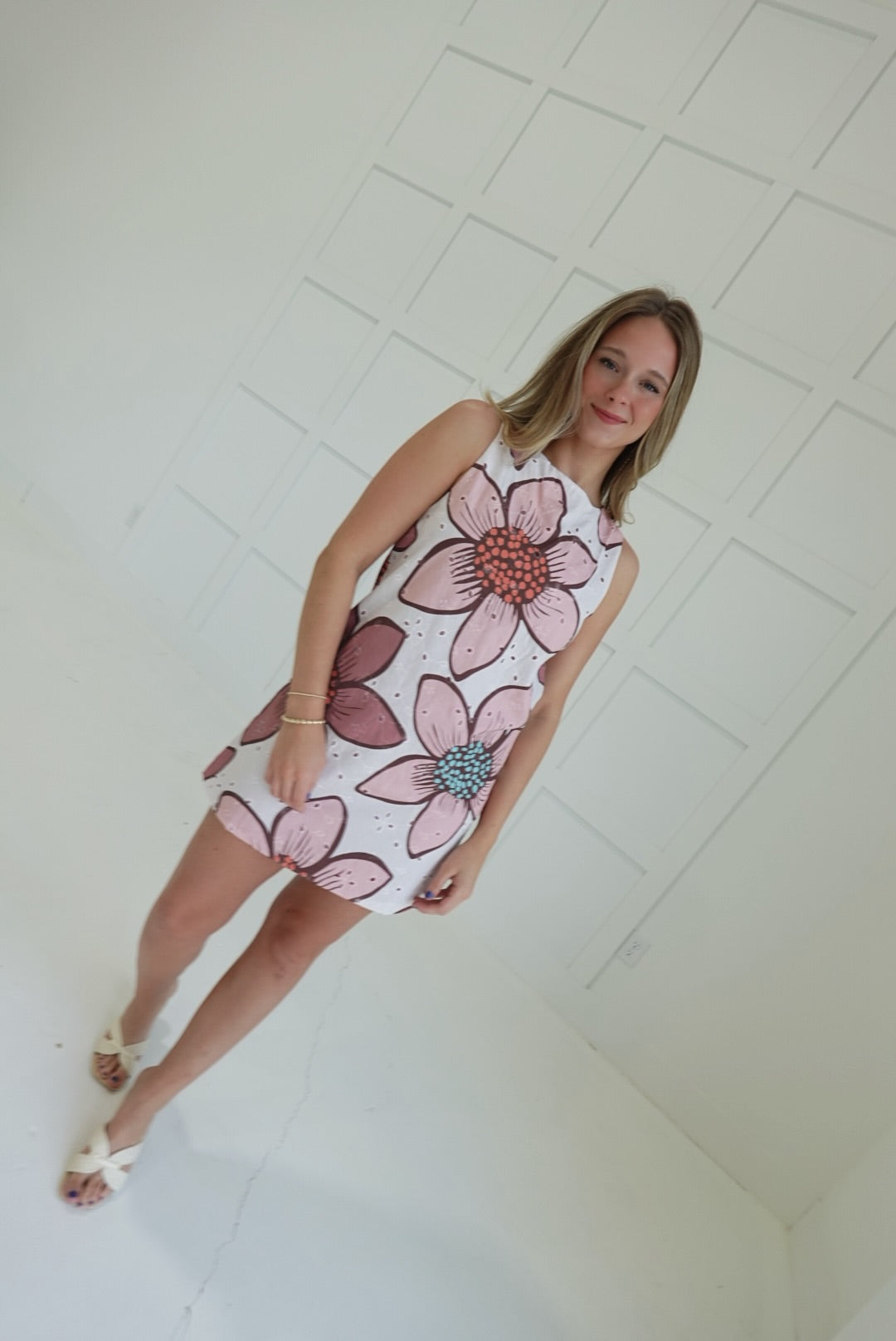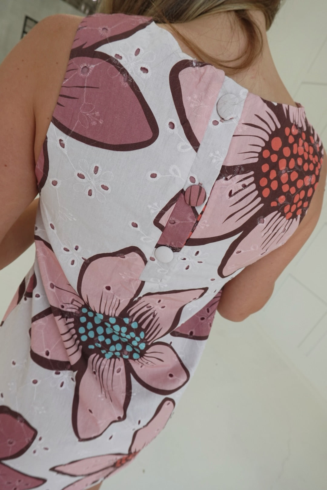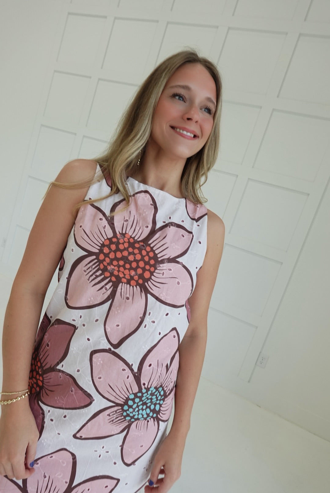 The Eyes on Me Dress features a large floral print and a sleeveless design, making it a playful and charming choice for warm days. Crafted with delicate eyelet fabric, this dress offers both breathability and a touch of elegance. Its fun and cute style is perfect for adding a fresh, lively vibe to your wardrobe.