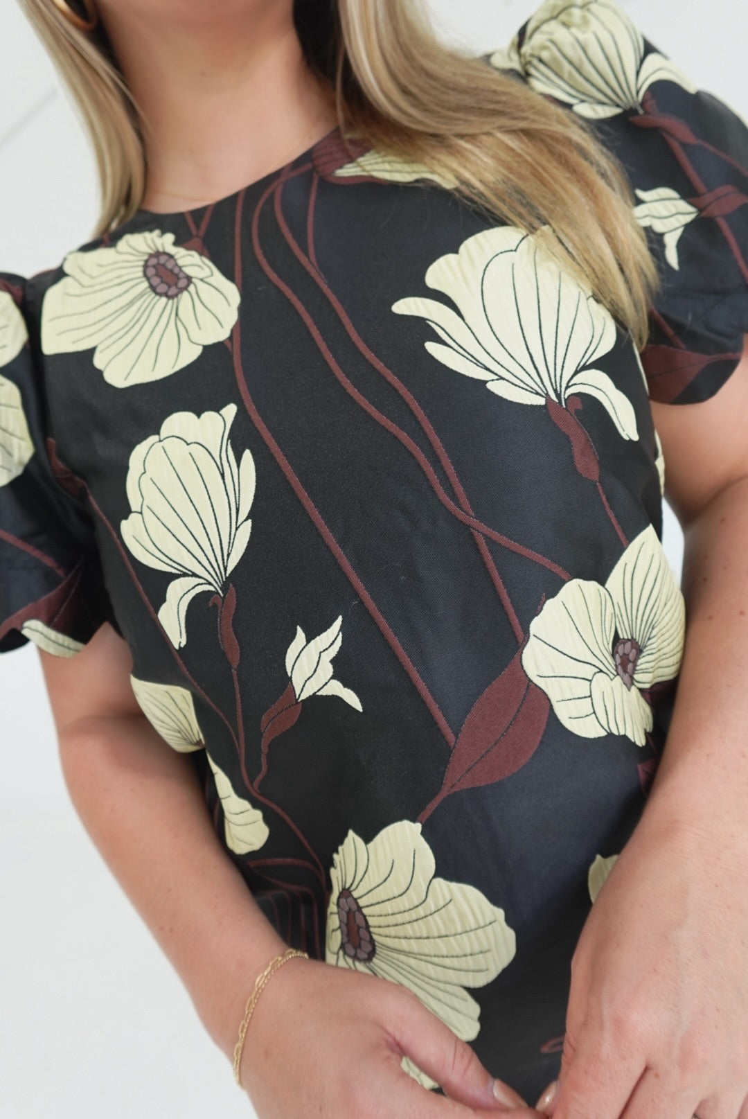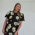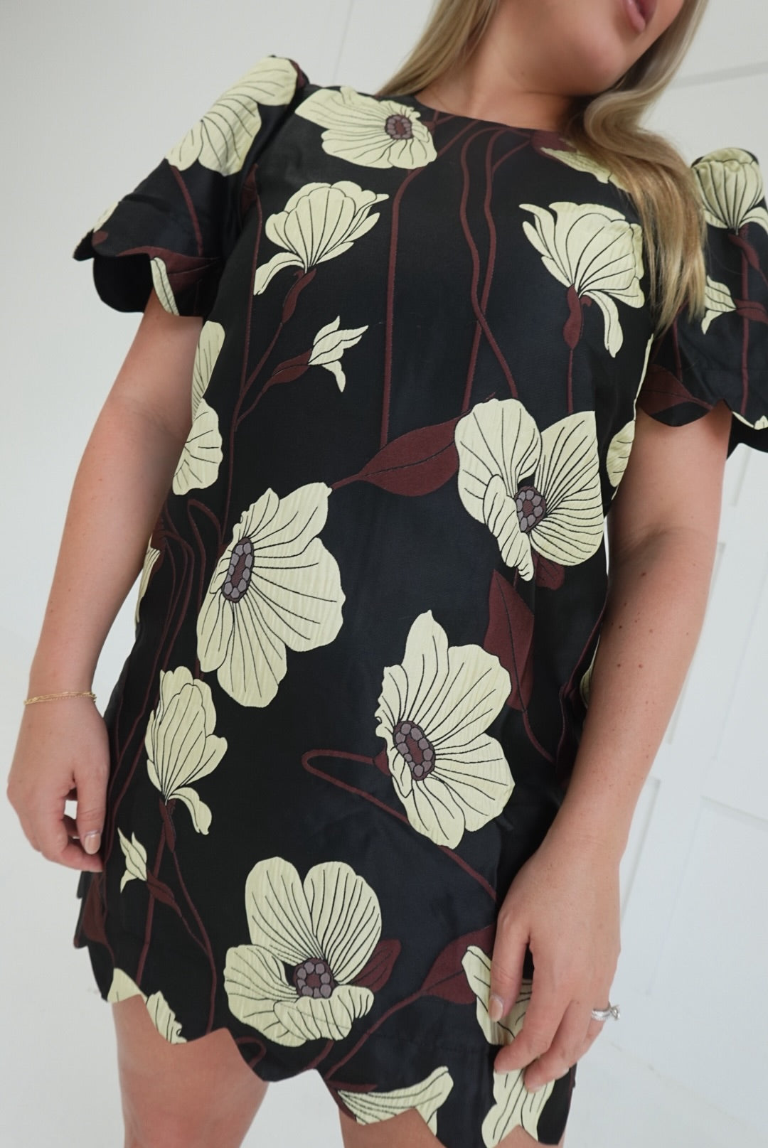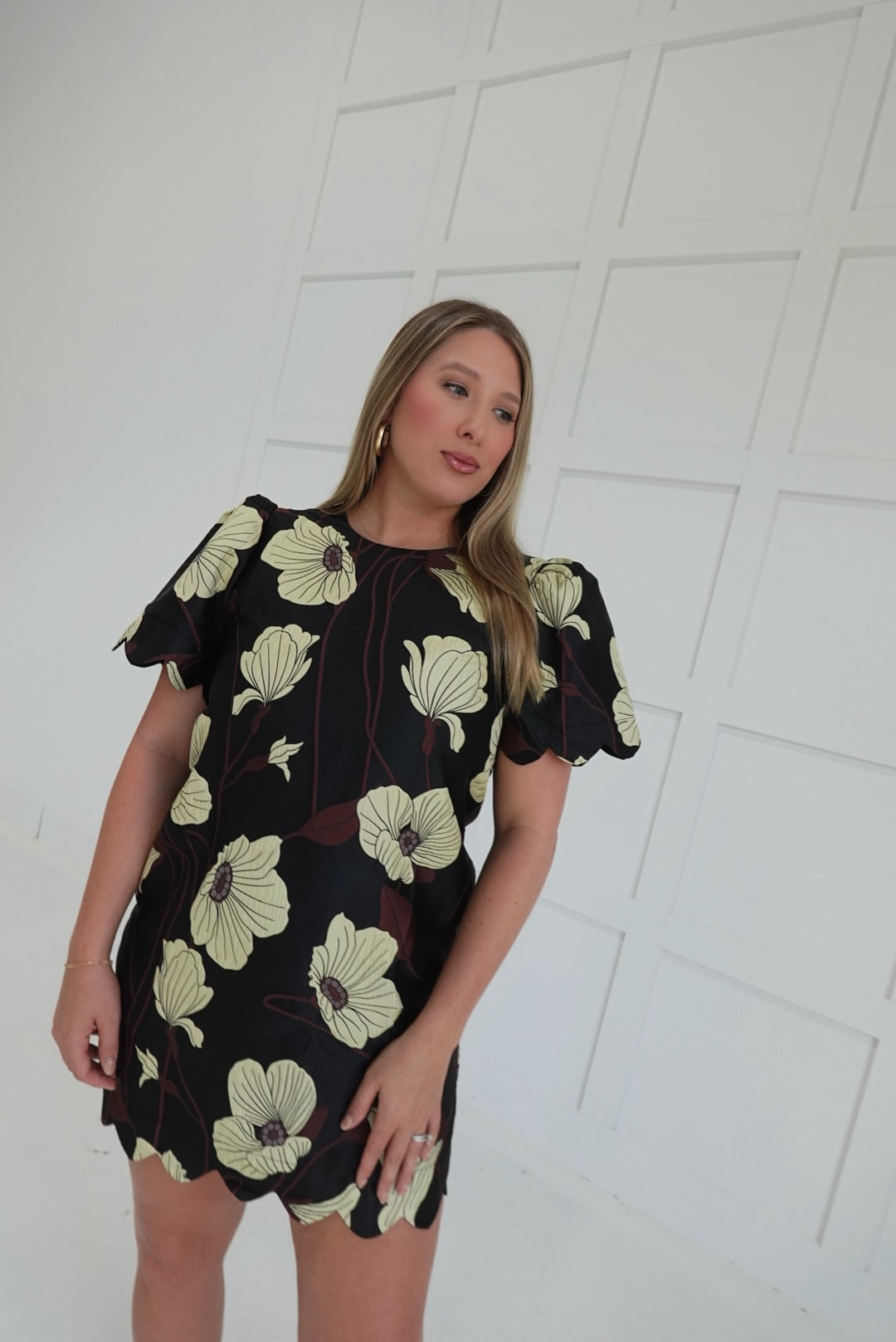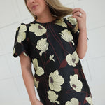 This Fall Blooms Mini Dress combines delicate floral jacquard fabric with a flattering scallop hem for a touch of elegance. Featuring a back zipper for easy wear, side pockets for convenience, and a fully lined, lightweight woven design, it offers comfort without compromising style. Perfect for those who appreciate both practicality and feminine details.