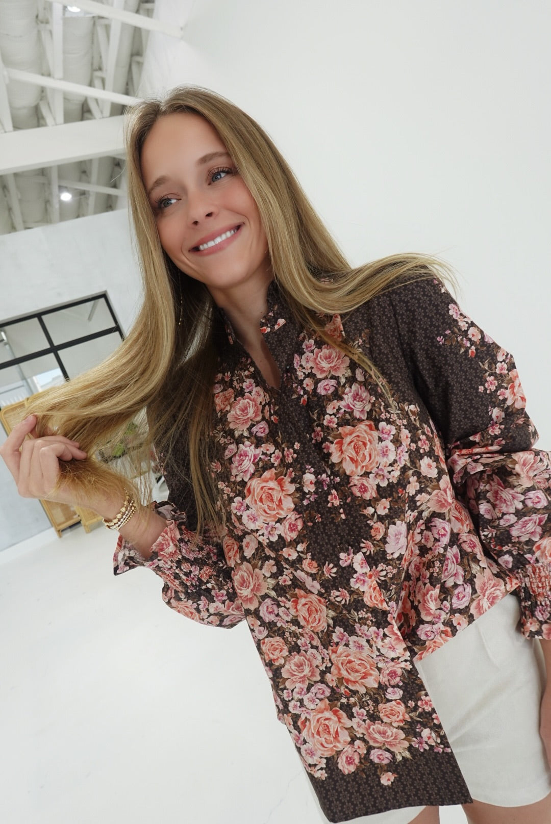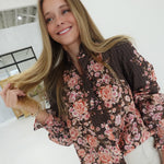 The Fall For Your Rose Top features a charming ruffled mandarin collar and a front button closure for easy wear. Its delicate design adds a touch of elegance to your everyday wardrobe, offering both comfort and style as the seasons change. Perfect for layering or wearing on its own, this top supports your effortless fall look.