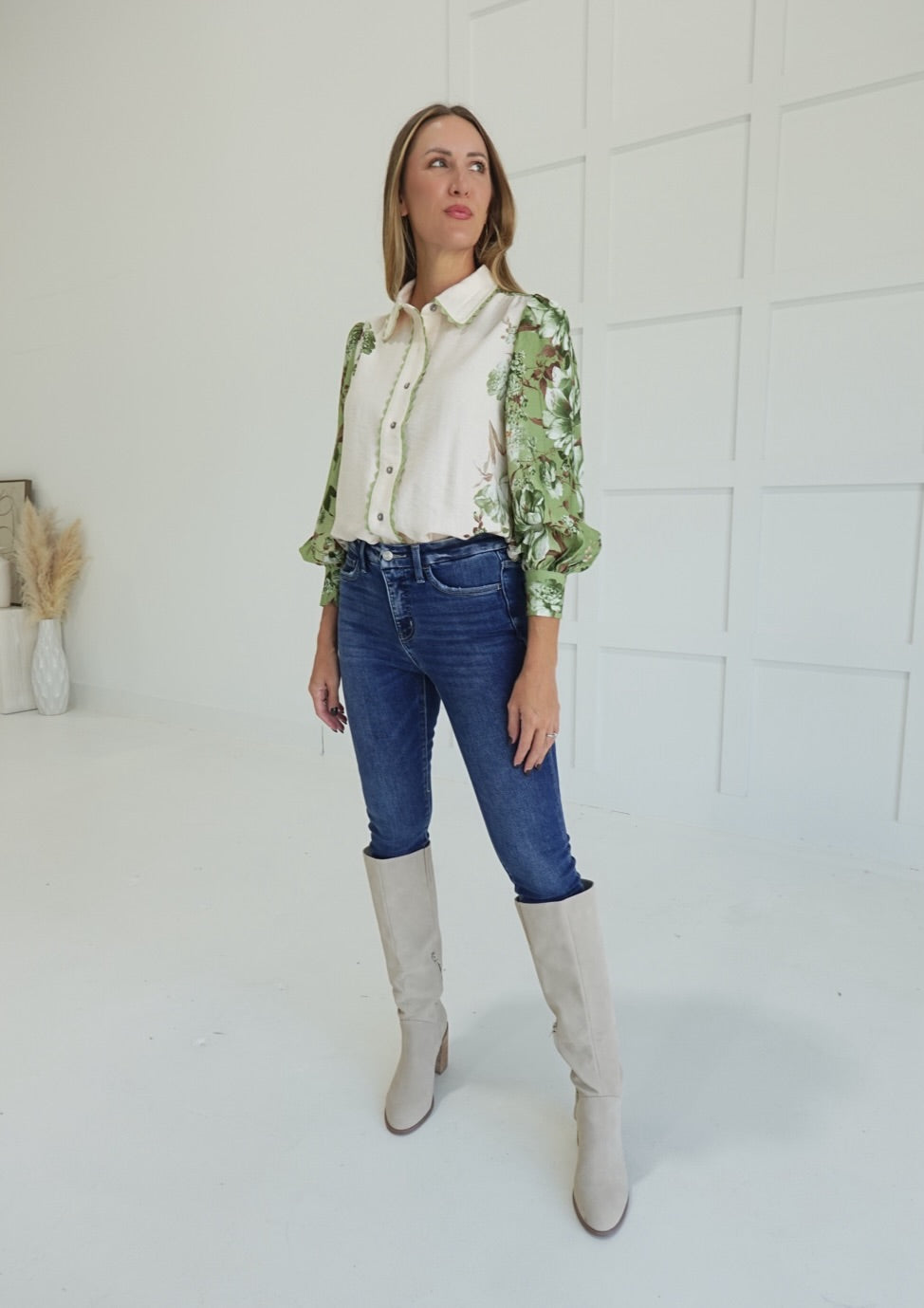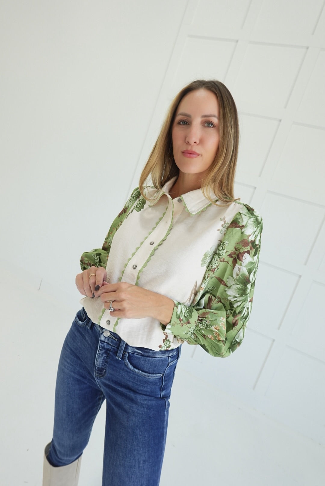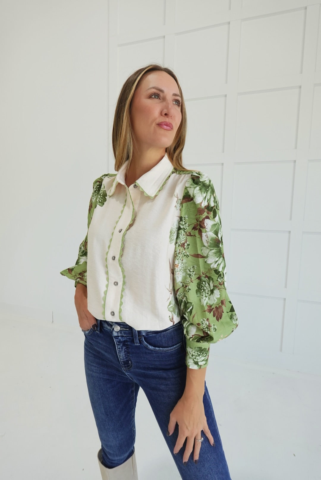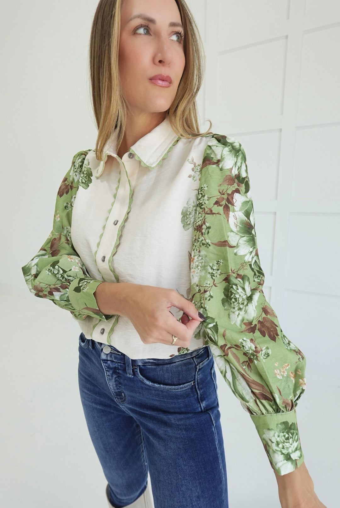 This lightweight, woven blouse features a delicate floral print and long sleeves for comfortable coverage. The scallop trim along the collar and button placket adds subtle charm, while its unlined construction ensures breathable wear throughout the day. Perfect for layering or on its own, the Fall My Way Blouse brings effortless style with a soft, supportive fit.