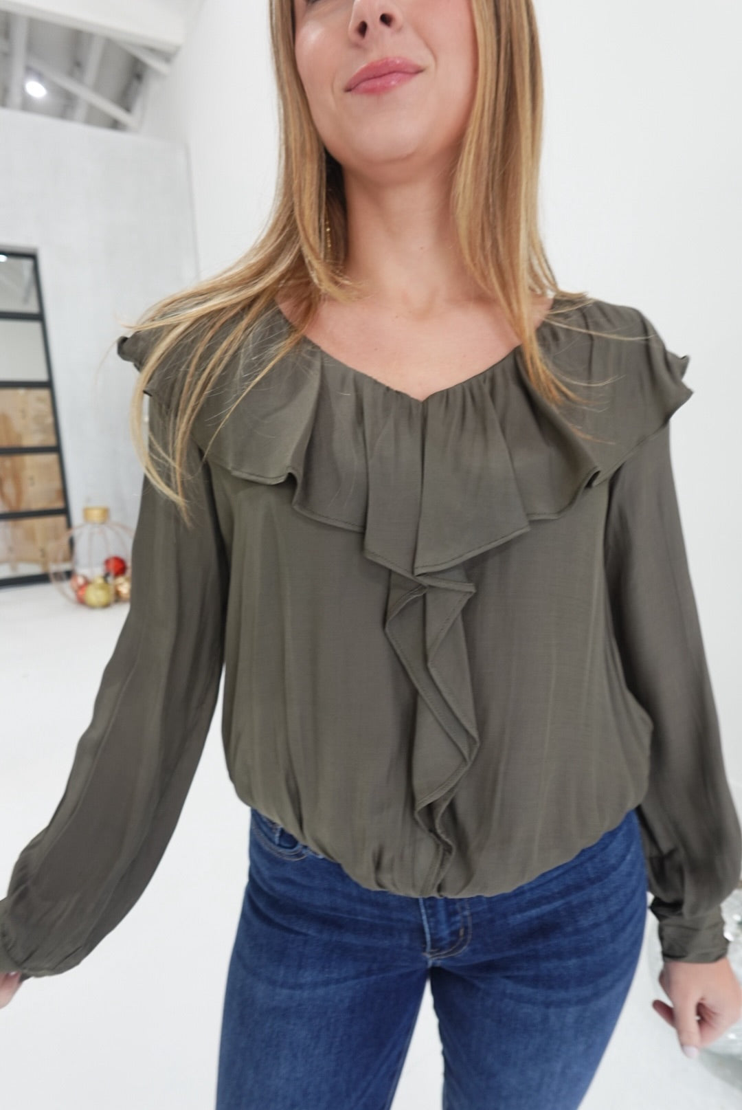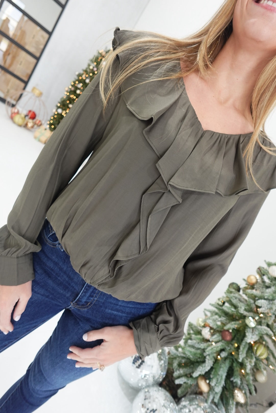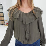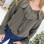 - Ruffle Shoulder Blouse With Cascading Center Ruffle