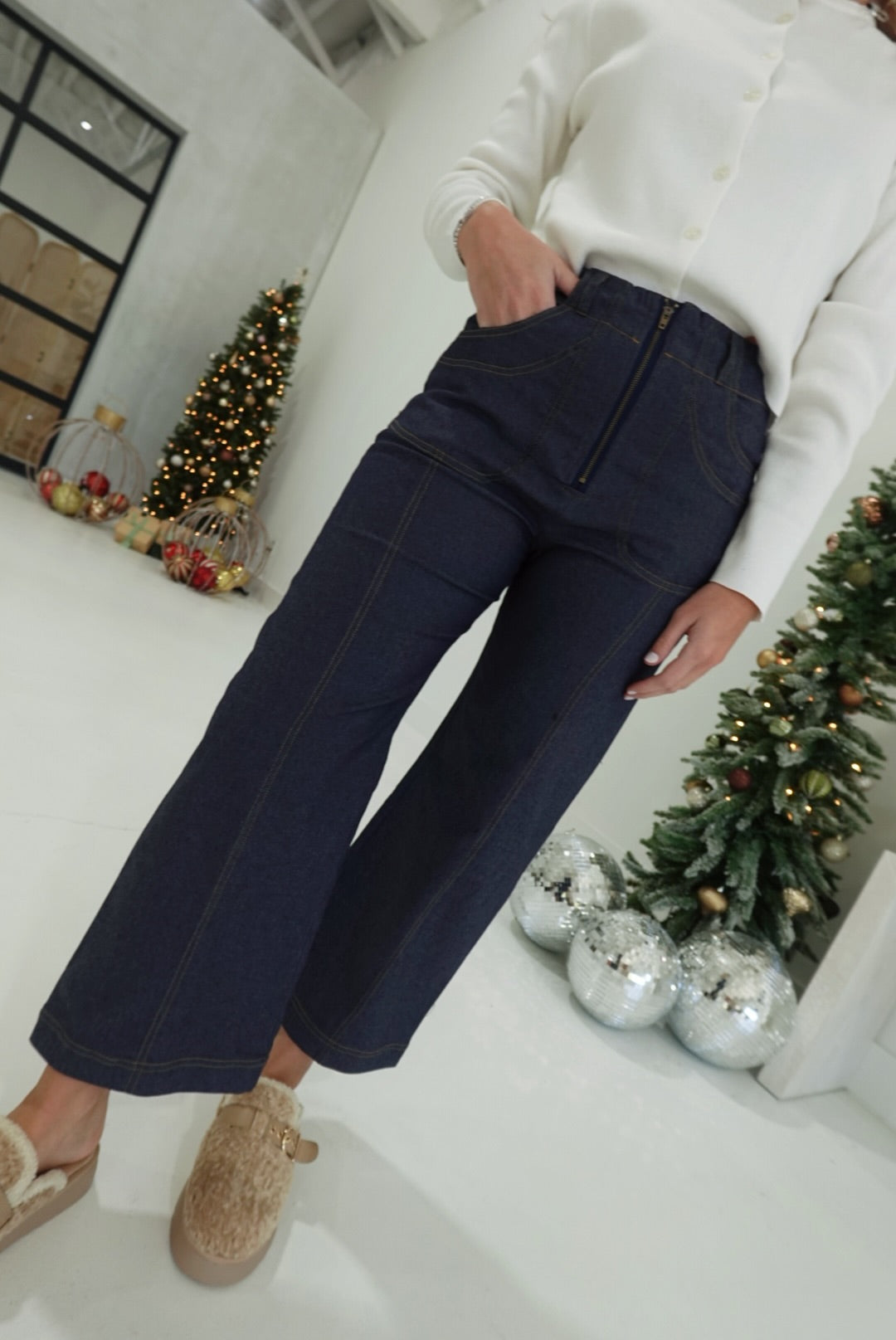 - Denim-Like Pants with Contrast Stitching + Exposed Zipper Closure