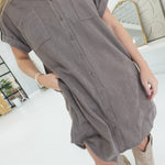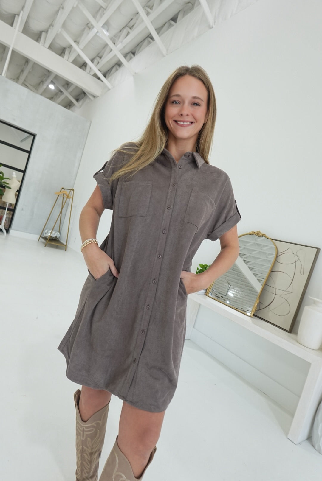 The Fall Plea Mini Dress combines cozy suede texture with a relaxed drop shoulder design for effortless style. Its button-up front adds versatile layering options, making it perfect for cooler days. This dress balances comfort and chic, ideal for anyone seeking a stylish yet easy-to-wear look this season.