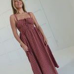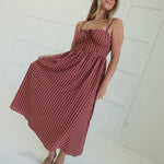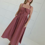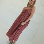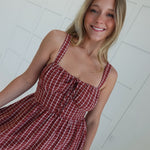 This sleeveless midi dress features a charming plaid pattern with a flattering corset-style front tie that enhances your silhouette. Its comfortable fit and classic design make it perfect for day-to-night wear, offering both style and ease. The brick color adds a warm, inviting touch to your wardrobe, making it a versatile choice for various occasions.